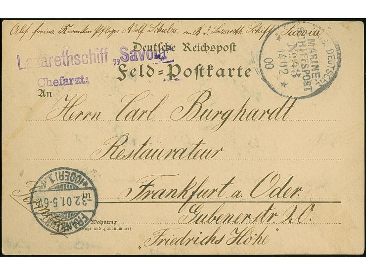 1900, Boxeraufstand, Feldpostkarte mi Gummistempel “Lazarethschiff 'Savola Chefarzt”, Absender Krankenpfleger Adolf Schulze Lazarettschiff Savola, befördert mit Marineschiffspost MSP No. 43 SMS FÜRST BISMARCK am 14.02.00, dazu jap. AK als Feldpost mit Abs.: Diakon u. Oberpfleger Kümmetz a. Bord Lazareth-Schiff Savola", befördert mit Marineschiffspost MSP, YOKOHAMA", am 25.1.01, selten