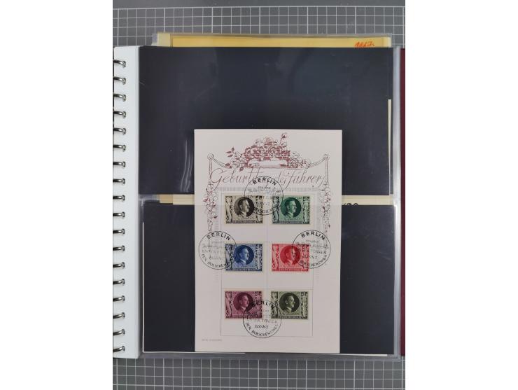 1933/45, Propaganda Album mit 52 Gedenkblättern, mit vielen besseren und großformatigen Stücken, insgesamt gute Erhaltung (4 St. mittig gefaltet, 2 St. Rand beschnitten) dazu noch 3 große Blätter mit Satzfrankaturen