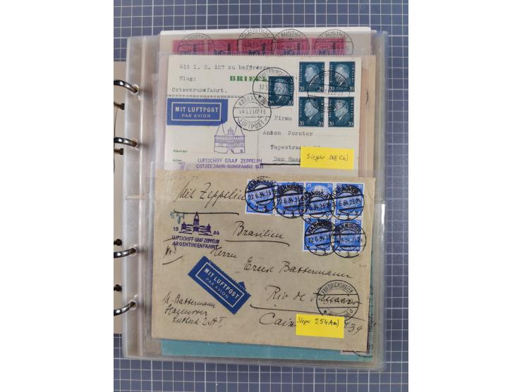 1903/80,  Album mit 128 Mehrfachfrankaturen mit mindestens vier Marken, meistens aber mit mehr Marken (48 St. Ausland) dabei auch bessere Ausgaben z. B. Zepp-Brief Argentinienfahrt 1934 mit 5 x 35 Pf. Hindenburg und Zeppelin- Englandfahrt 1930 mit 6 x 25 Pf. Hindenburg, etwas unterschiedliche Erhaltung
