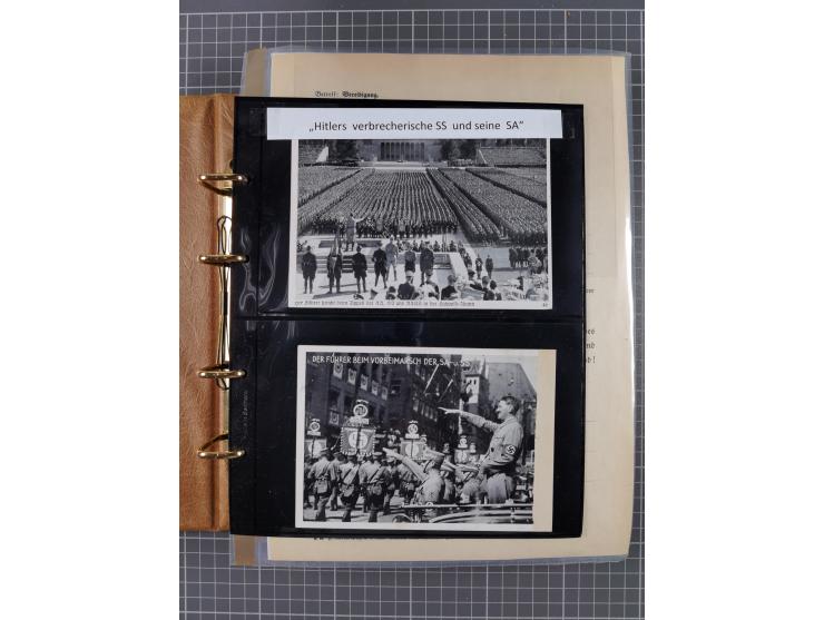 1933/45, Dokumentation zum Thema: Hitlers verbrecherische SS und seine SA", insgesamt 55 Belegstücke (33 x SS) mit besseren Propagandakarten interessanten Fotos, Bilder, Bildganzsachen und Dokumenten mit SS-Vereidigungsformular und 2 x KZ-Post (Auschwitz, Theresienstadt) sowie SS- und SA-Post, Höhepunkte sind eine gut erhaltene, rare und hochpreisige Broschüre Dich ruft die SS" hrsg. Reichs-führer SS mit Bewerbungsformular für die Waffen SS, 2 Broschüren, Volk und Rasse". Ehrenbroschüre zum 50. Geburtstag des Dichters Hans Johst, vorderseitig mit seinem Foto in der Uniform eines SS-Oberführers sowie eine seltene SA-Stammkarte mit Lichtbild