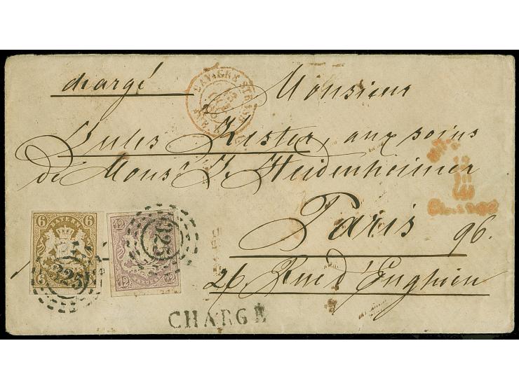 1867/68, Staatswappen 12 Kr. hellbraunviolett in Mischfrankatur mit 1868 6 Kr. ockerbraun, farbfrisch, voll- bis meist breitrandig geschnitten, sauber mit oMR “325” und nebengesetztem rotem Aufgabe-Stempel “MÜNCHEN 12 10 Charge” auf Charge-Brief nach Paris, eine seltene und attraktive Frankatur, sign. Schmitt BPP mit Fotoattest (1984)