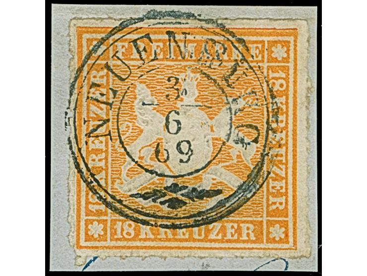 1865, Wappen 18 Kr. orange, farbfrisch und gut durchstochen, links winzig uneben, sauber mit fast zentrischem DKr. “NEUENBURG 3/6 69" auf kleinem Briefstück, tadellos, Fotoattest Thoma BPP (1987)
