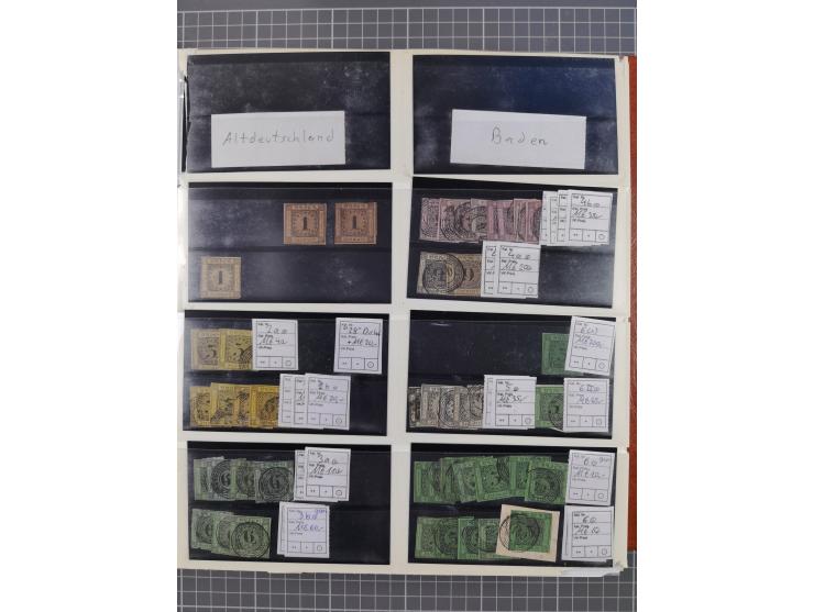 Baden bis Württemberg, meist ungebrauchter und gestempelter Bestand auf kleinen Steckkarten im Album, sauber sortiert in Mengen bis ca. 8x pro Sorte, zum Teil stark fehlerhafte Erhaltung