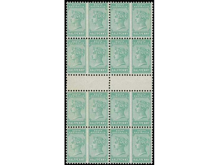 1883/99, ½ d. , coulor trial in green, 8 pairs, imperforated between, in gutter block (folded at gutter), mint never hinged, certificate Phil. Foundation