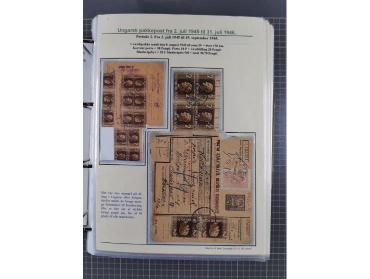 HYPERINFLATION: 1945/46, highly specialized Parcel Cards exhibit collection with around 80 items, showing a fine range of frankings and spanning periods 2 to 21 and 26-27, including interesting usages with Express mailing and Adópengö frankings, noted some of the scarcer periods with 10th (x5), 13th 8x3), 16th, 17th (x3, rate valid only 5 days), 19th (x3), 26th (x2) and 27th (x23), some better usages throughout with September 1945 scarce parcel card  for a 20 kg sending (2nd Period), etc.; a fine assembly in overall good condition, neatly mounted and expertly described in Danish, in one album