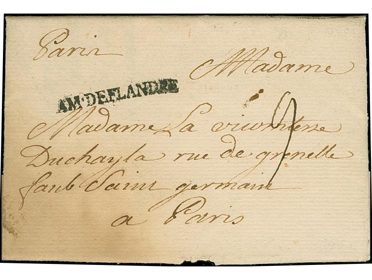 1749, "AM.DE.FLANDRE" clear straight-line on entire letter from Mons to Paris, rated with the single soldiers rate of "9" sols. Sent 5 days after the evacuation of French troops after the Treaty of Aix La Chapelle, ending the war of Austrian succession.