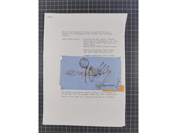 1847/59, 3 letters: 30 Nov. 1847 to Paris, rated “1/9” d., framed “LISBON” and “COLONIES/&C ART.13”, Calais transit and London cds.; 1859 letter to Genoa, rated “1/9” d., straight-line “LISBON”, circular “GB/1F”, Calais transit cds., also 1861 letter to Paris, posted after closure of the Consular P.O. but carried by Peninsular Mail Packet with Lisbon cds., on described pages