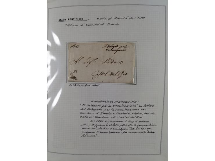 ITALIEN: 1807/1866, Sammlung mit 42 Briefen und Dokumenten, angefangen mit zwei Briefen aus 1807 mit “Il Delegato per la Vaccinazione”, später Italien Portomarke Mi.-Nr. P1 (unentwertet) auf Brief, sehr interessant, sauber beschrieben im Album