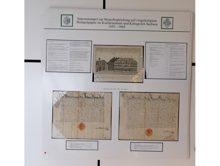 1683/1868, 'Impoststempel zur Steuerbegleichung auf vorgefertigtem Stempelpapier', einzigartige Ausstellungssammlung mit über 50 meist frühen Dokumenten und Briefen, beginnend mit den seltenen ersten Stempelpapieren ohne Wertbezeichnung, aufgezogen auf großen Tafeln (ca. 1x1m), dazu ‘Handbuch und Katalog der Sächsischen Philatelie’ mit u.a. katalogisierung und Bewertung von Stempelpapier.