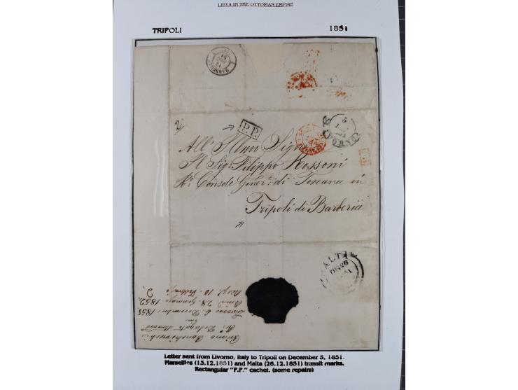 1851/1912, delightful exhibit collection with 37 covers and cards, covering the Ottoman, Italian and French Offices in Tripoli including the consular postal services, many better usages with 1851 entire letter from Livorno via Marseilles and Malta to Tripoli de Barberia, 1881 envelope from “TRIPOLI DI BARBERIA” to Livorno with Italian Levant 5c. and 10 c. (x2) tied by mute “annulo a rombi”, official envelope headed “R. CONSOLATO D´ITALIA”  and on reverse its large seal handstamp, 1893 envelope to Constantinople with French Sage adhesives with pearled cds “TRIPOLI BARBARIE 14 FEVR 93” in mixed franking with Turkey 1 pi. adhesive (opened for display), etc.; except for the occasional fault in overall very good condition. An alluring specialist assembly, neatly mounted and described on album pages
