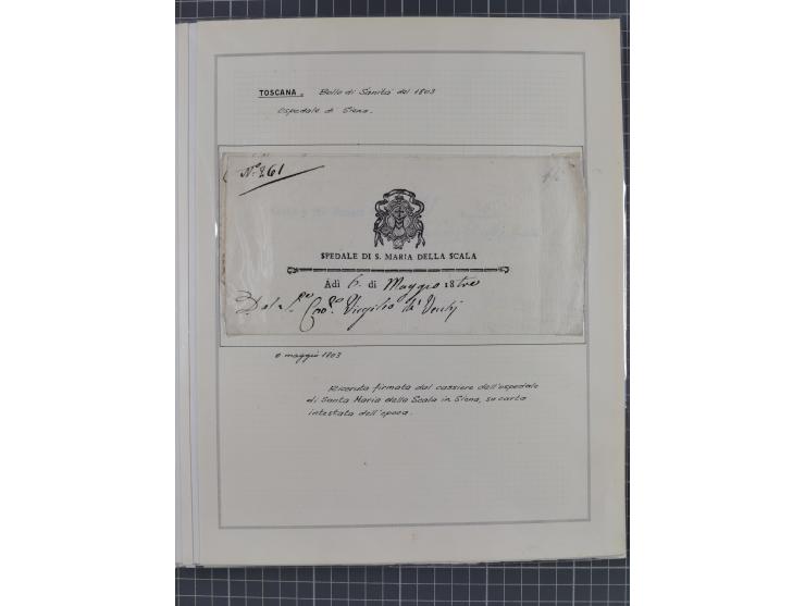 TOSKANA: 1803/1893, 17 Briefe und Dokumente aus dem 19. Jahrhundert inkl. Ra2 "LAZZERETTO SAN / ROCCO DI LIVORNO” der Quarantänestation, Incoming Mail aus Frankreich 1832 + 1884 und aus den USA per Steamer 1855, sauber beschrieben im Album