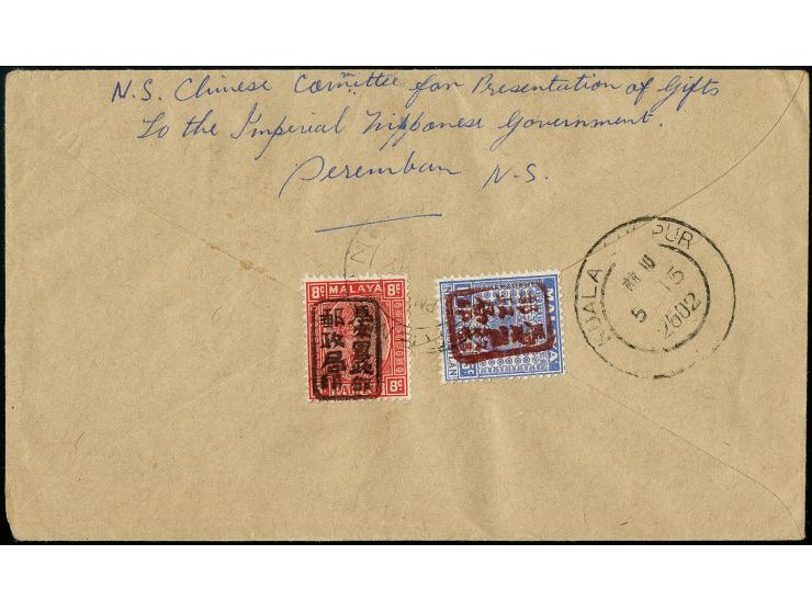 15c. ultramarine with additional franking tied by cds. "SEREMBAHN 14 MY 1942" to reverse of censored registered cover to Kuala Lumpur with receiving mark, fine, signeds Rowell