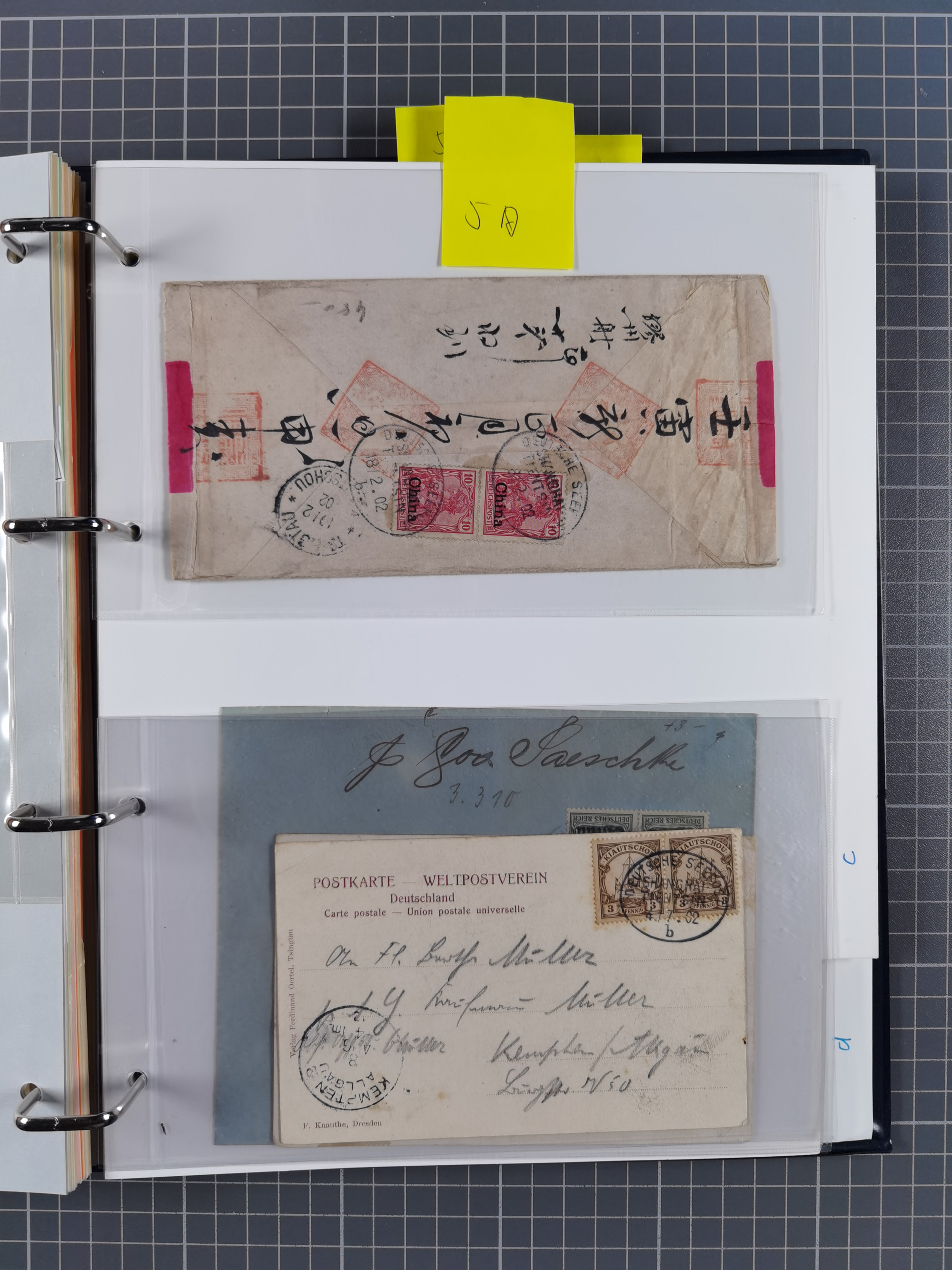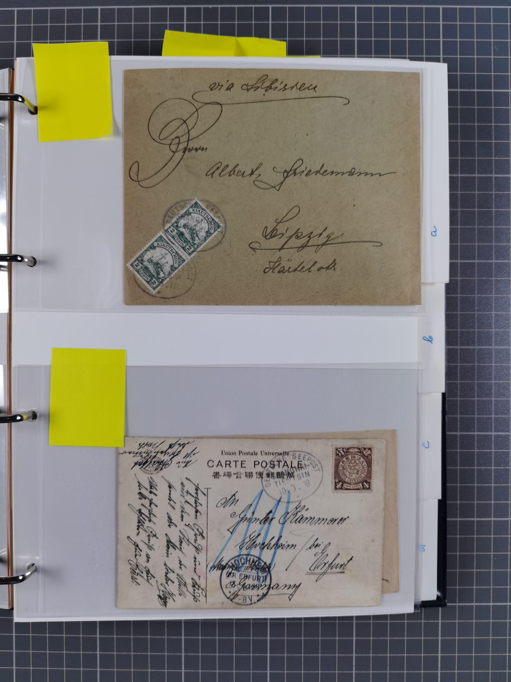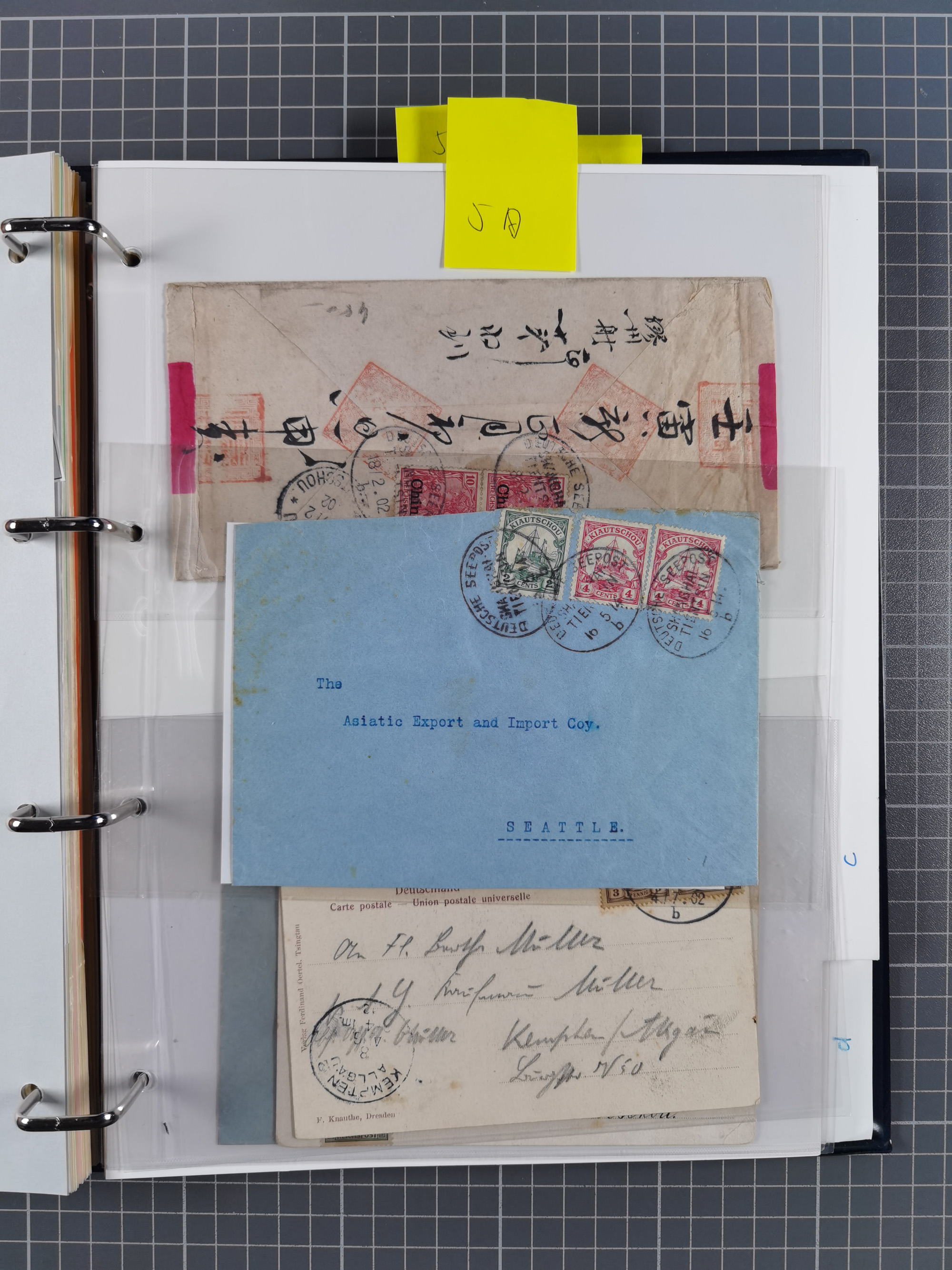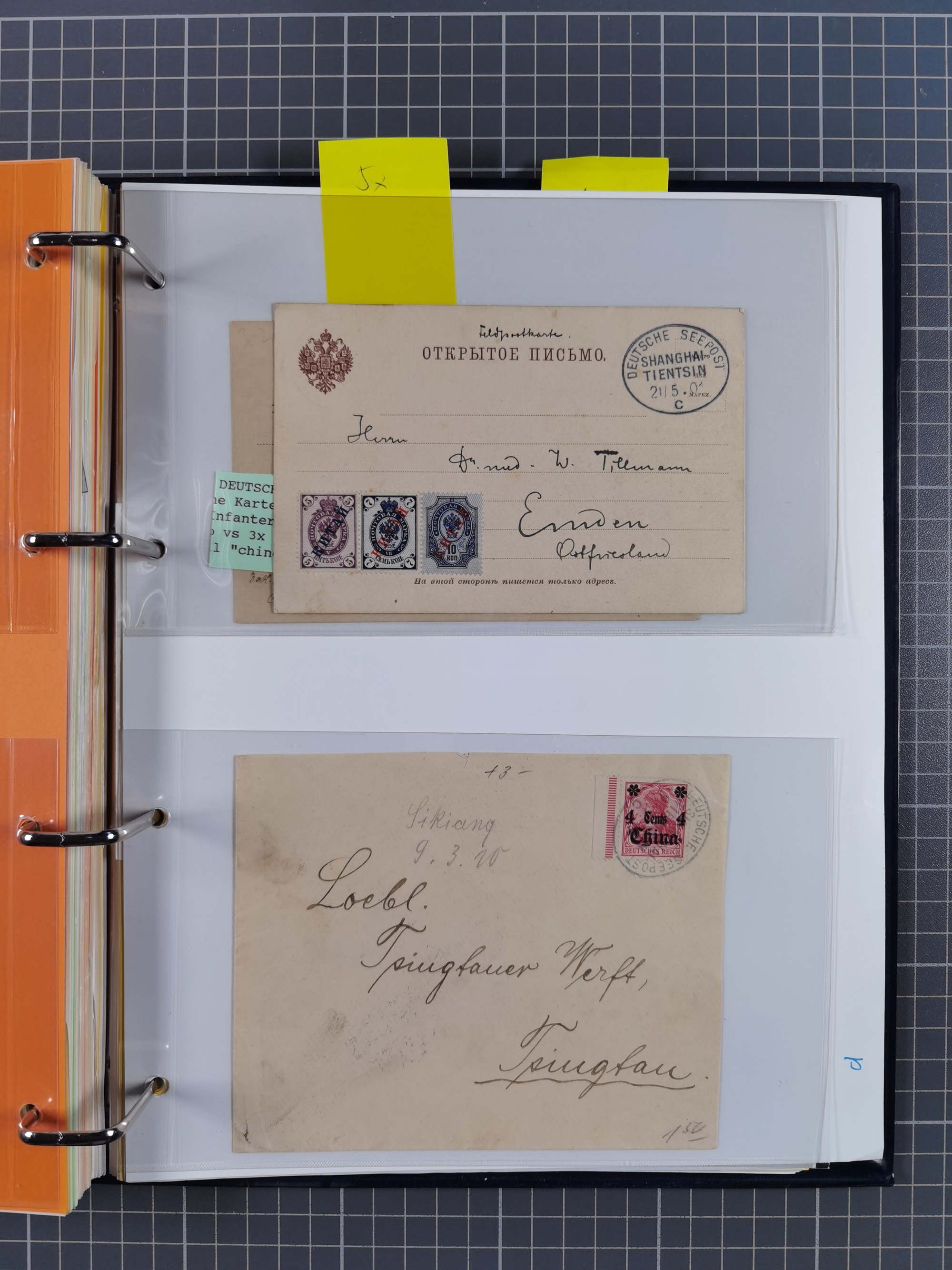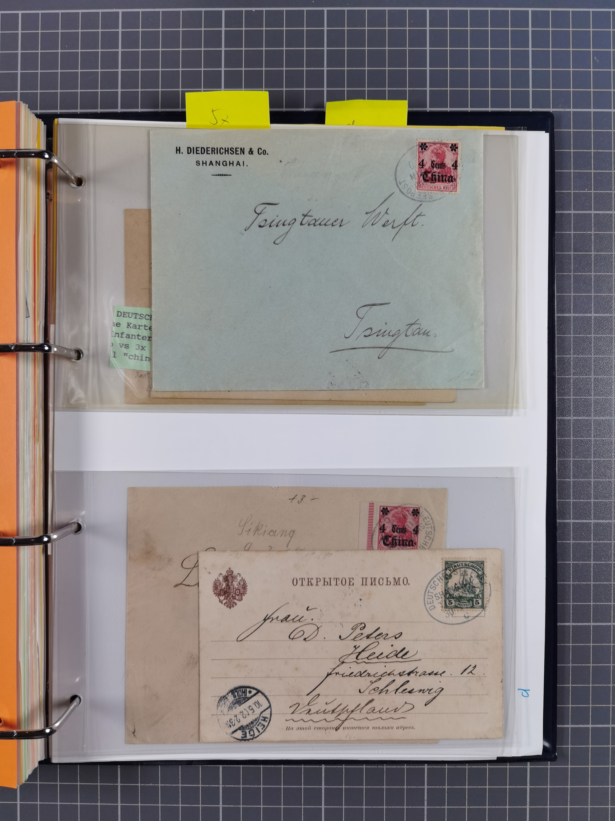 China und Kiautschou, interessante Sammlung “DSP SHANGHAI-TIENTSIN” mit 19 Briefen, Karten und GSK, meist aus dem Bedarf, dabei u.a. UB “b” (5x), UB “c” (5x) und einmal Brief mit UB “d” an das Auswärtige Amt in Berlin mit Verschlussmarke der Botschaft in Paris und rückseitigem Text als Irrläufer (doppelt signiert Kilian BPP). Dazu vier Belege mit Schiffspost-Stempel “YANGTSEE-LINIE" (2x ”a" als Blanko-Abschläge bzw. auf GSK ohne Text und 2x “d” auf Bedarfskarte bzw. Drucksachenumschlag) sowie Forschungsarbeiten mit vielen Daten, Fotokopien und Texten, ex Steinmeyer