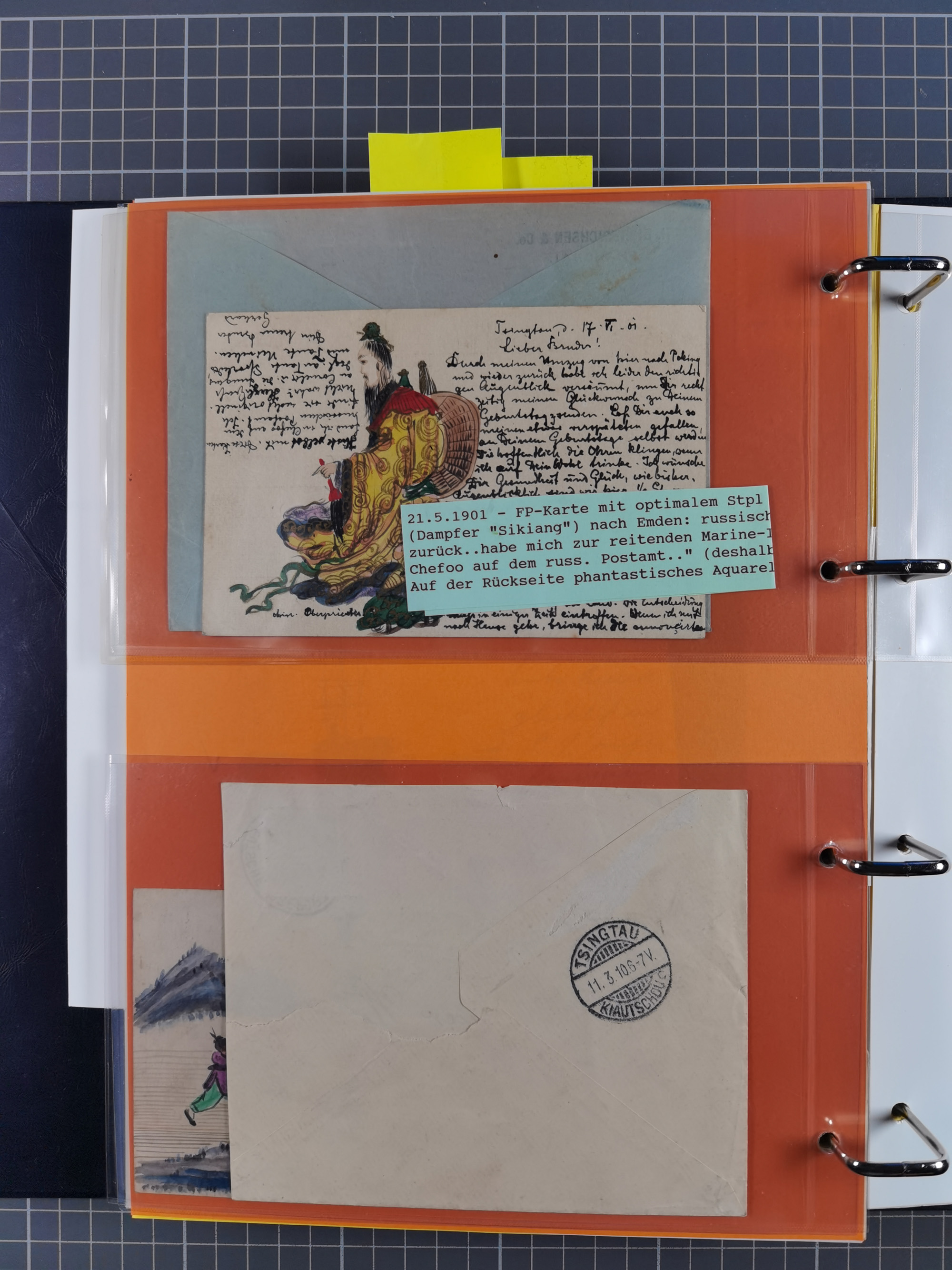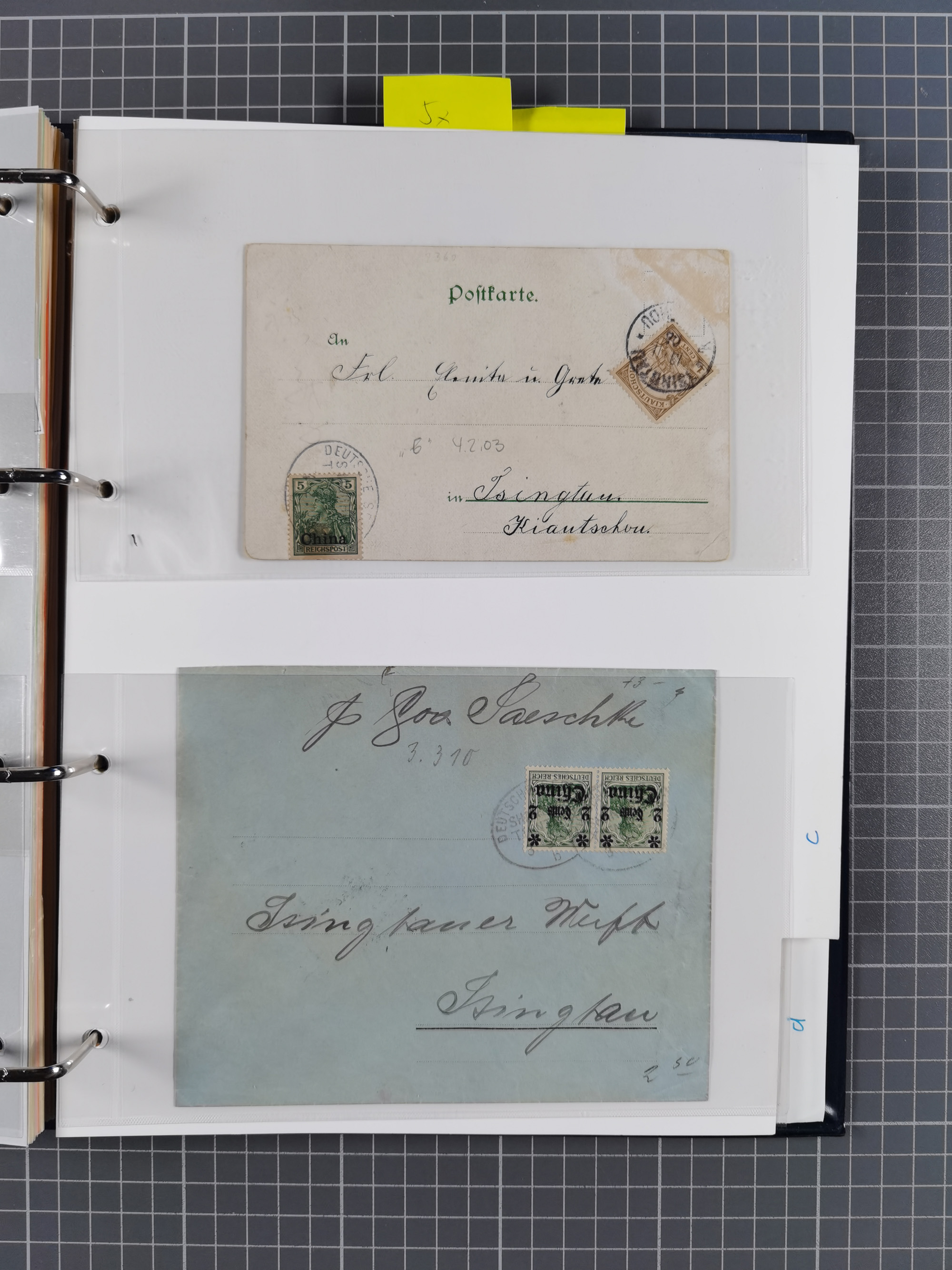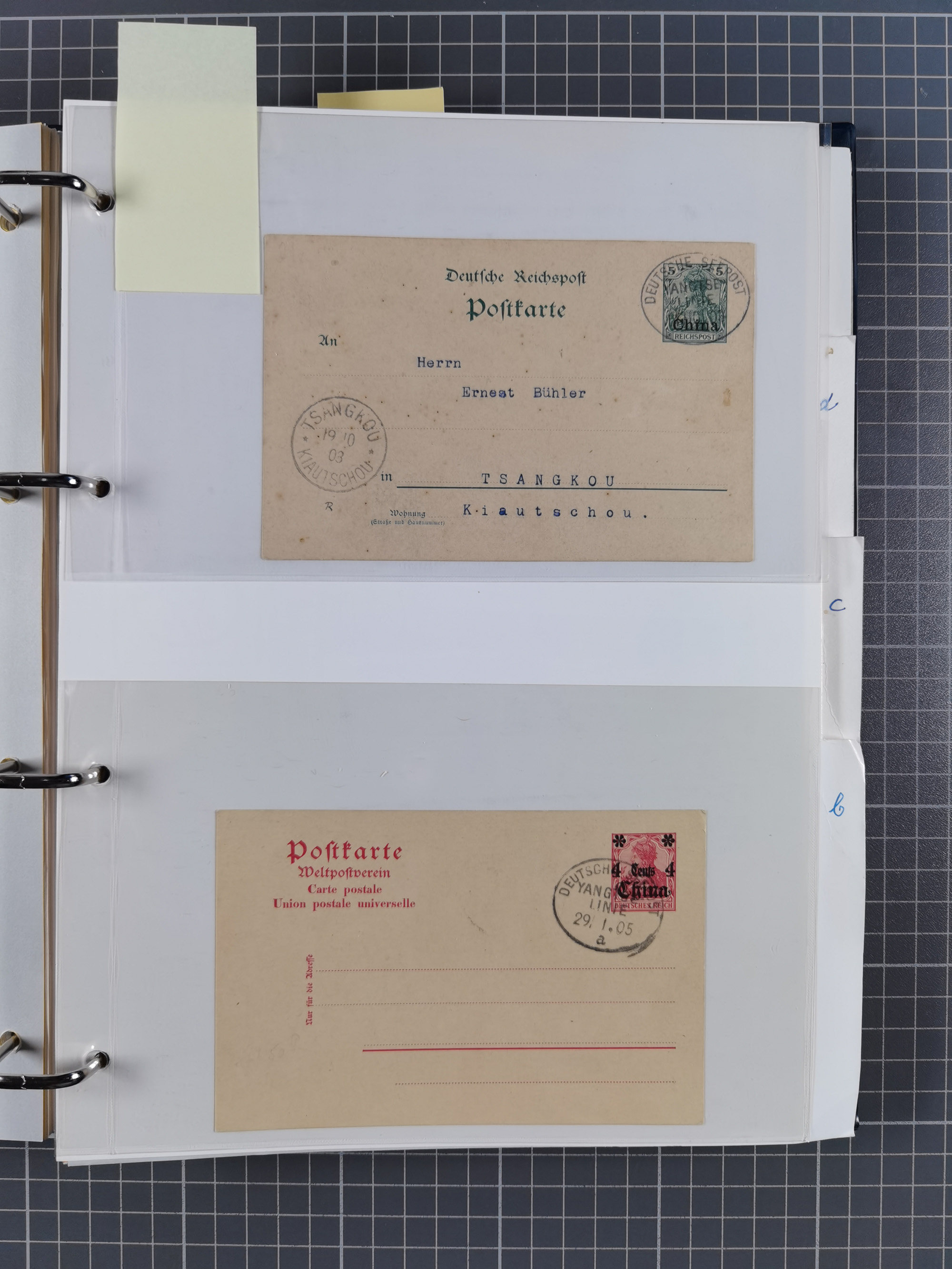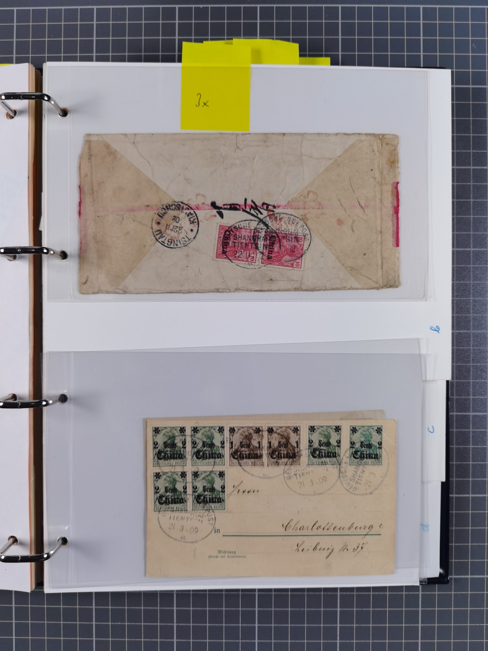 China und Kiautschou, interessante Sammlung “DSP SHANGHAI-TIENTSIN” mit 19 Briefen, Karten und GSK, meist aus dem Bedarf, dabei u.a. UB “b” (5x), UB “c” (5x) und einmal Brief mit UB “d” an das Auswärtige Amt in Berlin mit Verschlussmarke der Botschaft in Paris und rückseitigem Text als Irrläufer (doppelt signiert Kilian BPP). Dazu vier Belege mit Schiffspost-Stempel “YANGTSEE-LINIE" (2x ”a" als Blanko-Abschläge bzw. auf GSK ohne Text und 2x “d” auf Bedarfskarte bzw. Drucksachenumschlag) sowie Forschungsarbeiten mit vielen Daten, Fotokopien und Texten, ex Steinmeyer