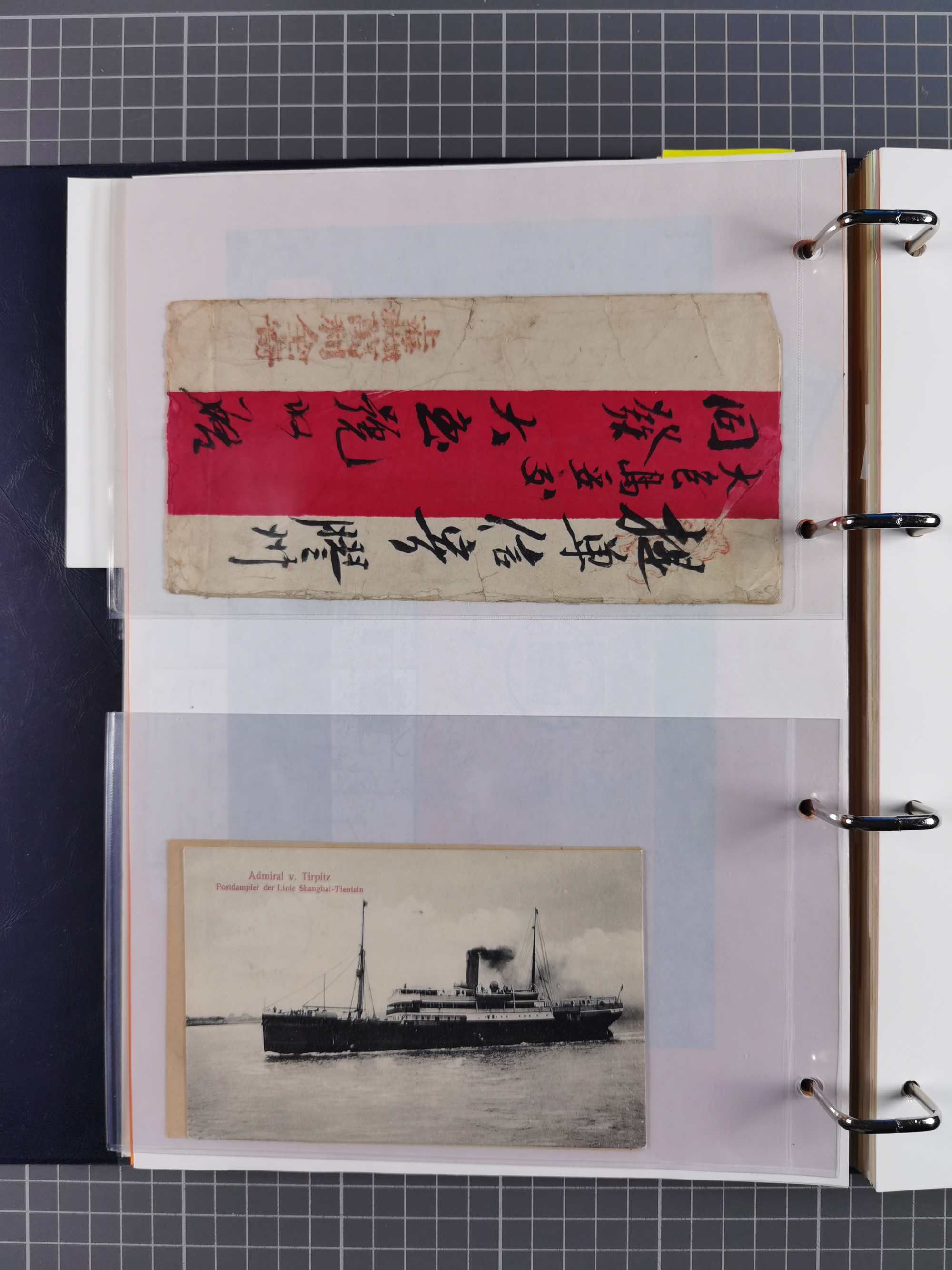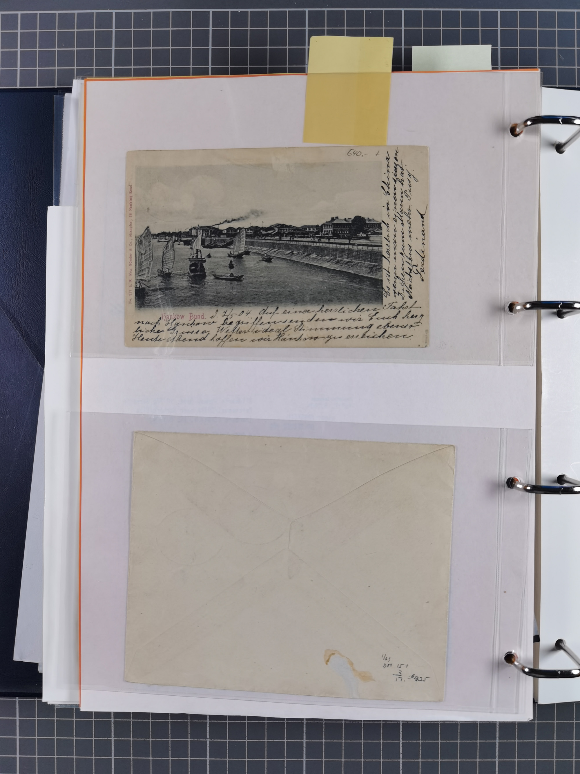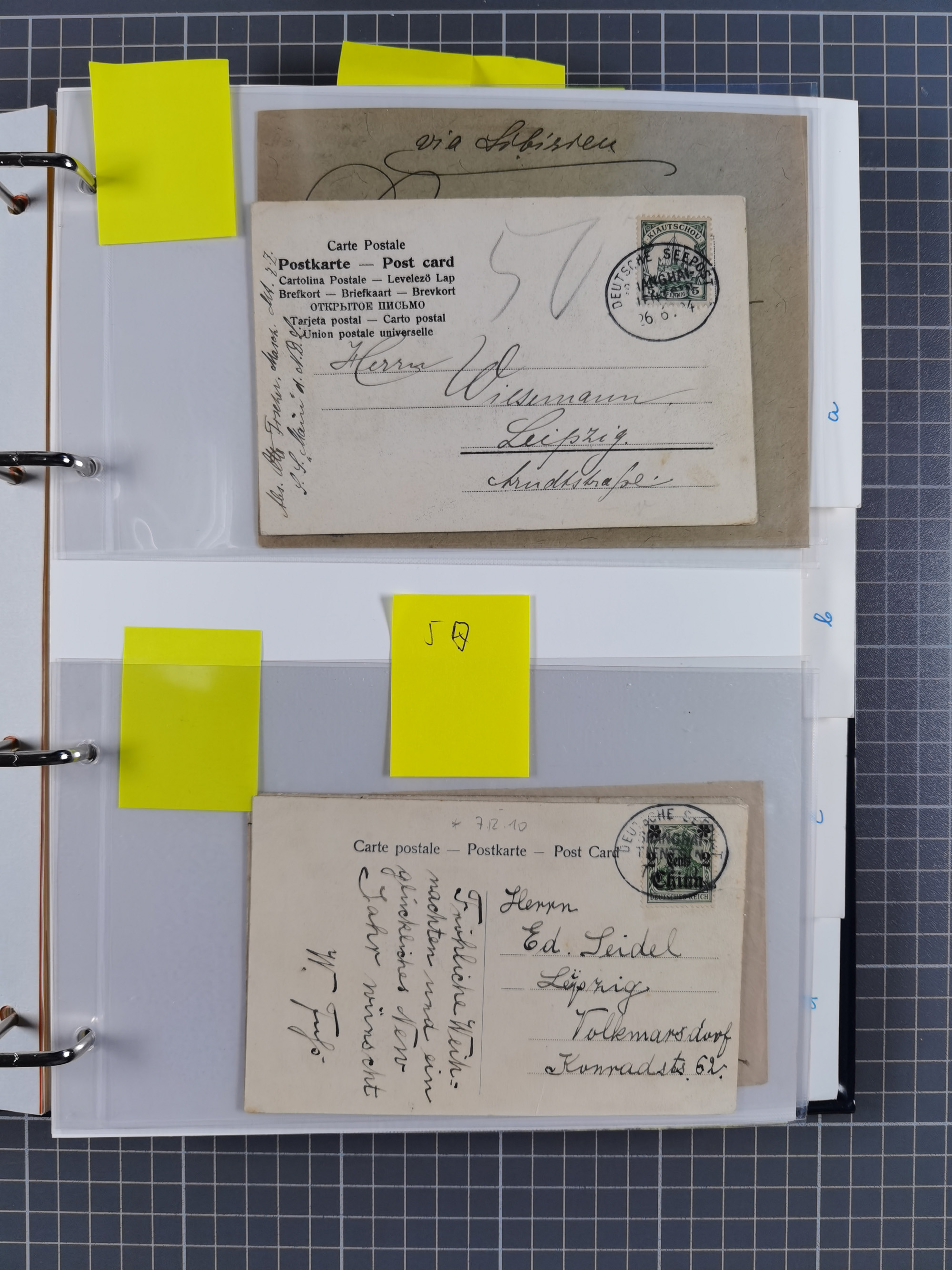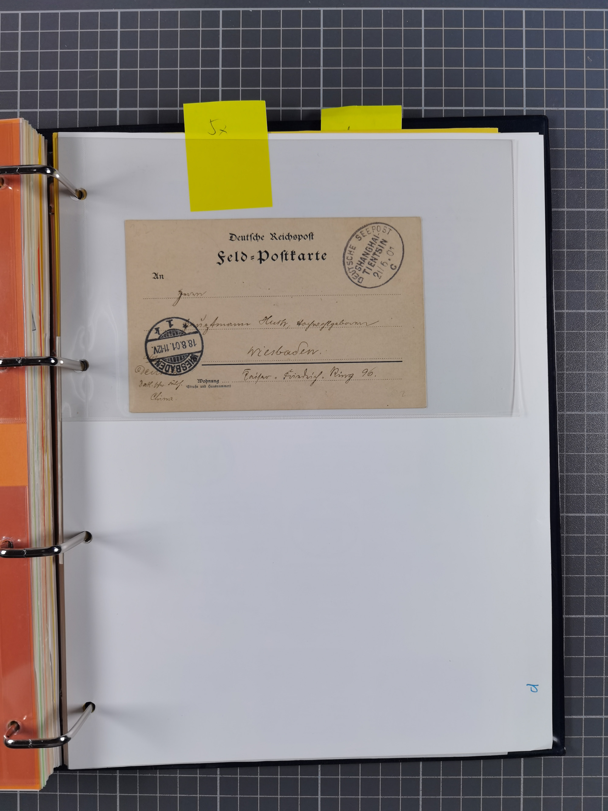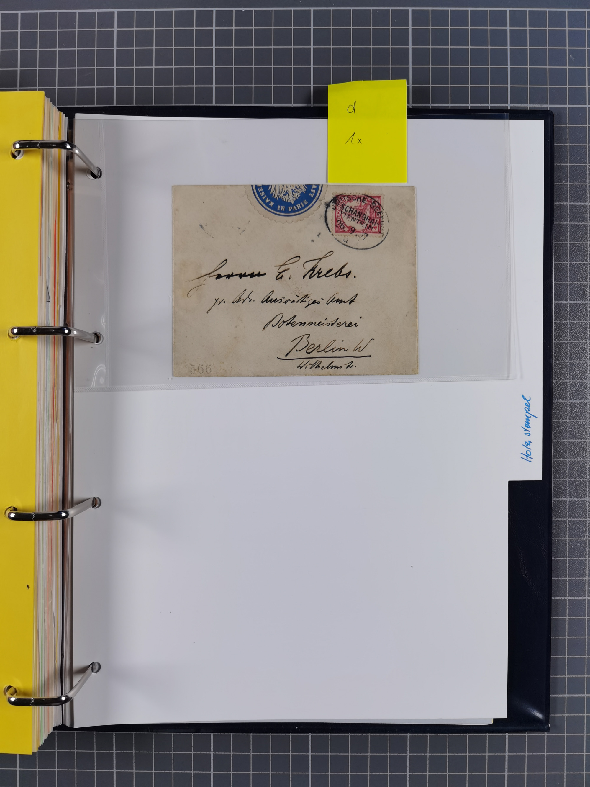China und Kiautschou, interessante Sammlung “DSP SHANGHAI-TIENTSIN” mit 19 Briefen, Karten und GSK, meist aus dem Bedarf, dabei u.a. UB “b” (5x), UB “c” (5x) und einmal Brief mit UB “d” an das Auswärtige Amt in Berlin mit Verschlussmarke der Botschaft in Paris und rückseitigem Text als Irrläufer (doppelt signiert Kilian BPP). Dazu vier Belege mit Schiffspost-Stempel “YANGTSEE-LINIE" (2x ”a" als Blanko-Abschläge bzw. auf GSK ohne Text und 2x “d” auf Bedarfskarte bzw. Drucksachenumschlag) sowie Forschungsarbeiten mit vielen Daten, Fotokopien und Texten, ex Steinmeyer