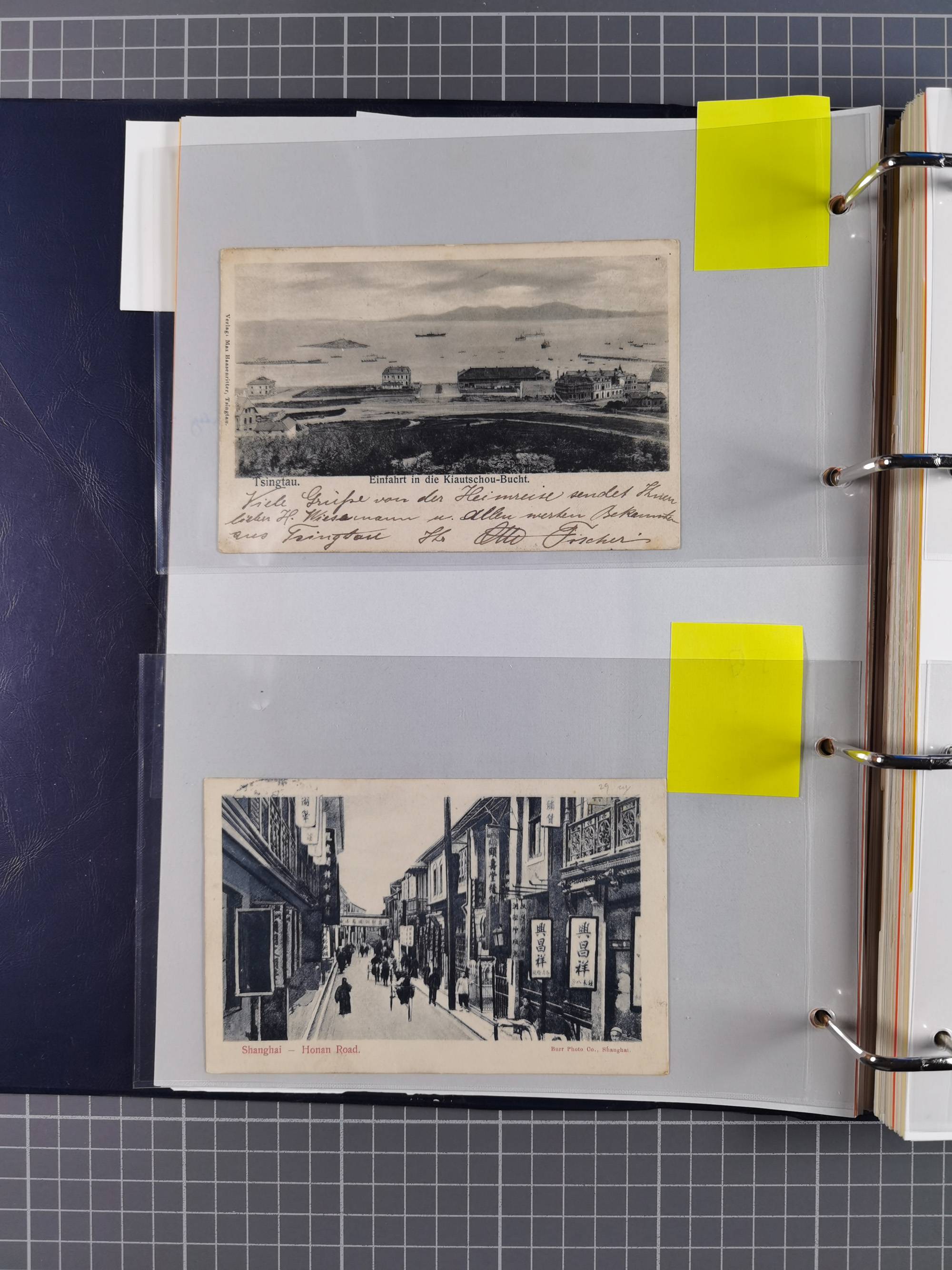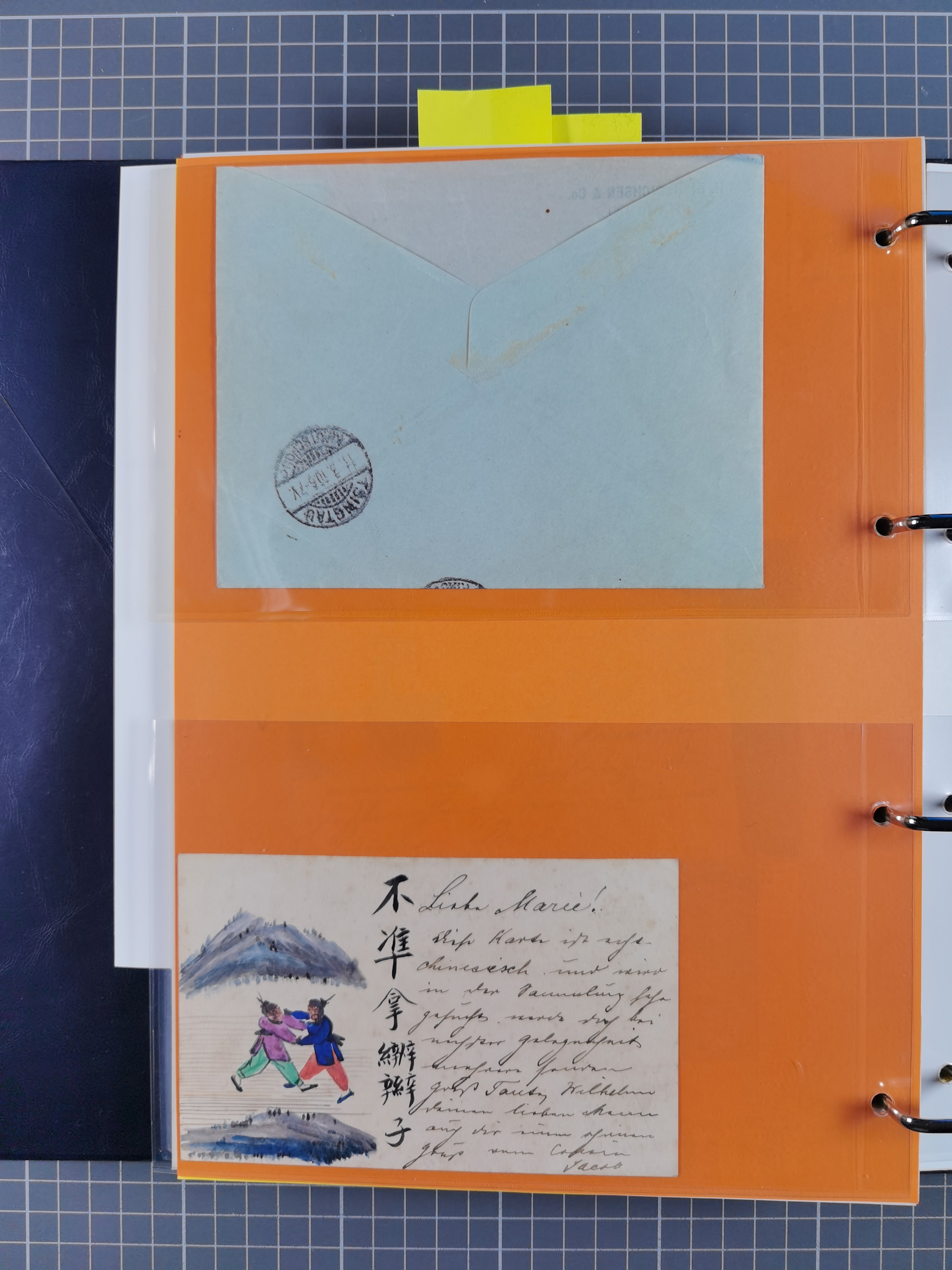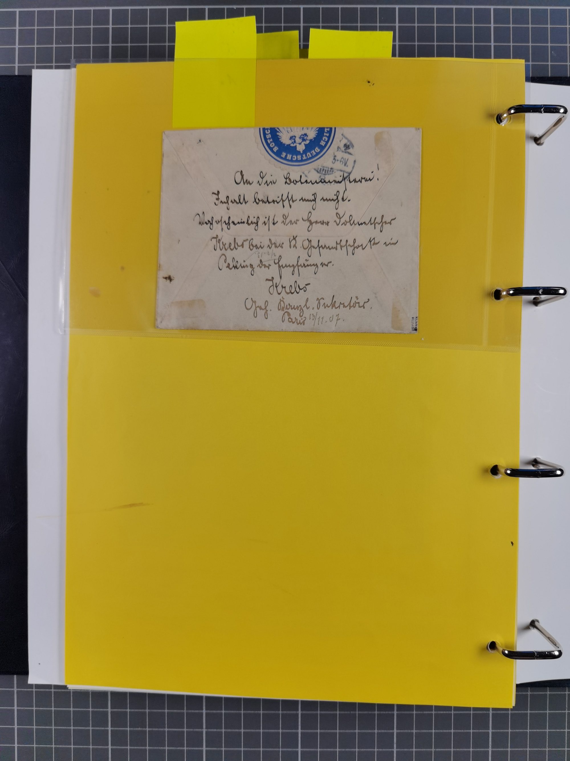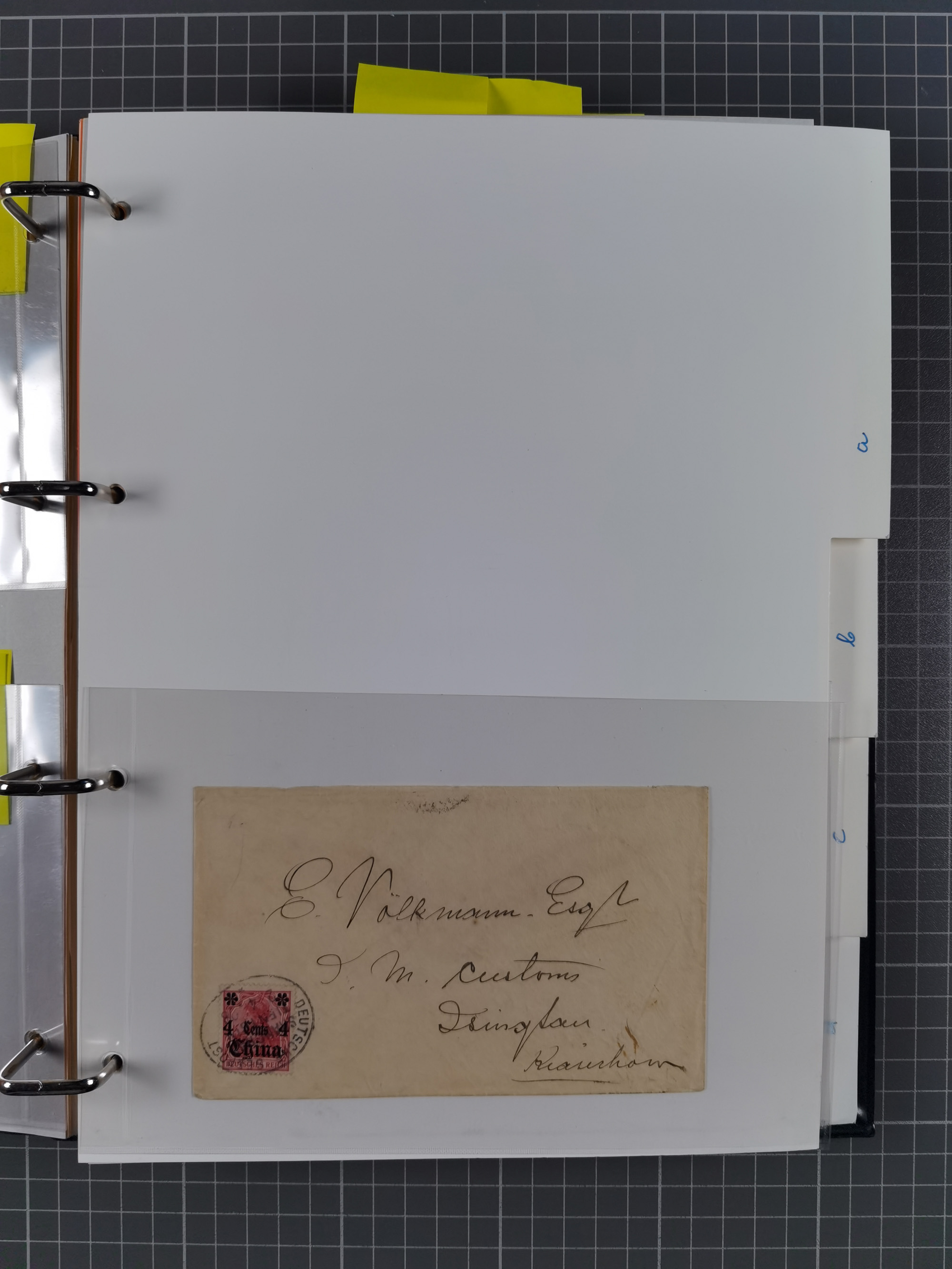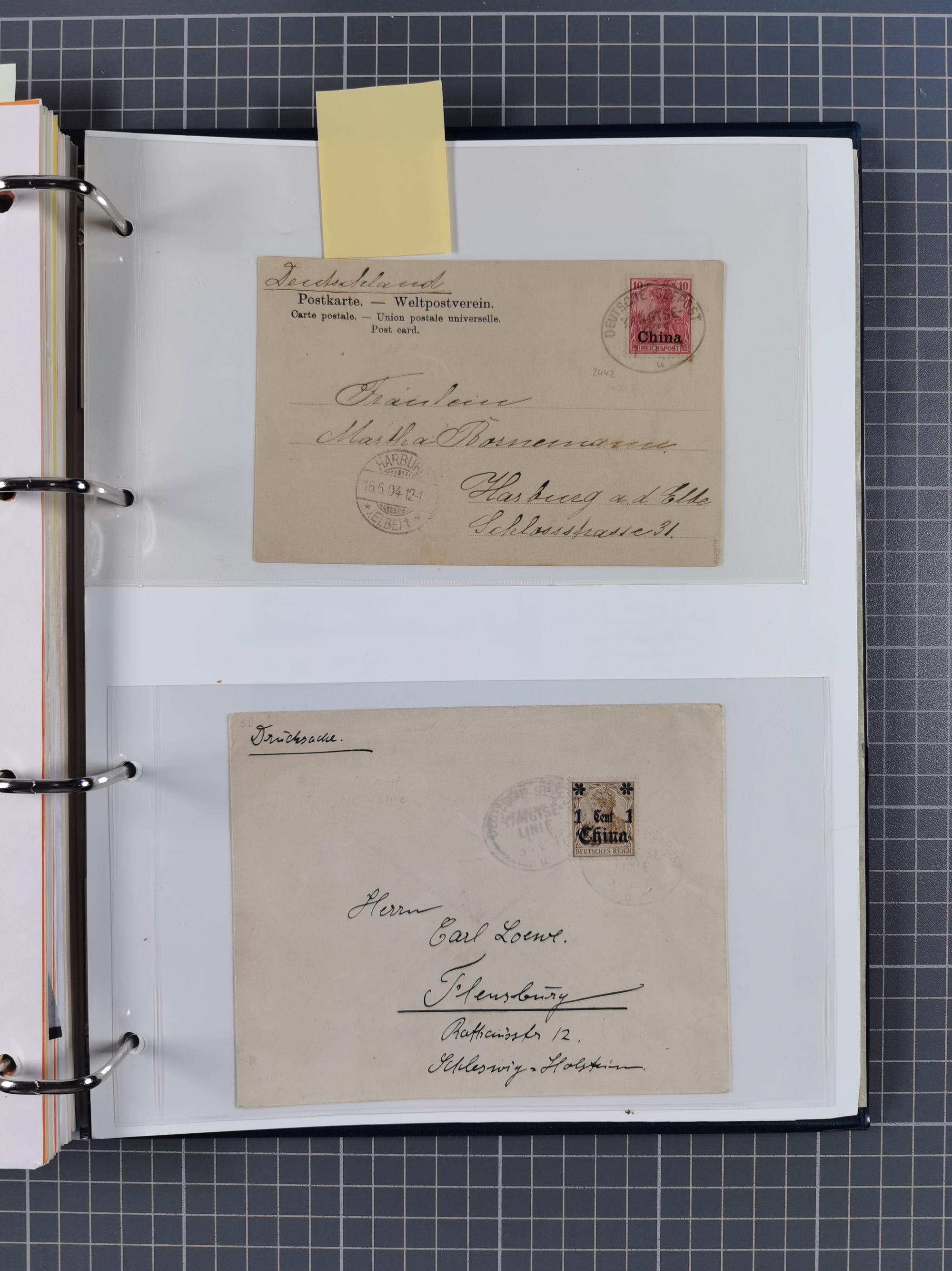 China und Kiautschou, interessante Sammlung “DSP SHANGHAI-TIENTSIN” mit 19 Briefen, Karten und GSK, meist aus dem Bedarf, dabei u.a. UB “b” (5x), UB “c” (5x) und einmal Brief mit UB “d” an das Auswärtige Amt in Berlin mit Verschlussmarke der Botschaft in Paris und rückseitigem Text als Irrläufer (doppelt signiert Kilian BPP). Dazu vier Belege mit Schiffspost-Stempel “YANGTSEE-LINIE" (2x ”a" als Blanko-Abschläge bzw. auf GSK ohne Text und 2x “d” auf Bedarfskarte bzw. Drucksachenumschlag) sowie Forschungsarbeiten mit vielen Daten, Fotokopien und Texten, ex Steinmeyer