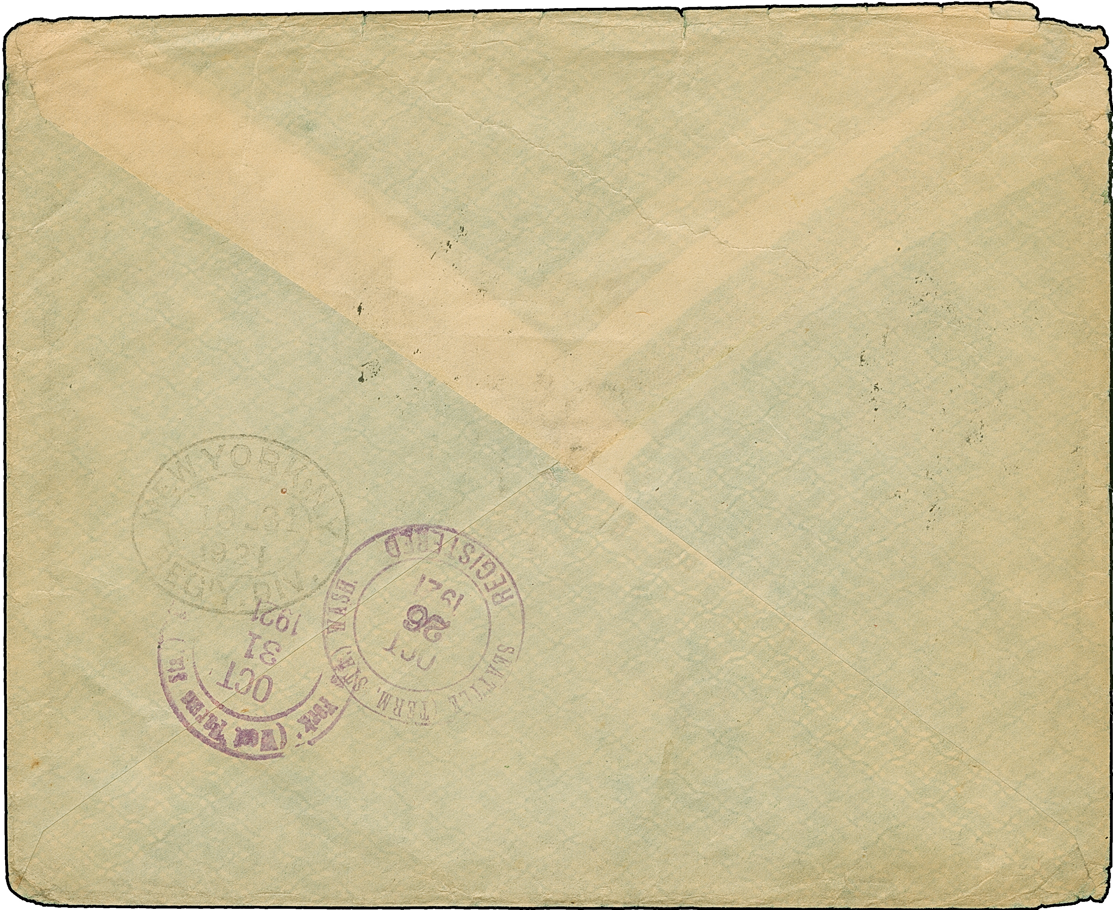 1920, Vladivostok issue 70 k. on 1 k. imperforate, four large margins all around, tied by cds. “VLADIVOSTOK 4 10 21” to registered envelope to New York with reverse transit and arrival marks, fine and scarce usage