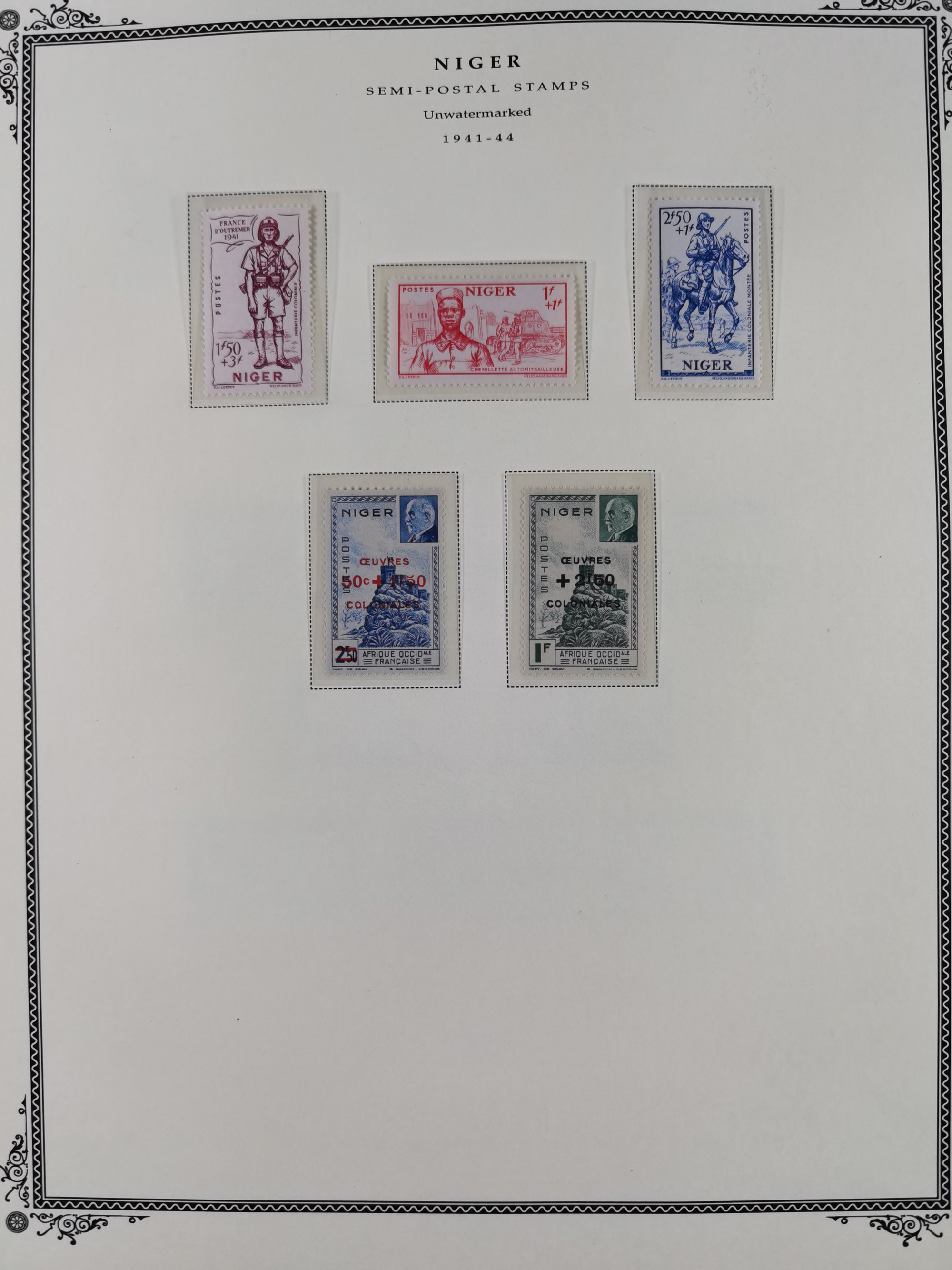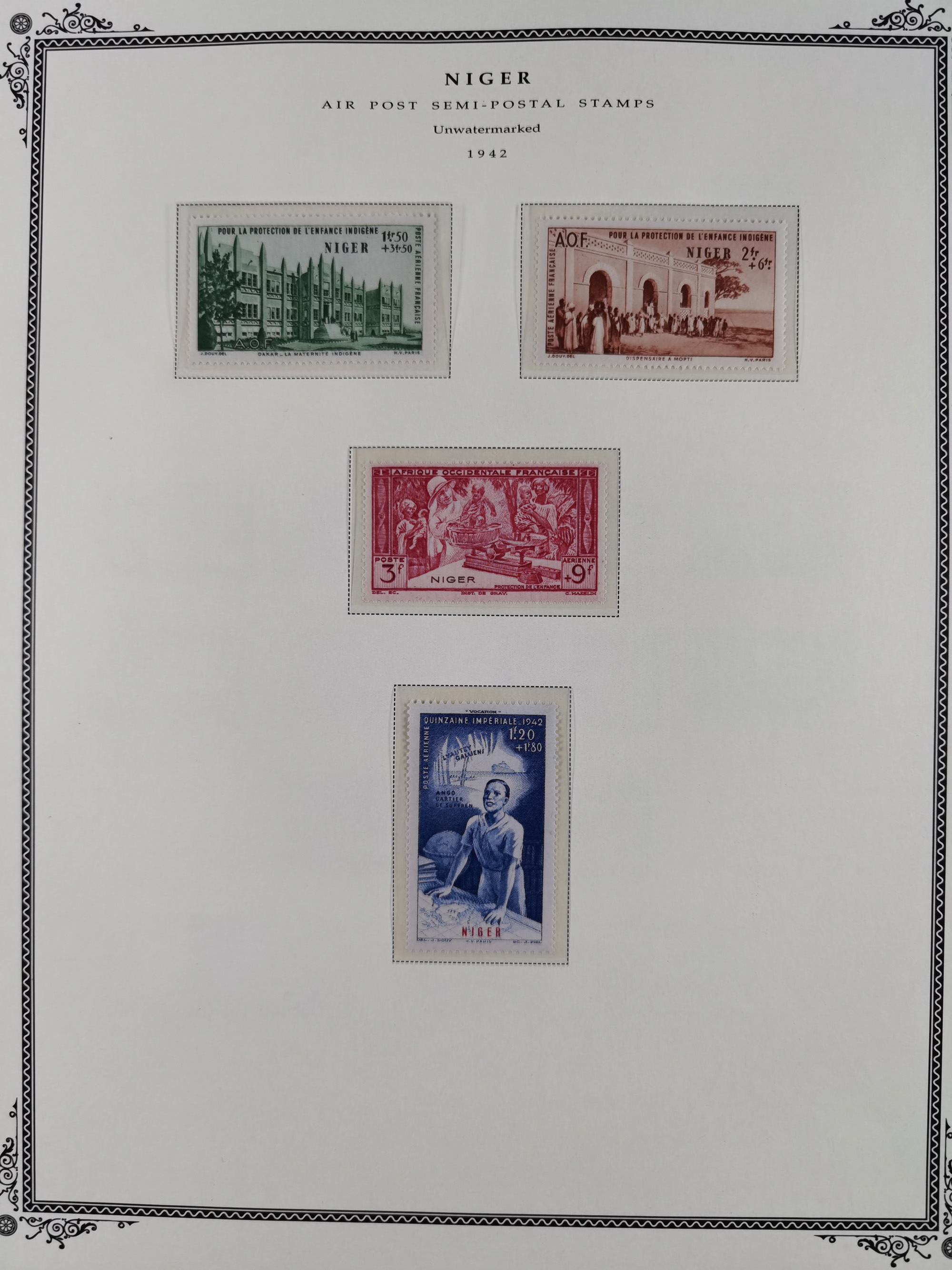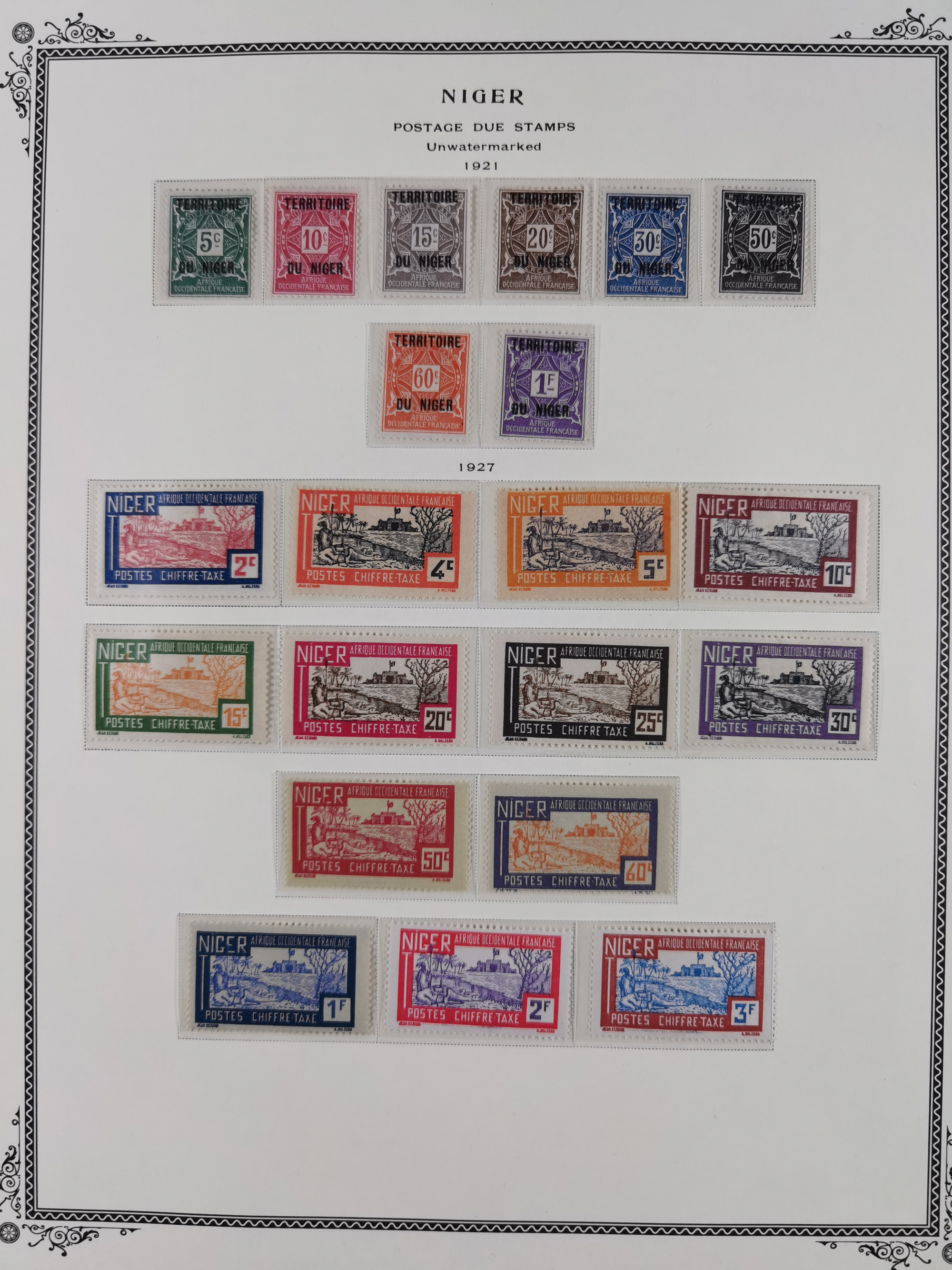 1921/1944, Collection on 11 Scott album leaves, unused and mnh, starting ‘Territoire du Niger’ overprinted issues, air mail issues, many complete sets, S/S and postage due, fine to very fine.