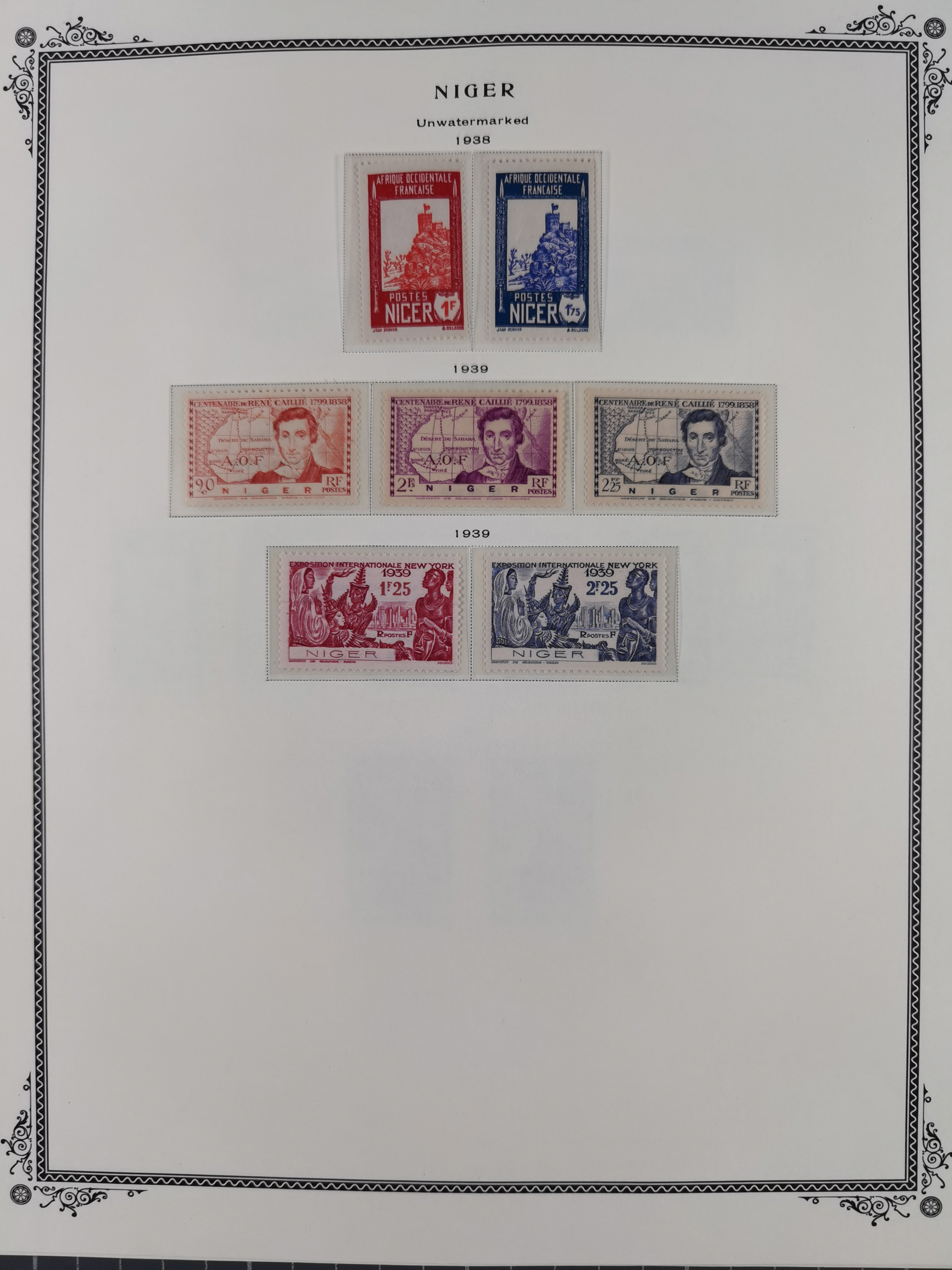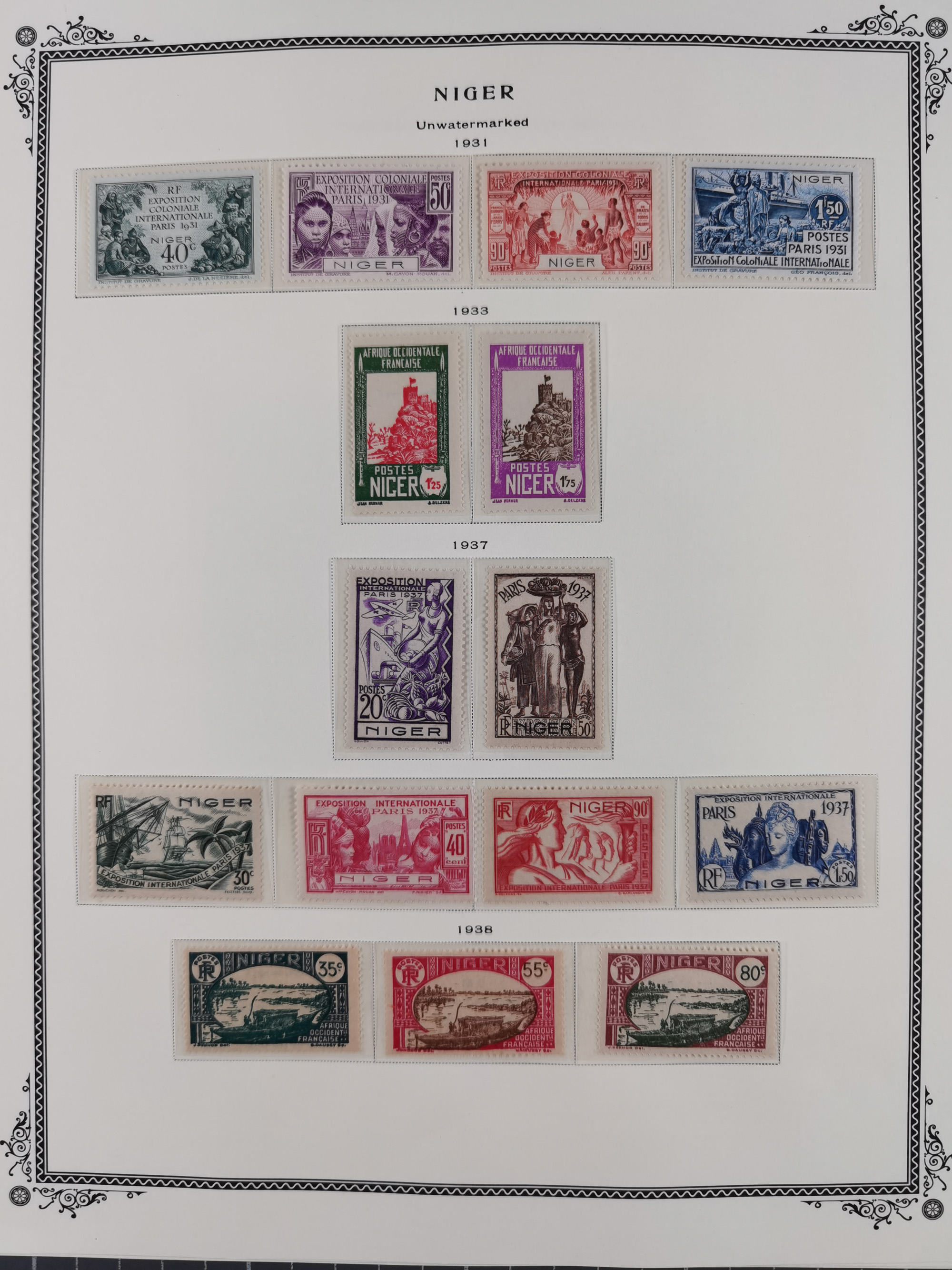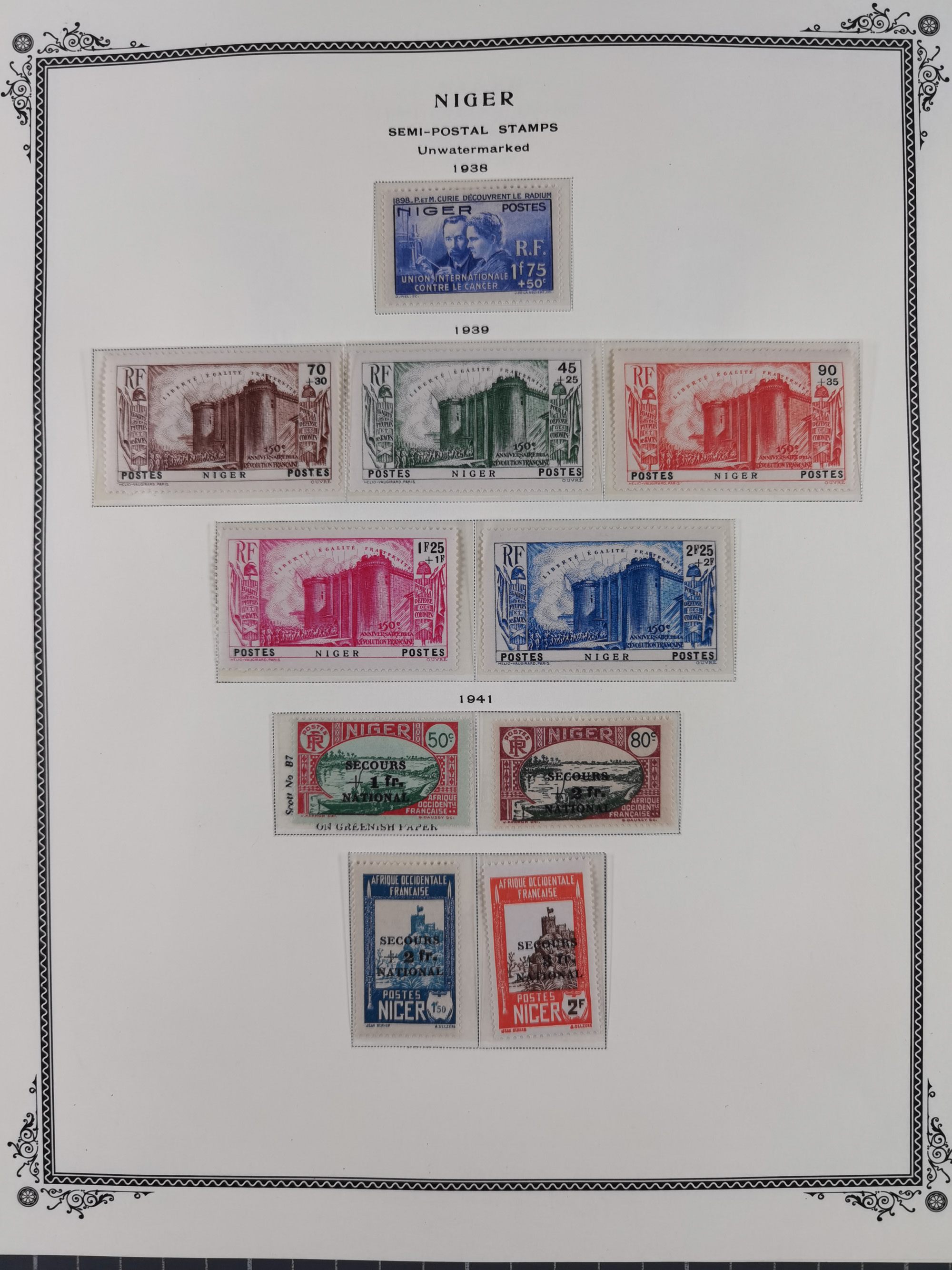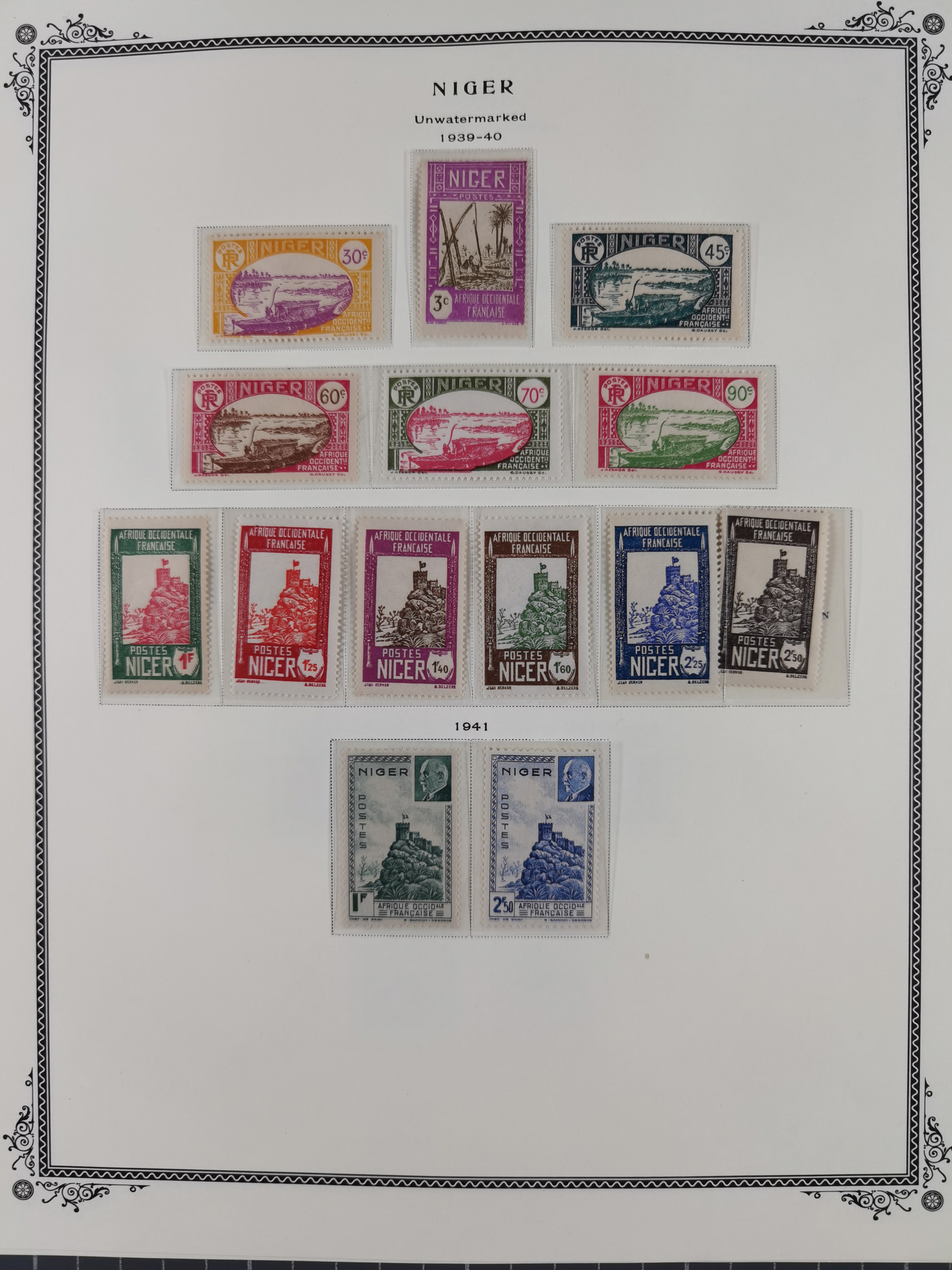 1921/1944, Collection on 11 Scott album leaves, unused and mnh, starting ‘Territoire du Niger’ overprinted issues, air mail issues, many complete sets, S/S and postage due, fine to very fine.