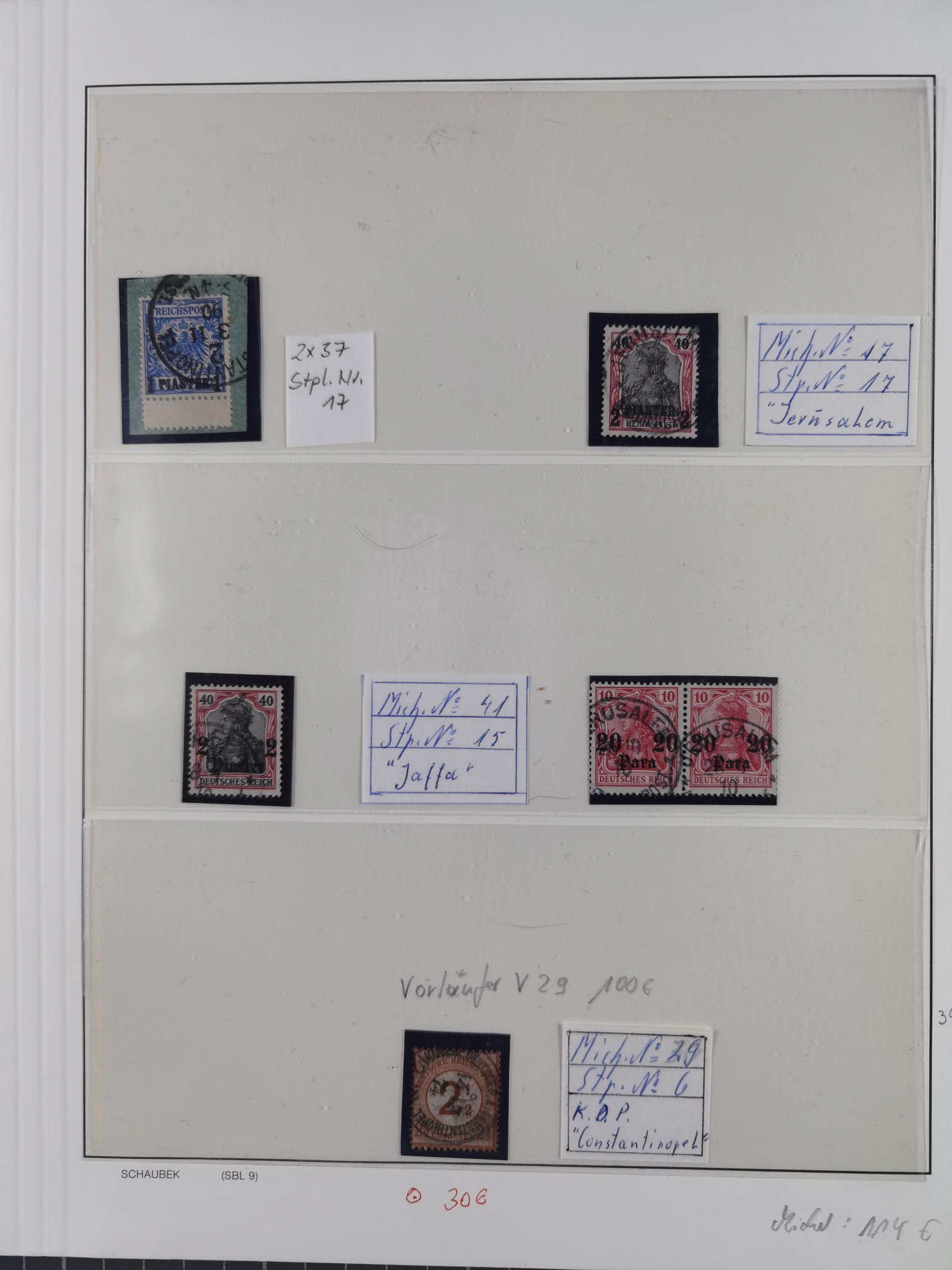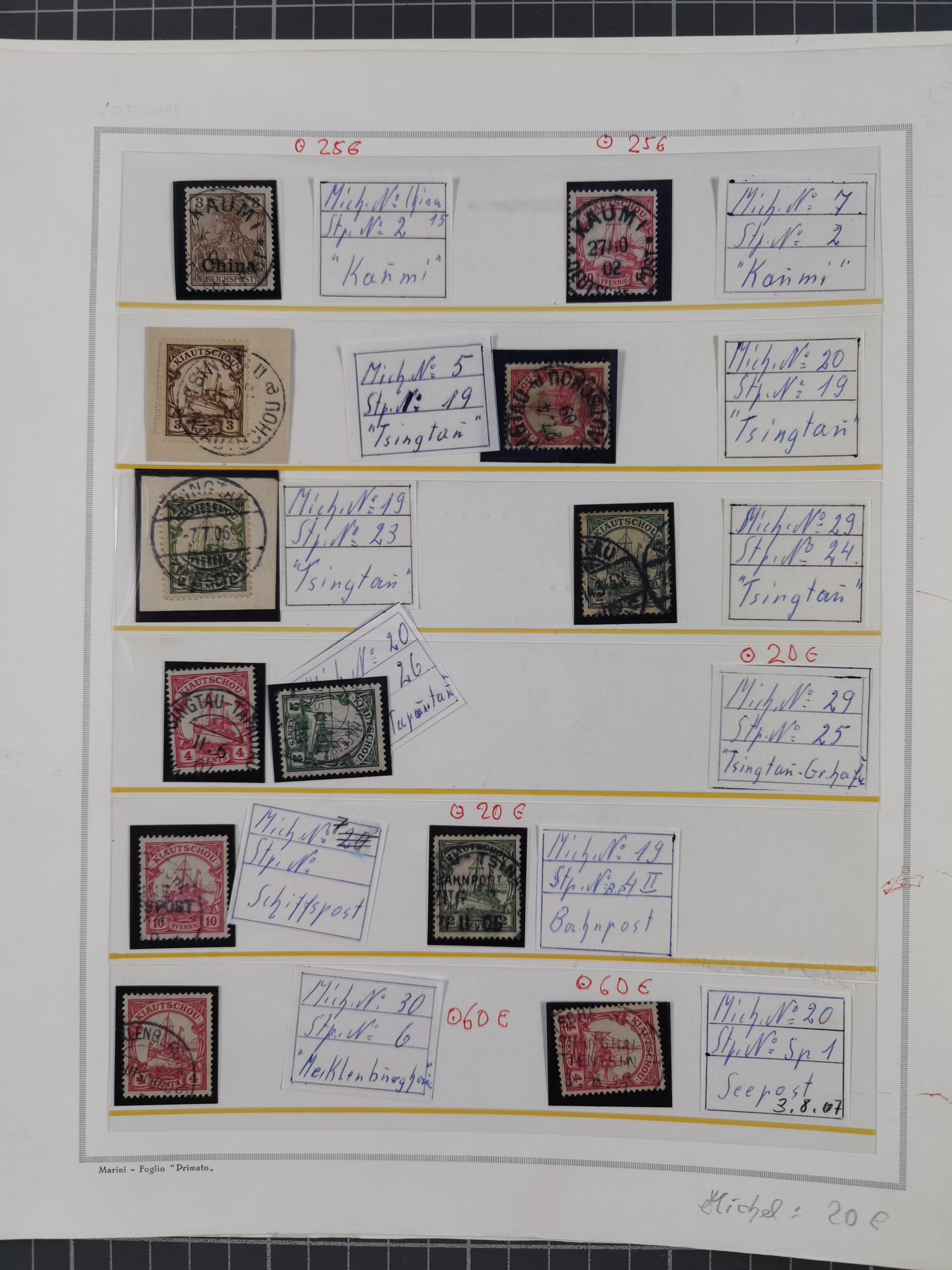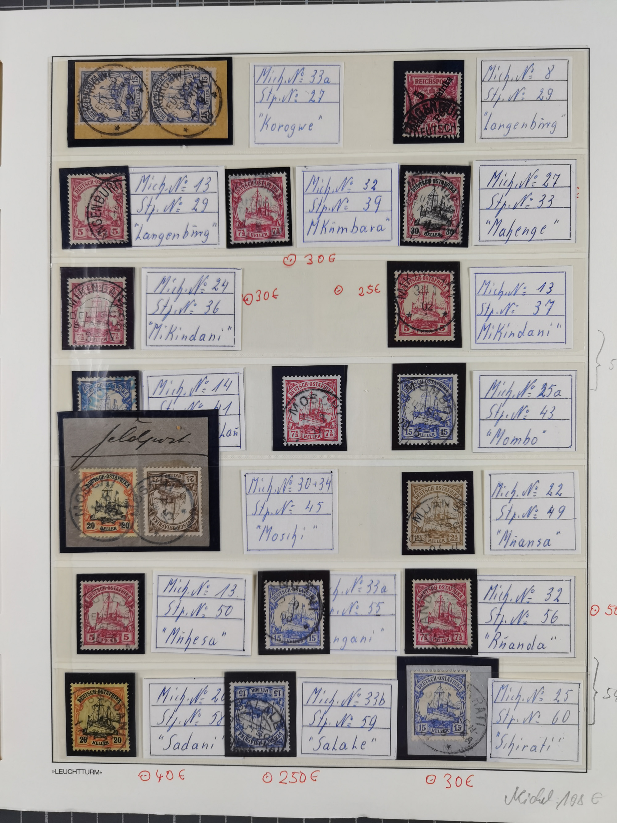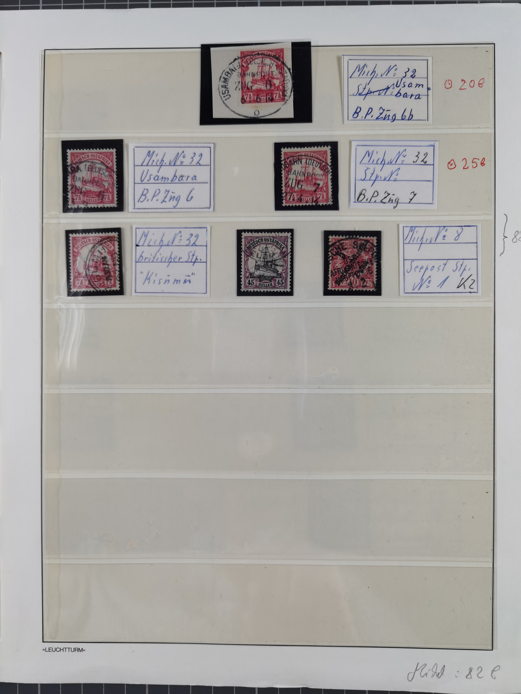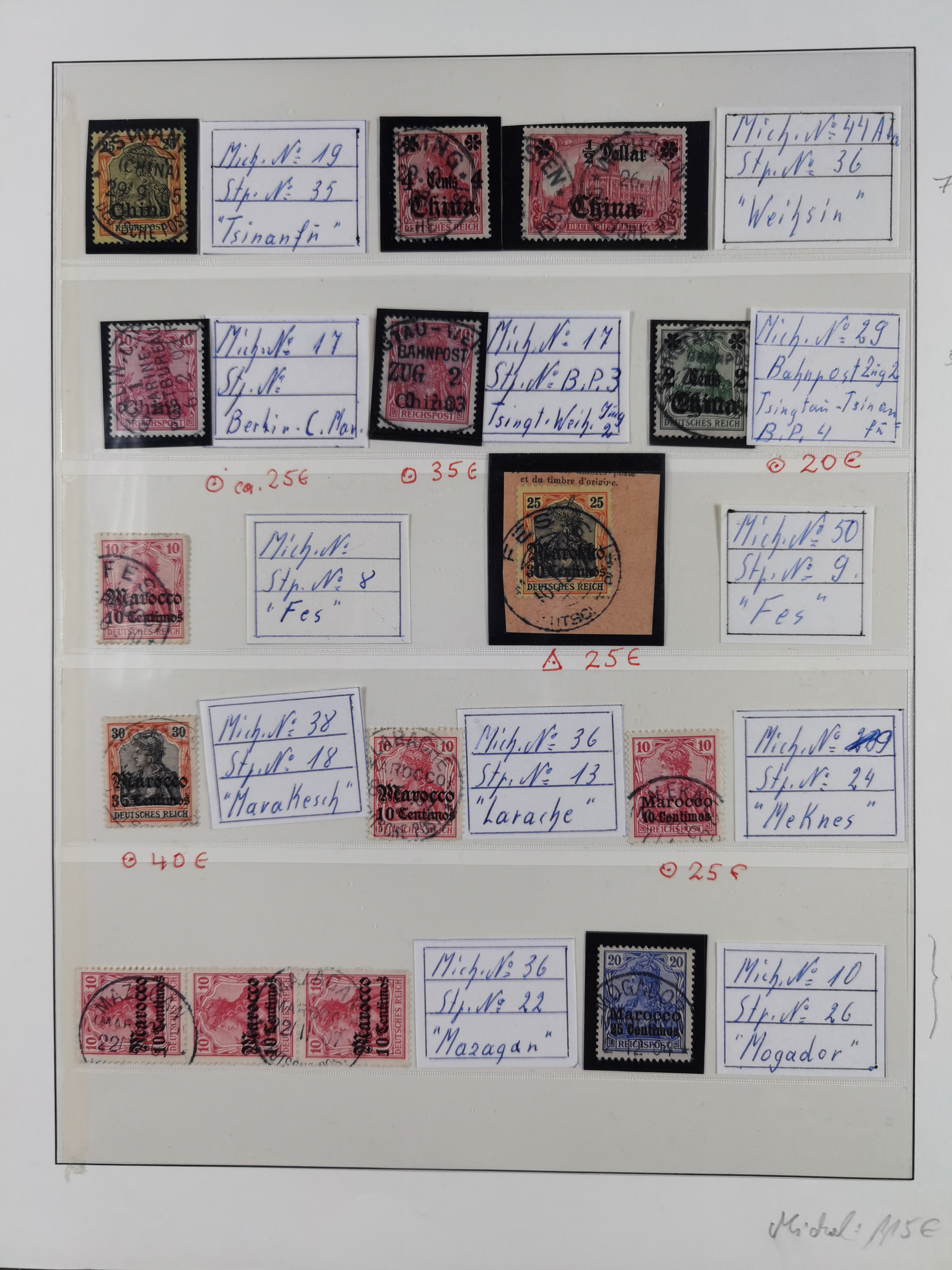 STEMPELSAMMLUNG: 226 Marken/ Briefausschnitten, mit einigen besseren Marken, z. B. China Nr. 44 AI, Türkei V 29 und Nr. 21 II/I. Bewertet wurden Stempel ab 20 € nach Arge Handbuch, Wert: 3.500 €, mit besseren Stempeln z. B Kissenji, Salale, Ssongea, 2 x Usambara Bahnpost Zug 5 b, Aris, Agu, meist gute Erhaltung