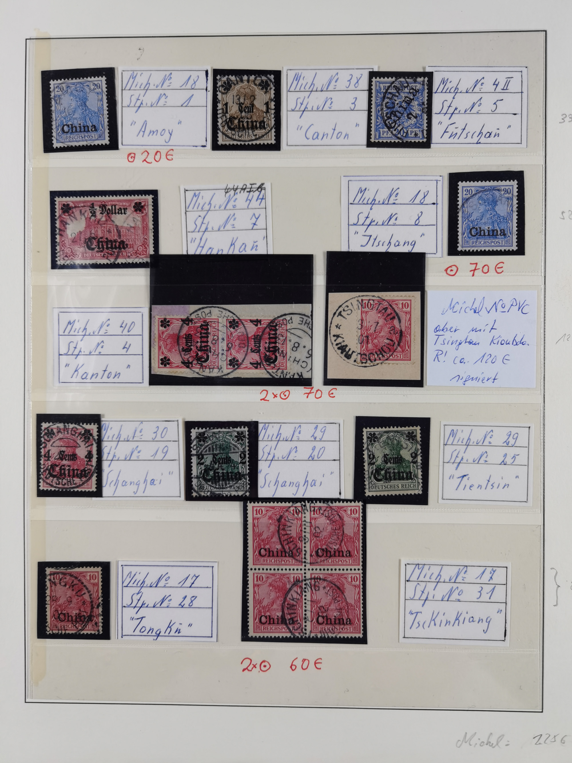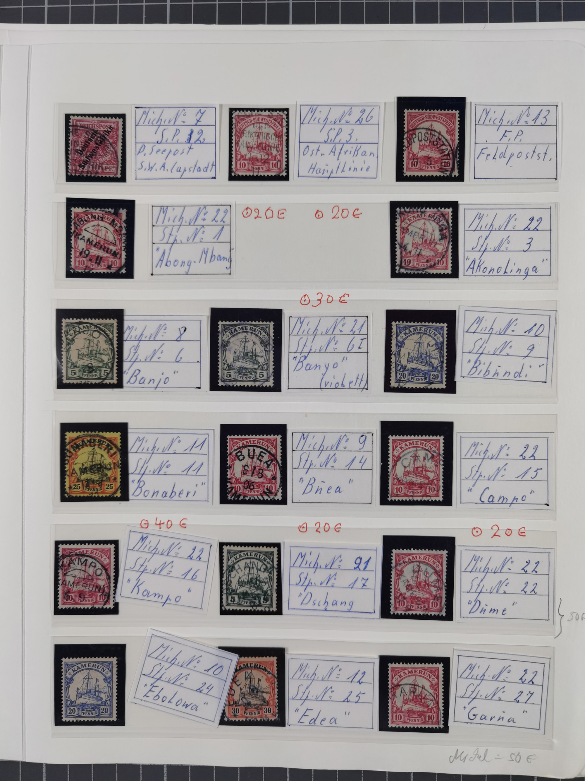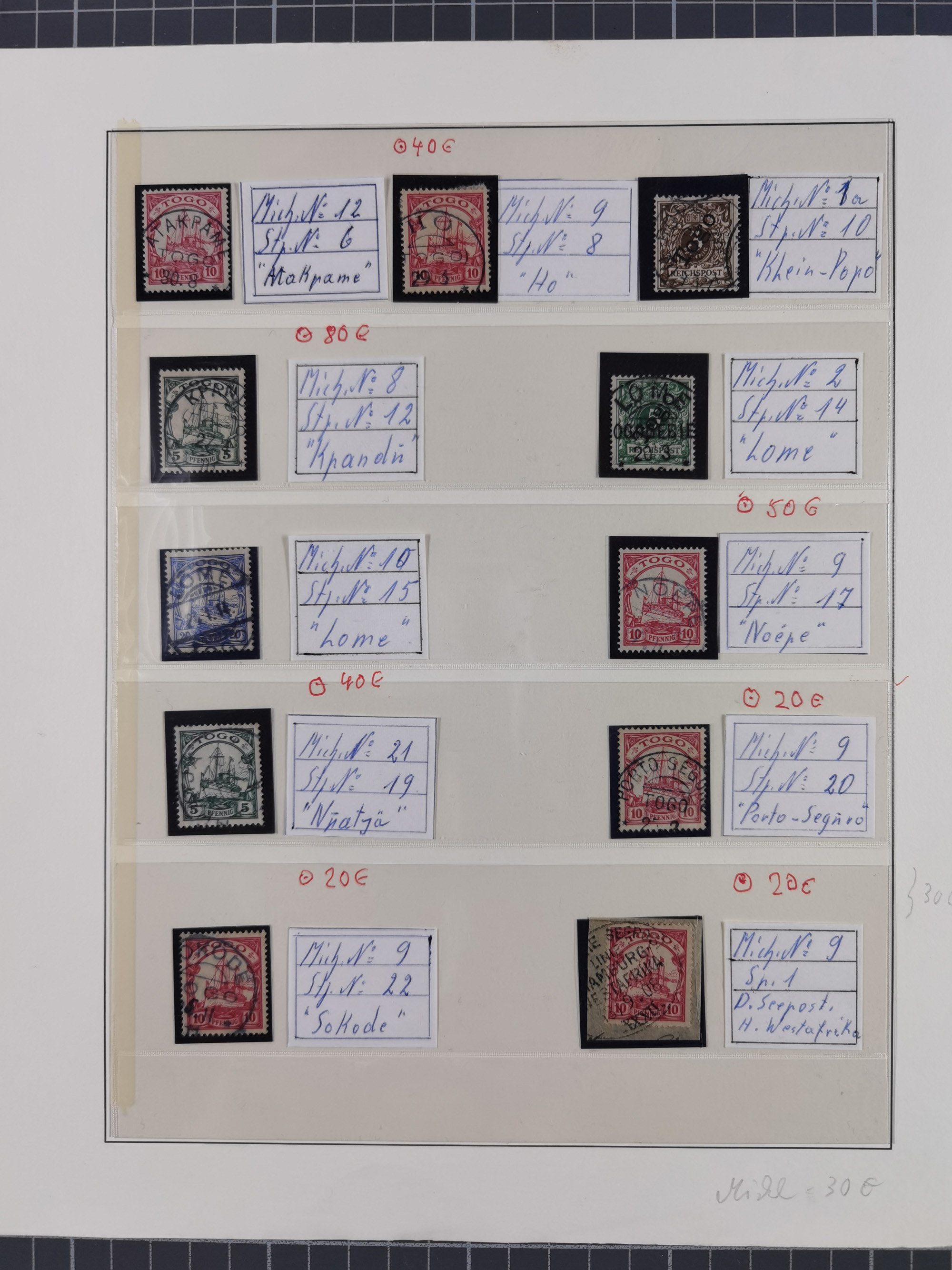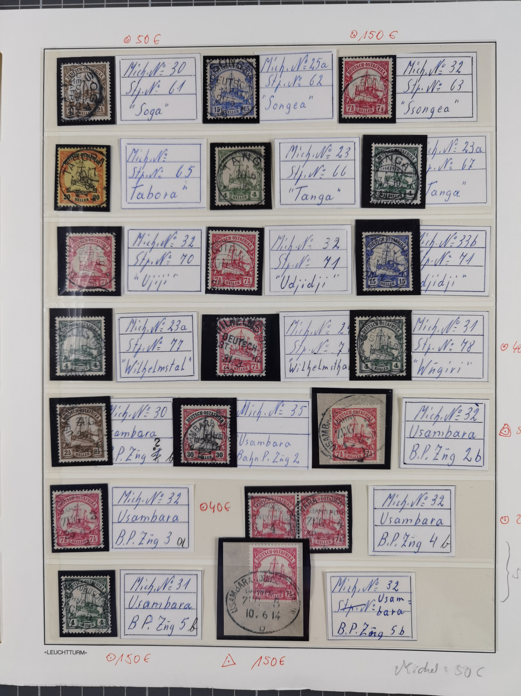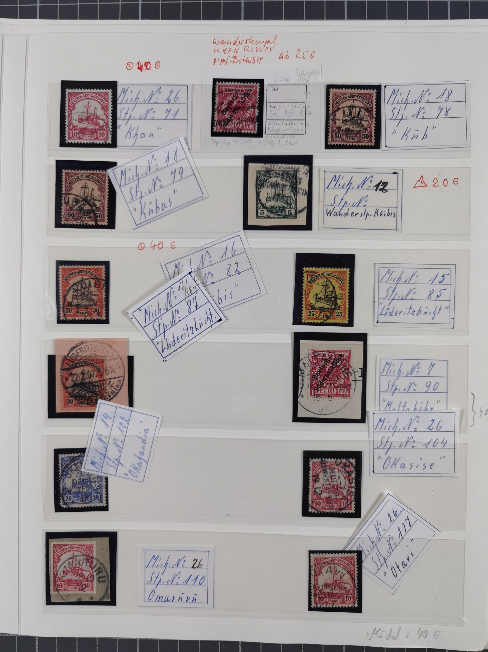 STEMPELSAMMLUNG: 226 Marken/ Briefausschnitten, mit einigen besseren Marken, z. B. China Nr. 44 AI, Türkei V 29 und Nr. 21 II/I. Bewertet wurden Stempel ab 20 € nach Arge Handbuch, Wert: 3.500 €, mit besseren Stempeln z. B Kissenji, Salale, Ssongea, 2 x Usambara Bahnpost Zug 5 b, Aris, Agu, meist gute Erhaltung