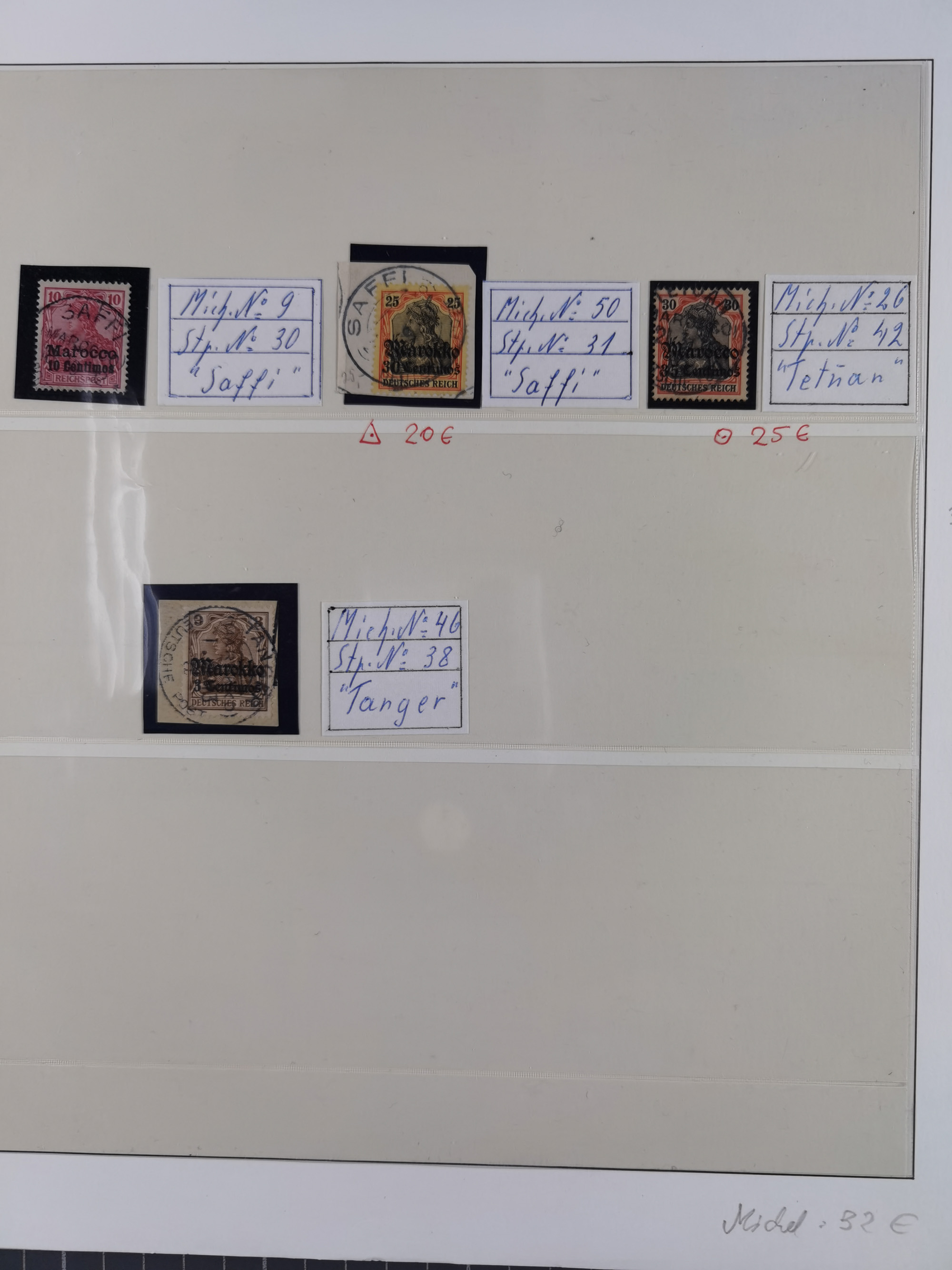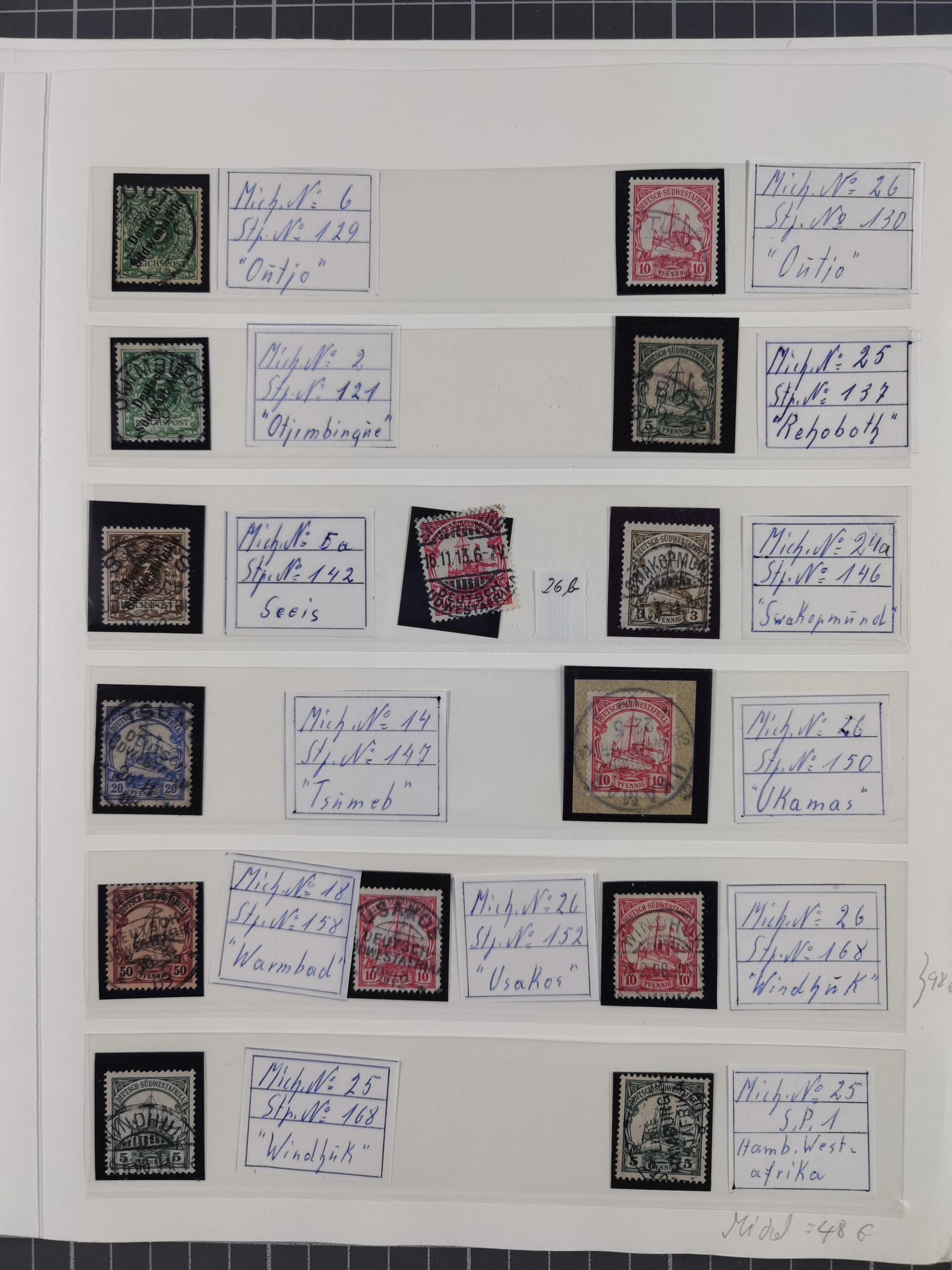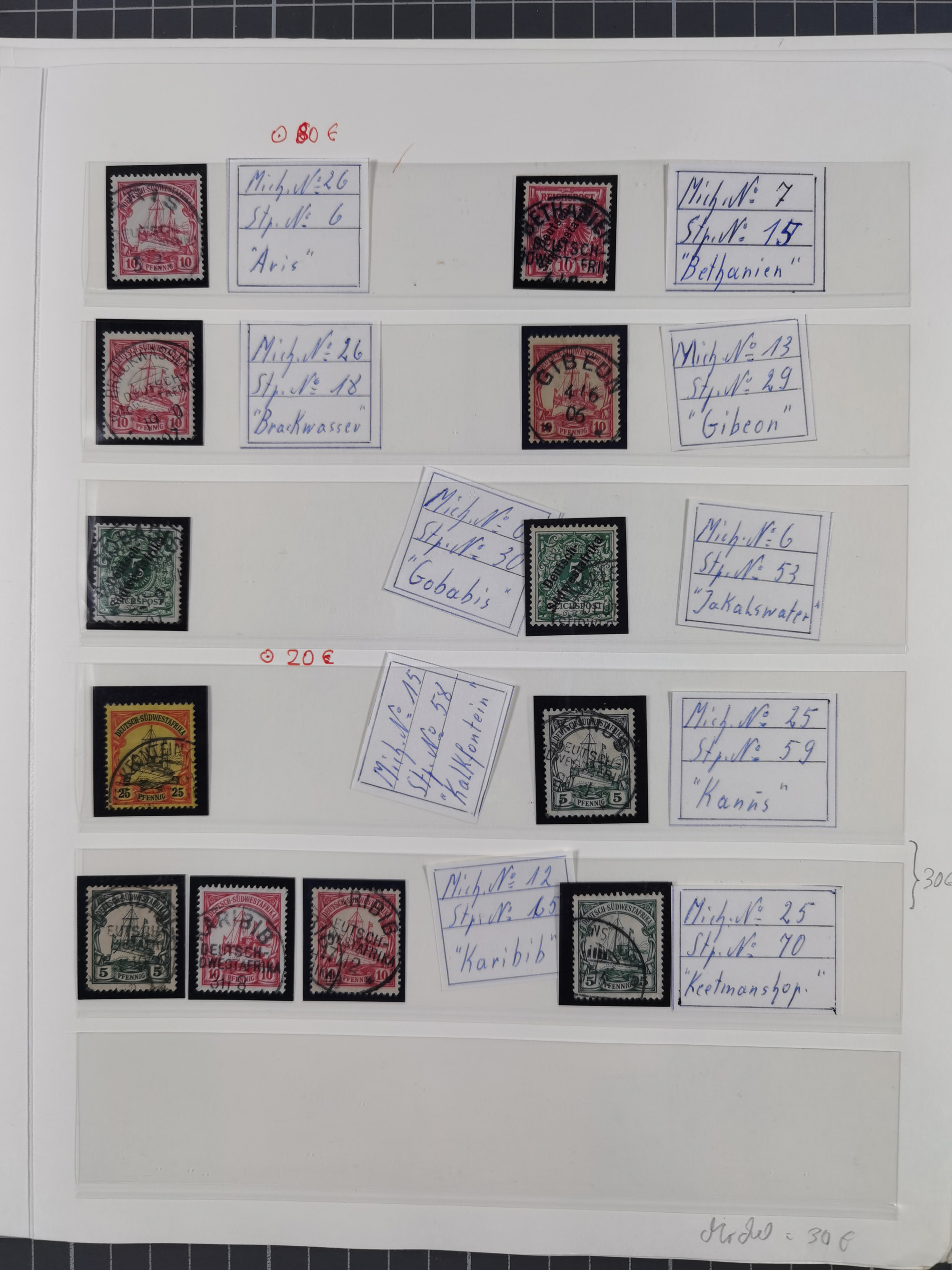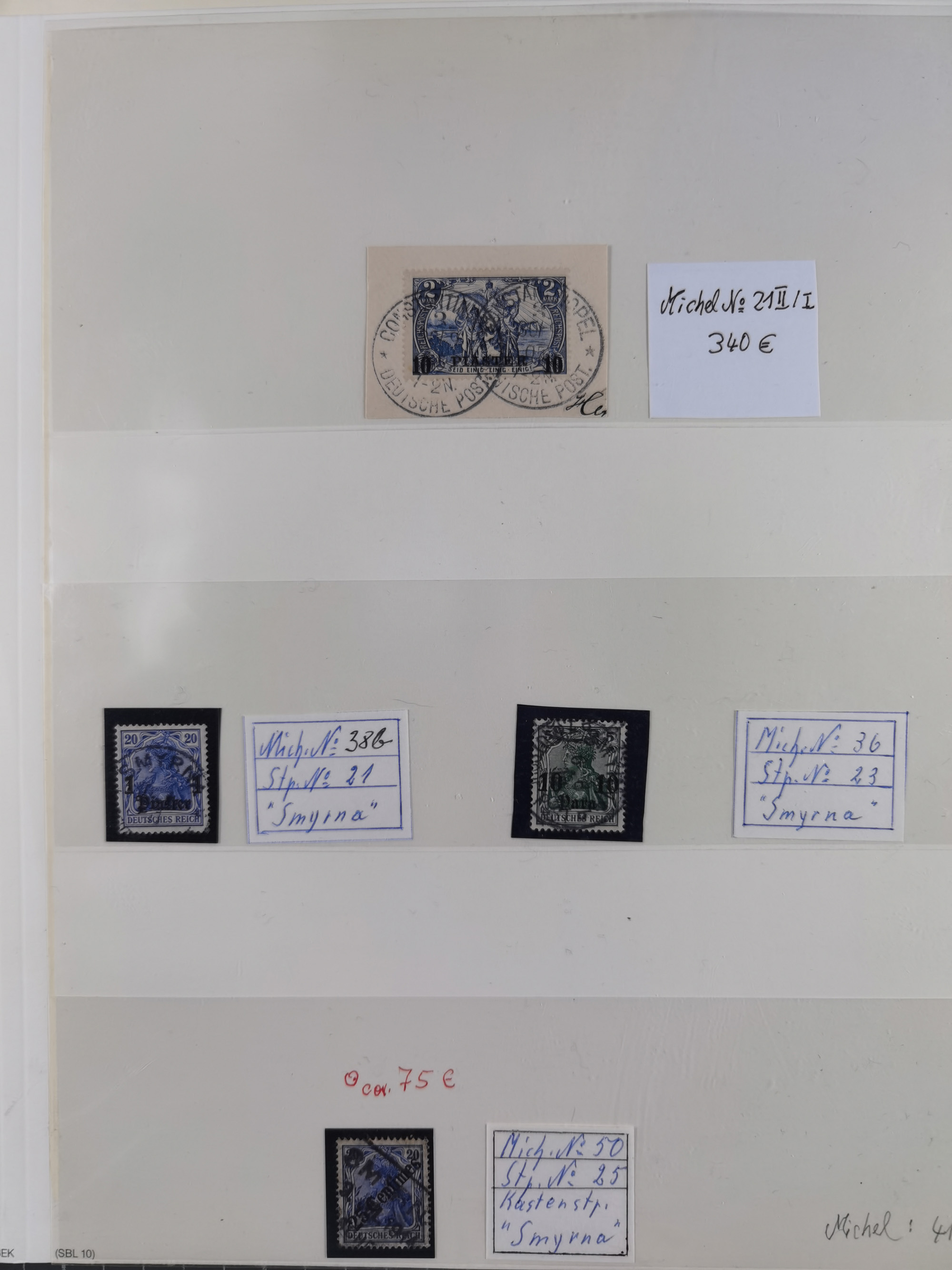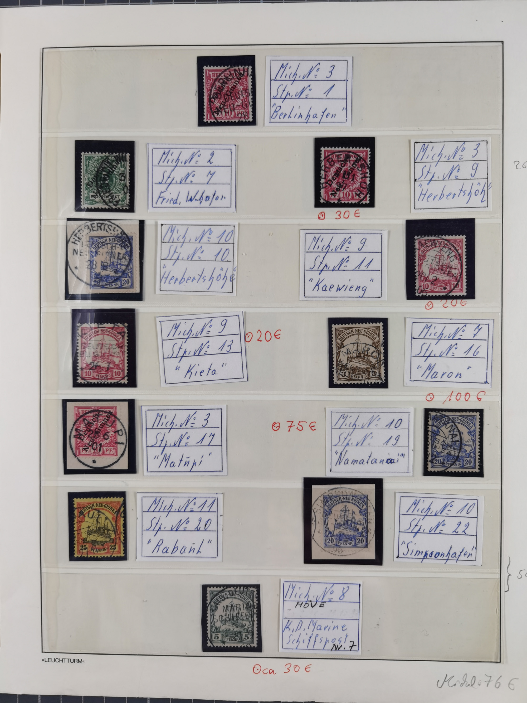 STEMPELSAMMLUNG: 226 Marken/ Briefausschnitten, mit einigen besseren Marken, z. B. China Nr. 44 AI, Türkei V 29 und Nr. 21 II/I. Bewertet wurden Stempel ab 20 € nach Arge Handbuch, Wert: 3.500 €, mit besseren Stempeln z. B Kissenji, Salale, Ssongea, 2 x Usambara Bahnpost Zug 5 b, Aris, Agu, meist gute Erhaltung