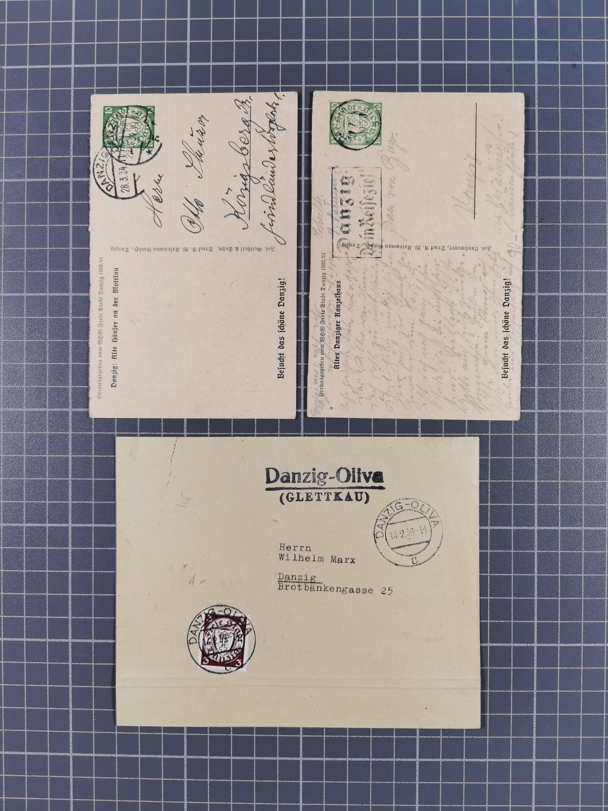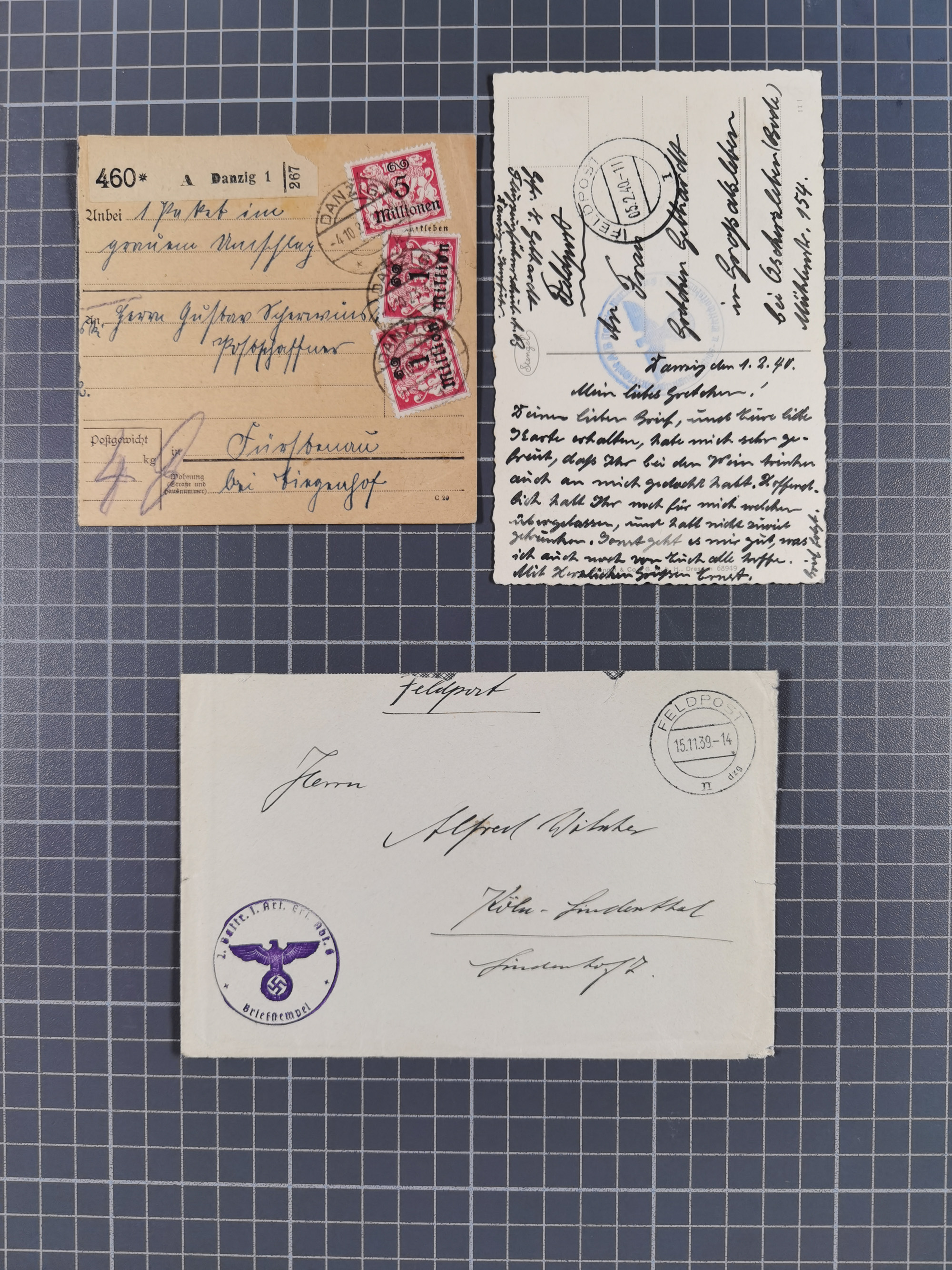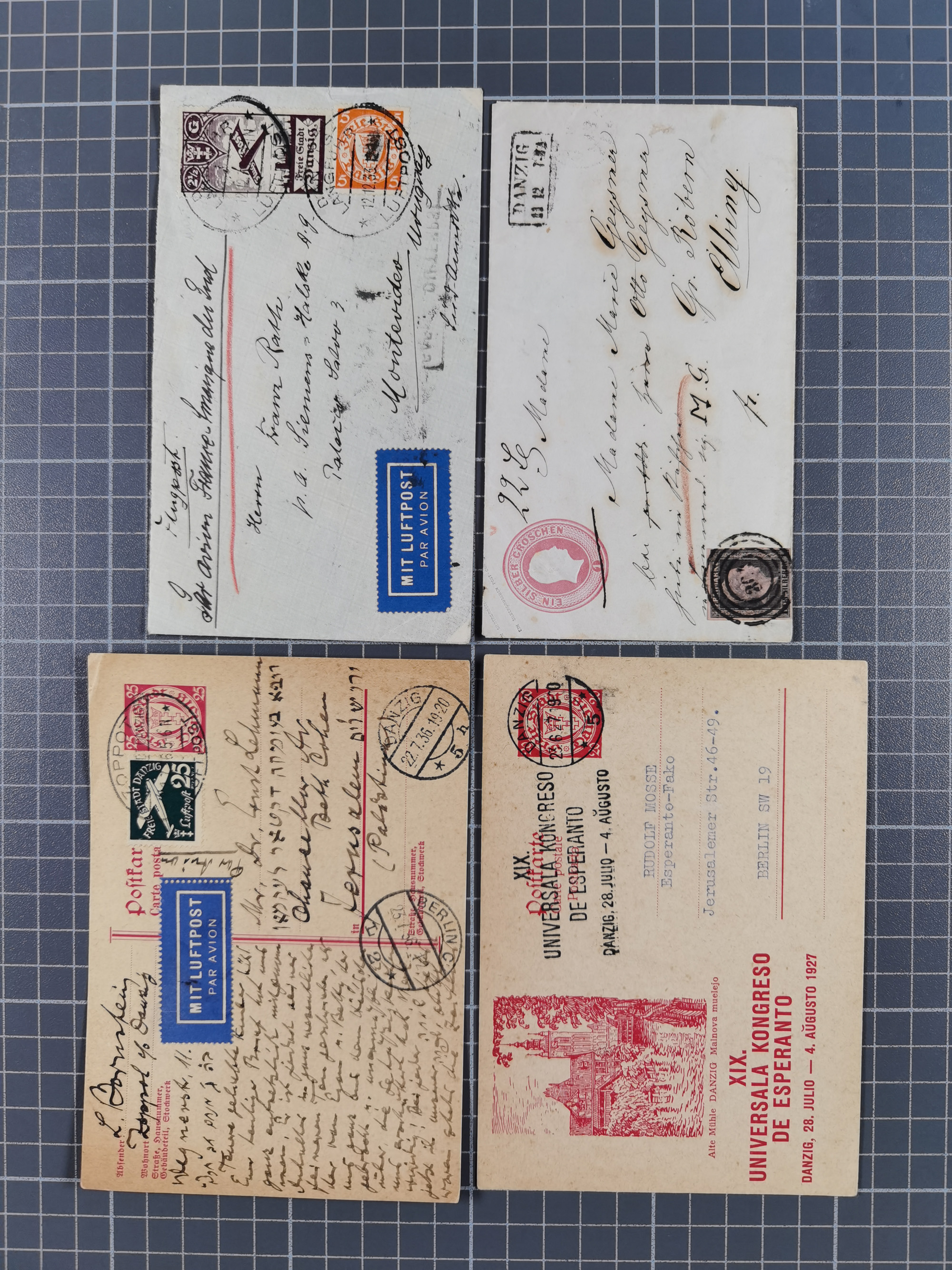 1856/1940, Partie mit 10 besseren Briefen, Karten und Ganzsachen. Dabei u.a. Preußen-GSU mit Zufrankatur und Nummernstempel “304”, frankierte Paketkarte aus der Hochinflation, Luftpost-Brief 1933 nach Uruguay, zwei gebraucht HP1 und zwei Feldpost-Belege mit Danziger Feldpost-Stempeln, meist in guter Erhaltung, ex Hulkenberg