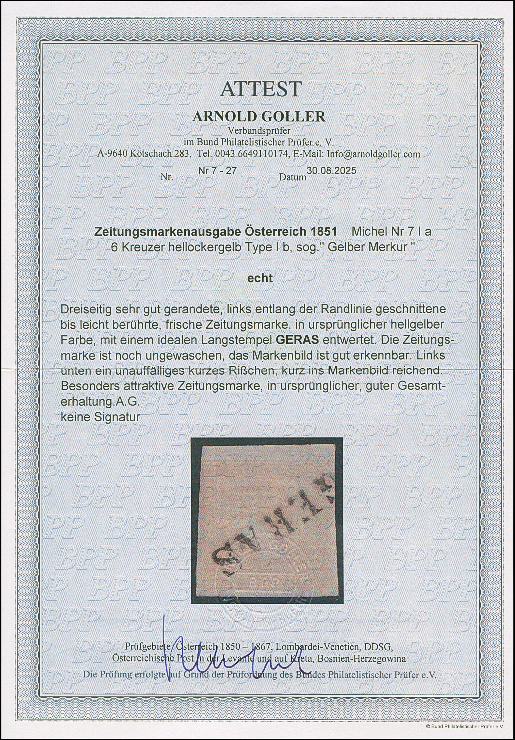 1851, “Gelber Merkur” 6 Kr., Type Ia, dreiseitig breit-bis überrrandig, links leicht an der Randlinie geschnitten bis berührt, in frischer hellgelber Nuance, mit ideal aufgesetzem L1 “GERAS”, ungewaschen mit großem Teil des Originalgummis und kleinen Resten des Briefpapieres. Unten links ein kleines, unauffälliges bis leicht in das Motiv gehendes Risschen, sonst tadellos. Ein sehr attraktives Exemplar in guter und ursprünglicher Erhaltung. Fotoattest Goller BPP (2025)