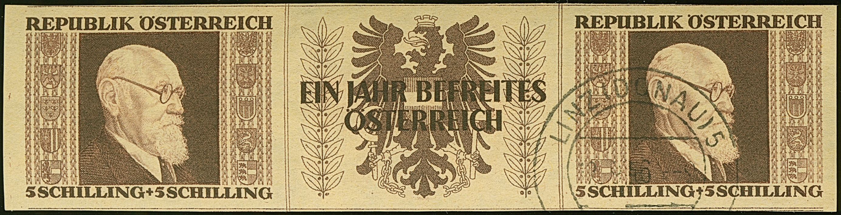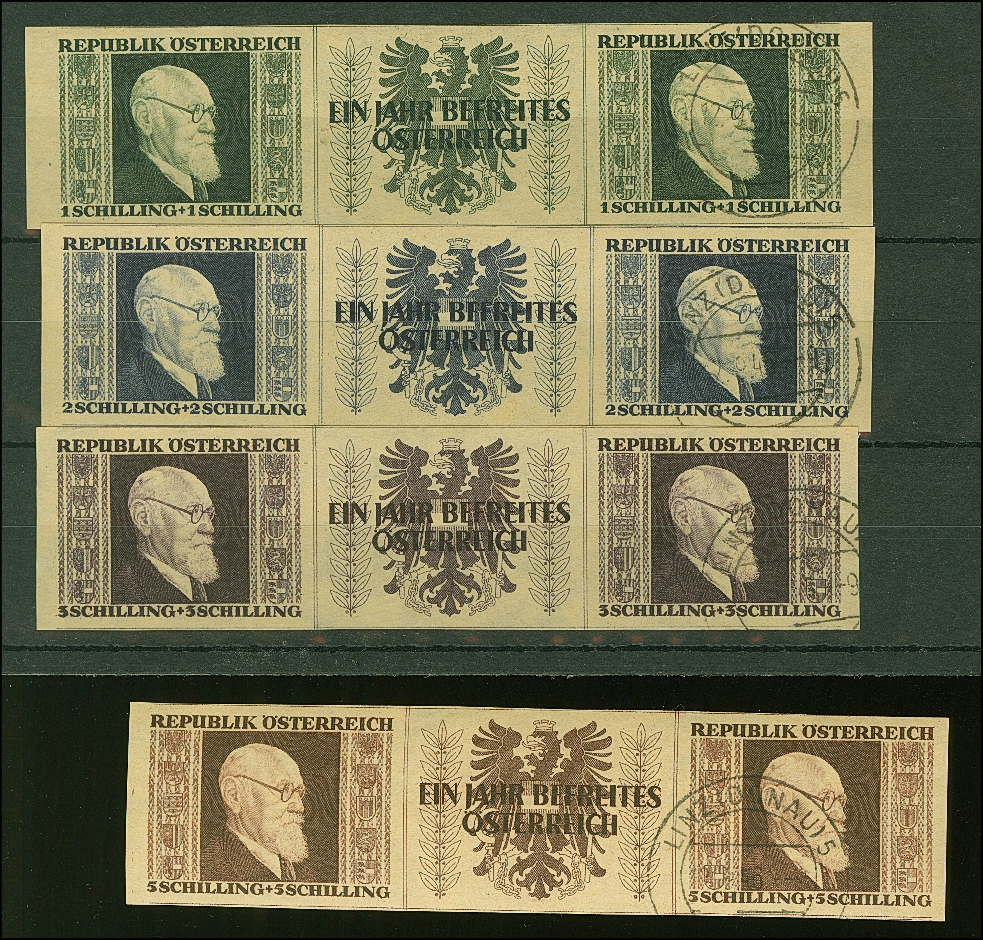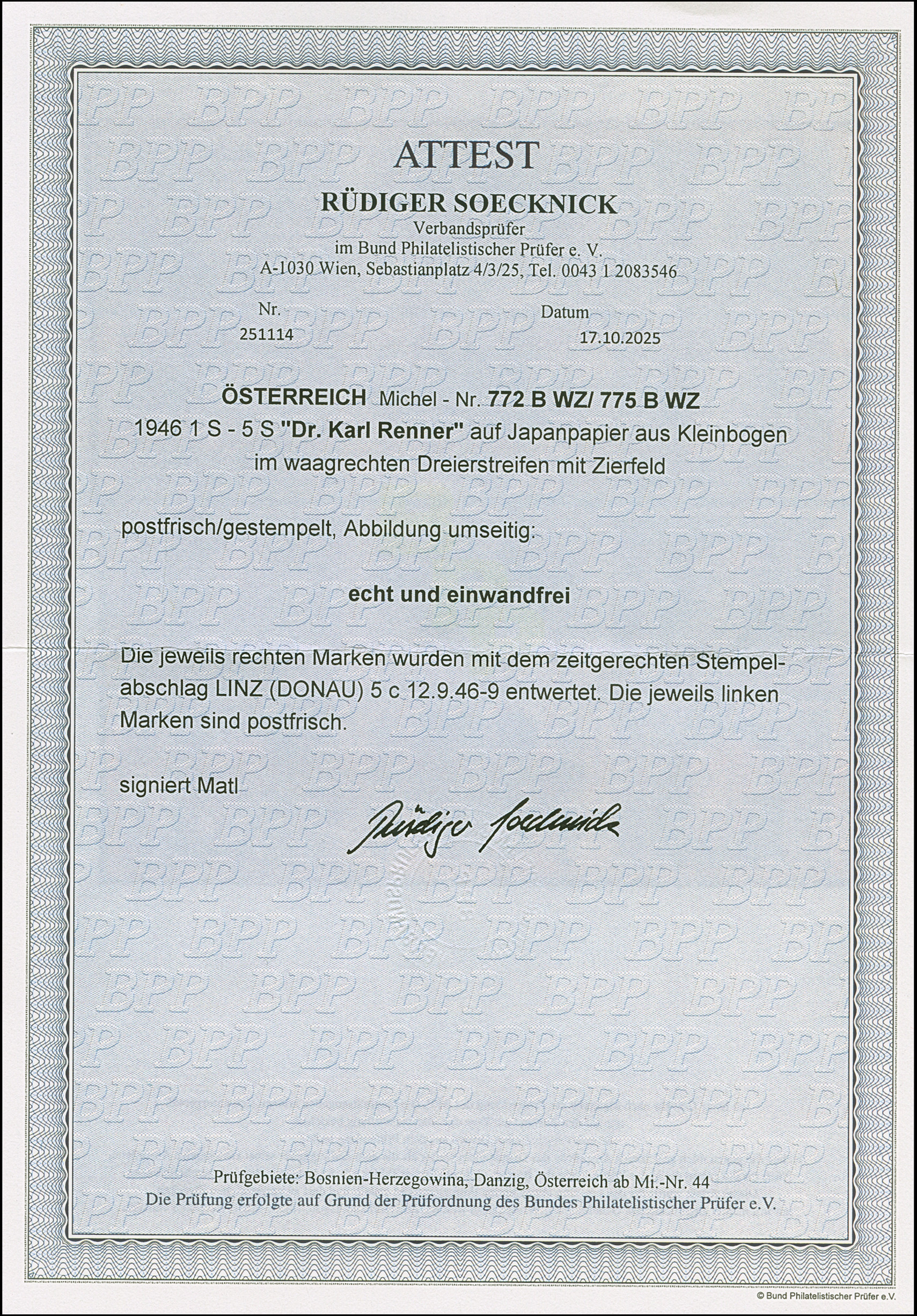 1946, Renner 1-5 S. geschnitten in waagerechten Dreierstreifen mit Zierfeld, dabei alle rechten Marken mit zeitgerechter Entwertung “LINZ (DONAU) 5c 12.9.46” und alle linken Marken sind postfrisch, in tadelloser Erhaltung. In dieser Art sehr selten, sign. Matl und Fotattest Soecknick BPP (2025)