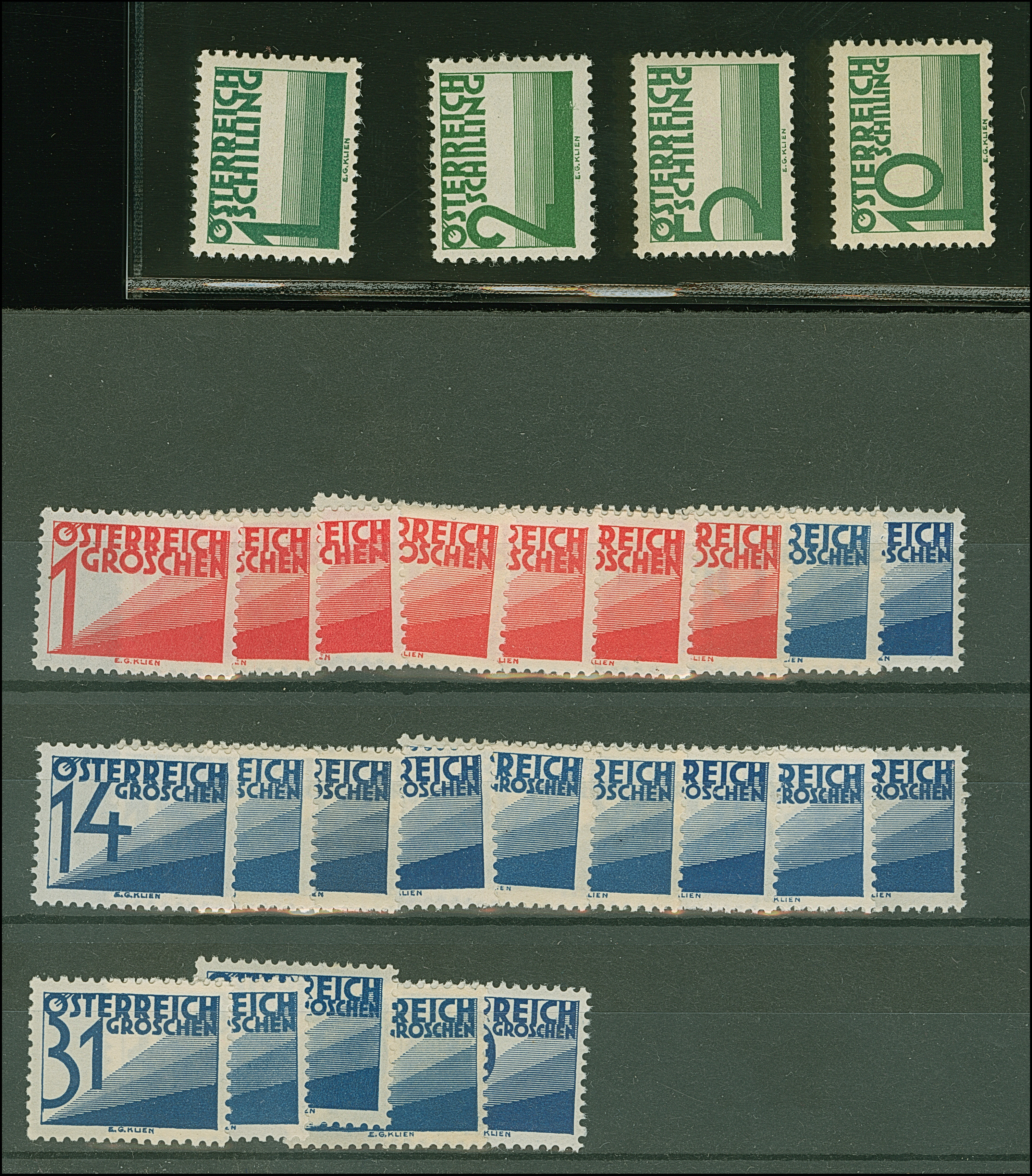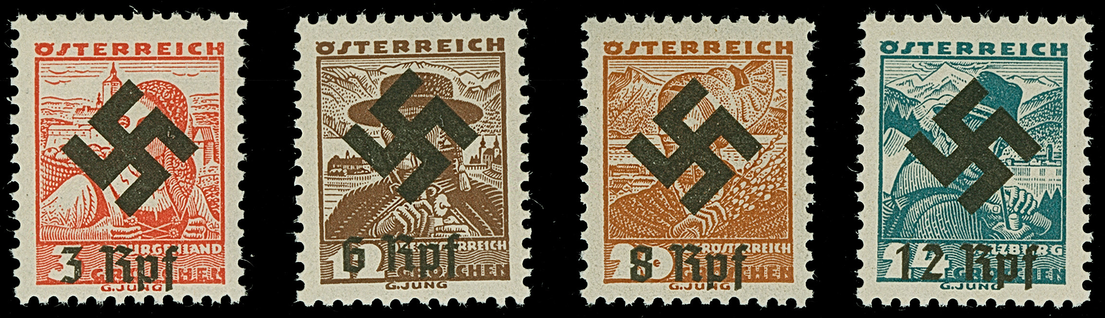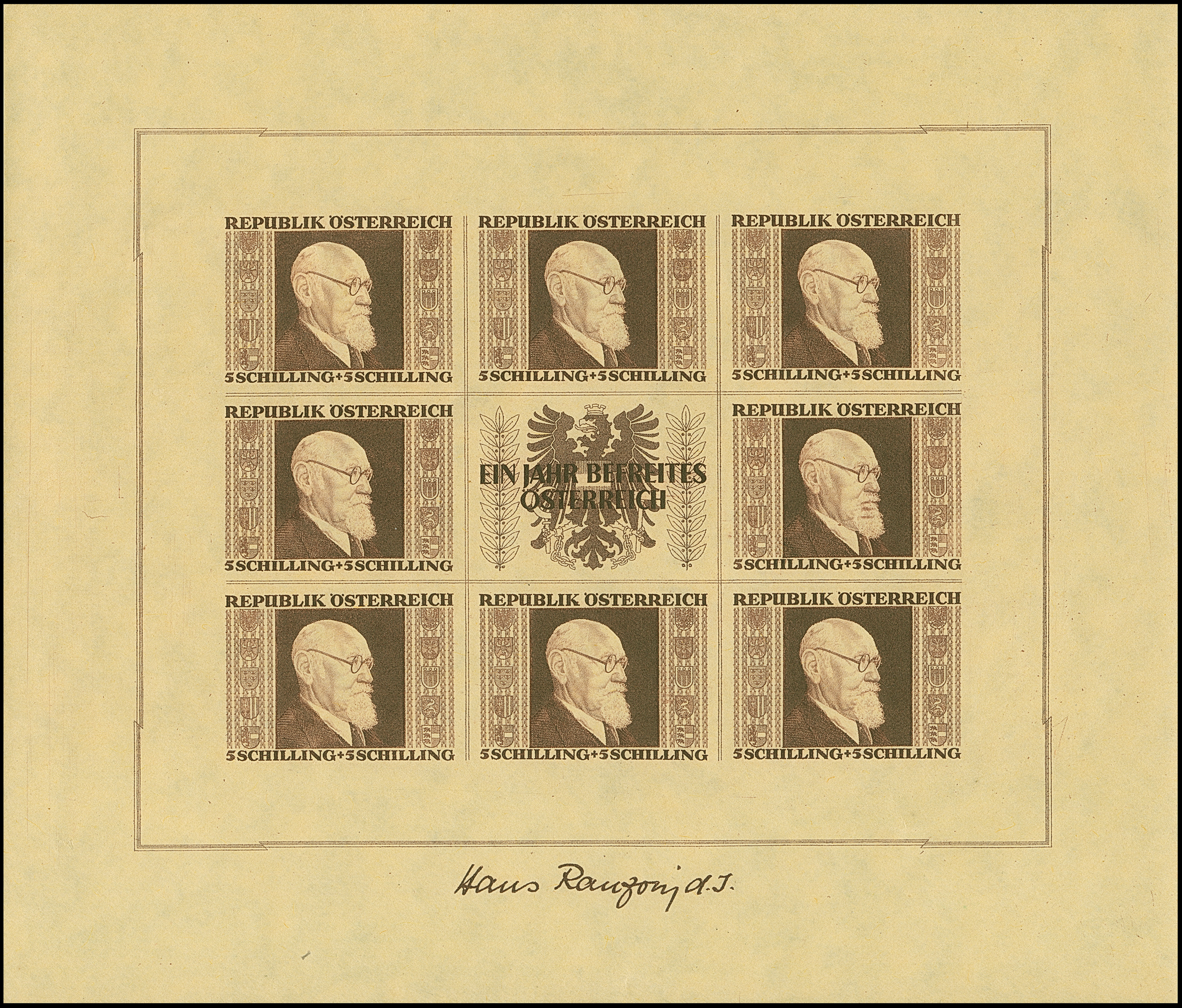 1946, Renner 1-5 S. geschnitten in waagerechten Dreierstreifen mit Zierfeld, dabei alle rechten Marken mit zeitgerechter Entwertung “LINZ (DONAU) 5c 12.9.46” und alle linken Marken sind postfrisch, in tadelloser Erhaltung. In dieser Art sehr selten, sign. Matl und Fotattest Soecknick BPP (2025)