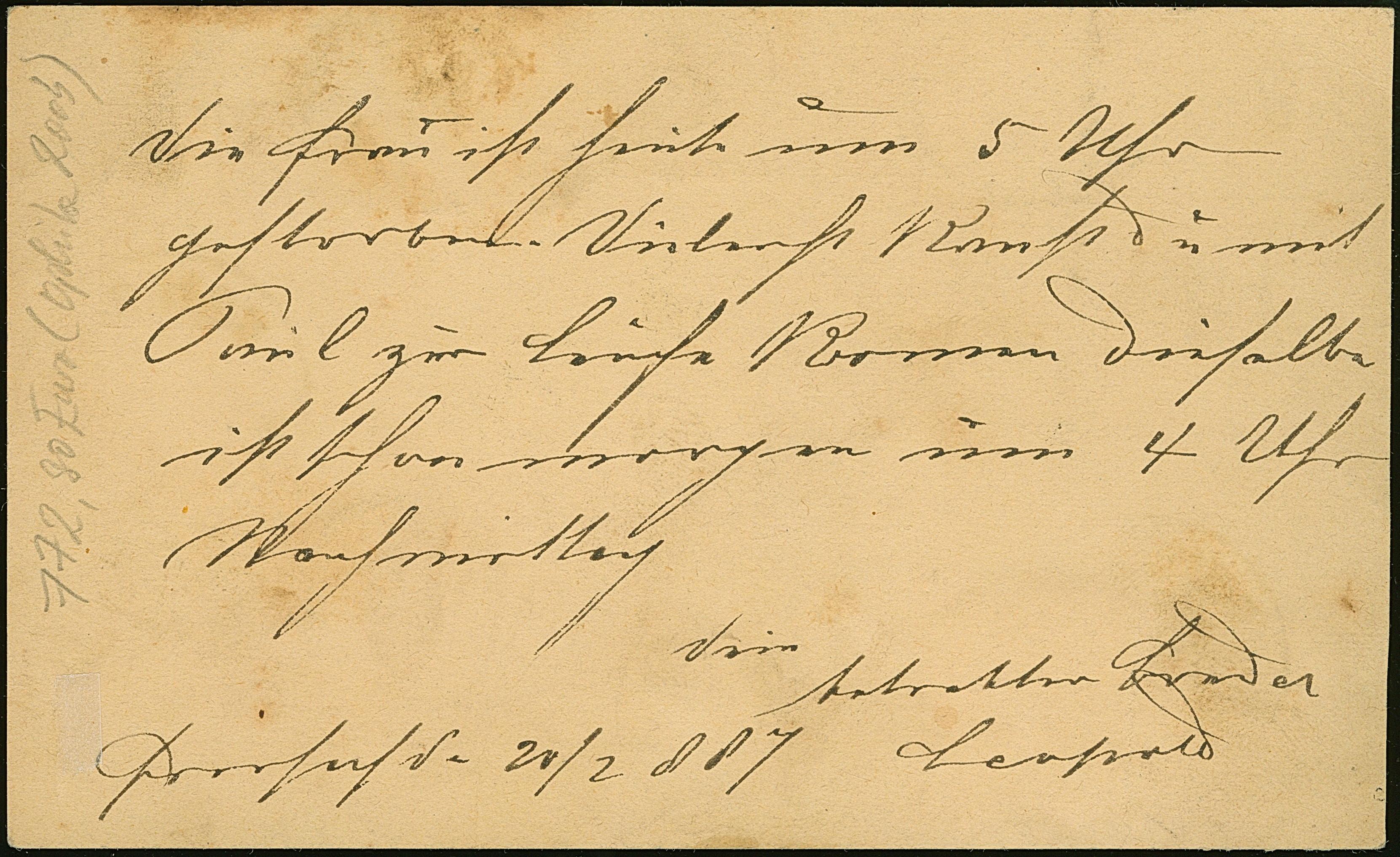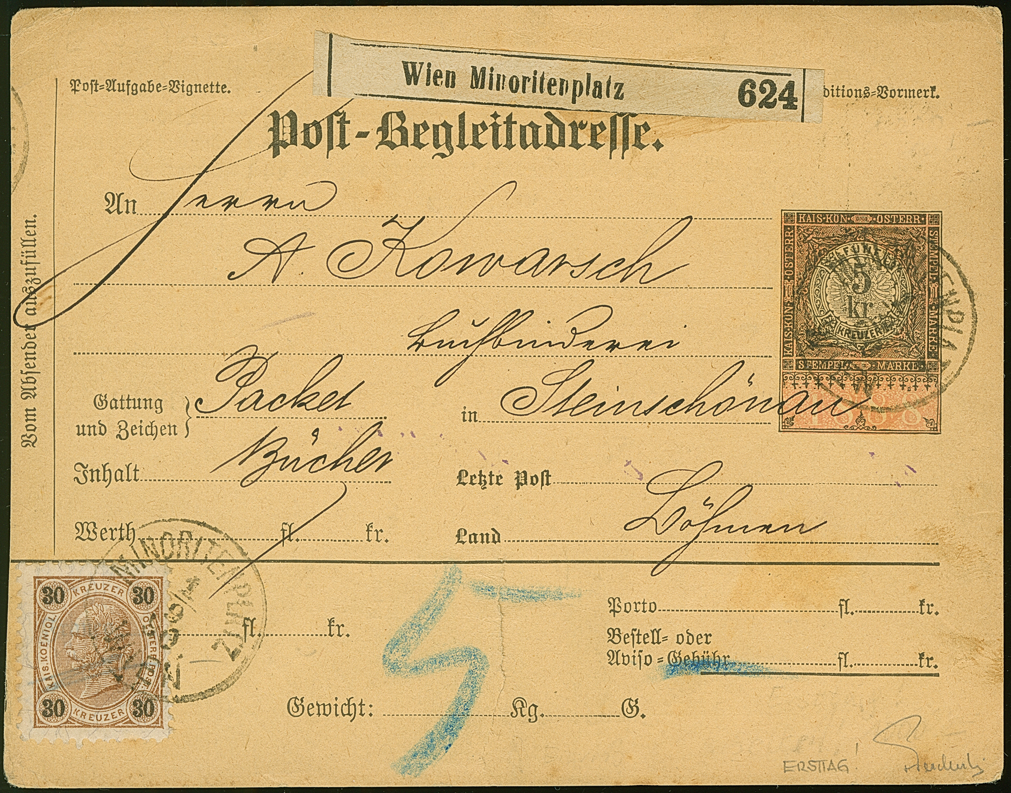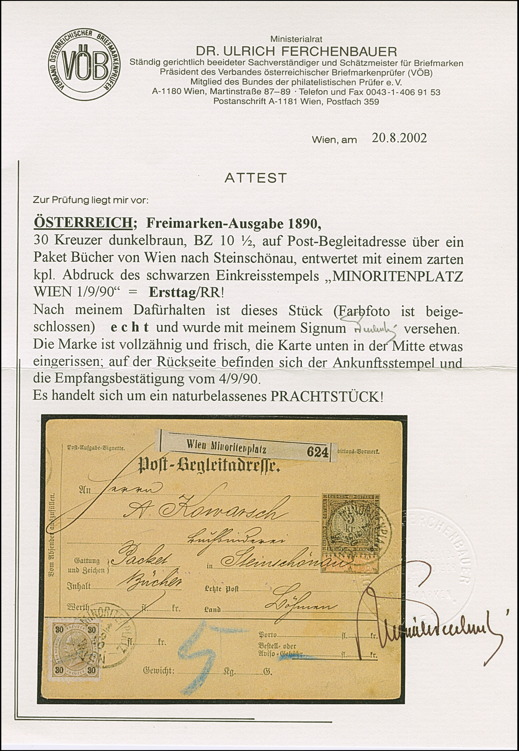1890, Kaiser Franz Josef 30 Kr. dunkelorangebraun/schwarz auf Post-Begleitadresse-Karte 5 Kr. braun von “MINORITENPLATZ WIEN 1 9 90” über ein Paket Bücher nach Steinschönau, die Karte unten in der Mitte etwas eingerissen, die Marke mit zwei kurzen Zähnen, sonst in sehr schöner Erhaltung. Eine attraktive Ersttagsverwendung dieser Ausgabe, signiert sowie Fotoattest Ferchenbauer (2002)