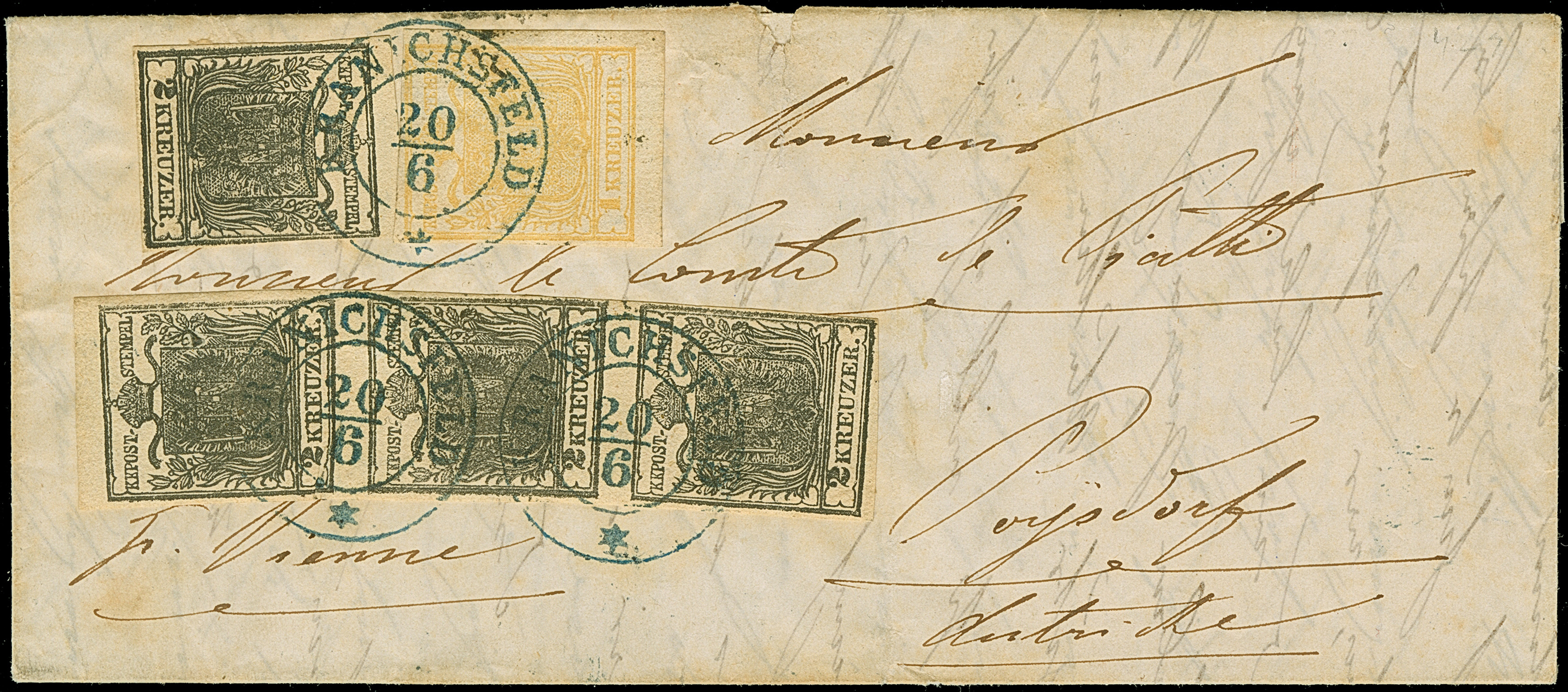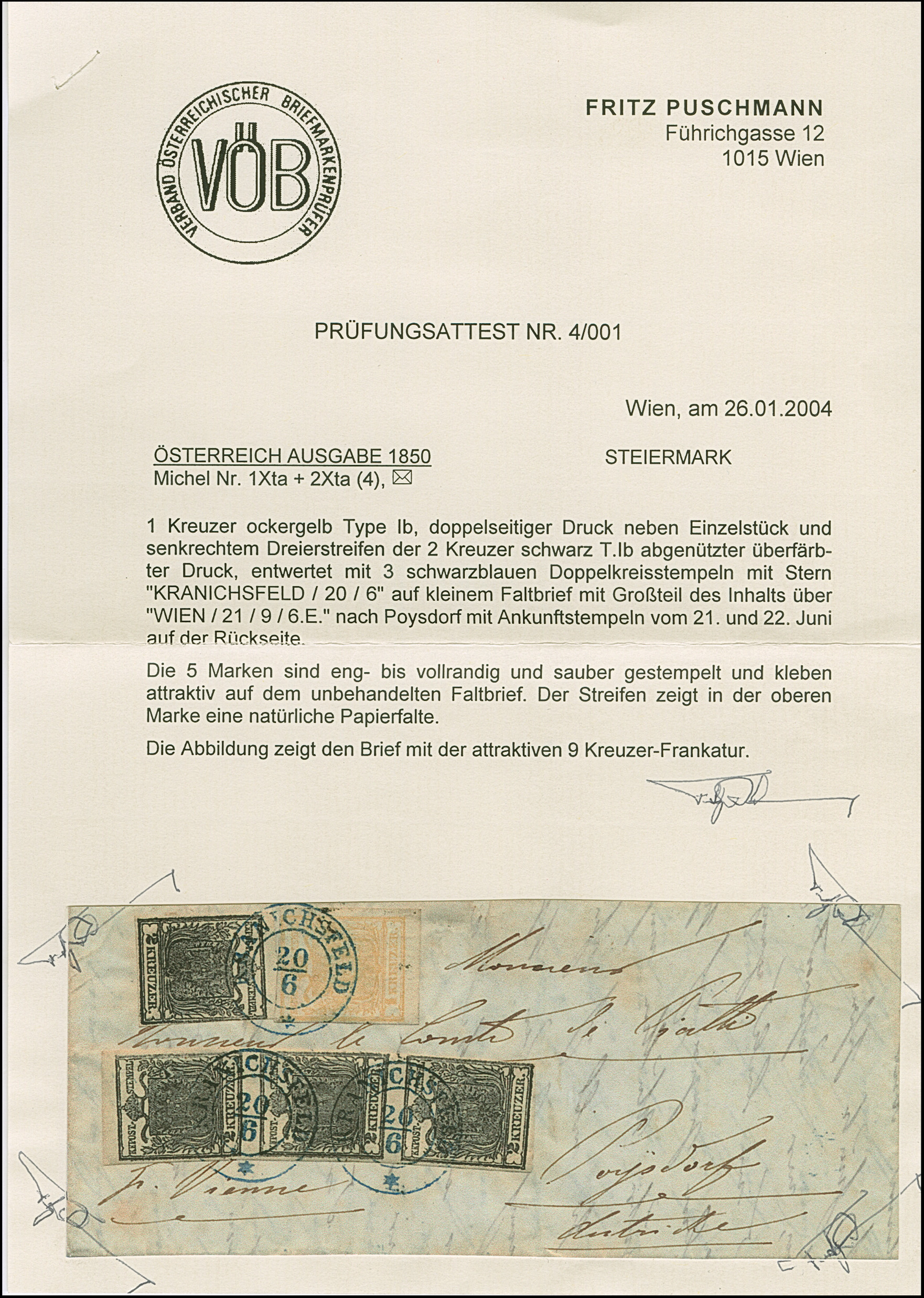 1850, 1 Kr. ockergelb, Type Ib mit Abart “Doppelseitiger Druck”, als Zufrankatur mit 2 Kr. schwarz Type Ib (senkrechter Dreierstreifen und zwei Einzelwerte), farbfrisch und allseits eng- bis vollrandig, sauber entwertet durch übergehend shwarzblauen DKr. “KRANICHSFELD 20 6” (1850) via Wien nach Poysdorf mit rückseitigem Ankunftstempel. Der Dreierstreifen mit natürlicher Papierfalte an der oberen Marke, der Faltbrief mit einem kleinem, unbedeutenden Einriss oben (entfernt von den Marken), sonst in sehr guter Erhaltung, Eine attraktive und seltene 9 Kreuzer Frankatur, Fotoattest Puschmann (2004)