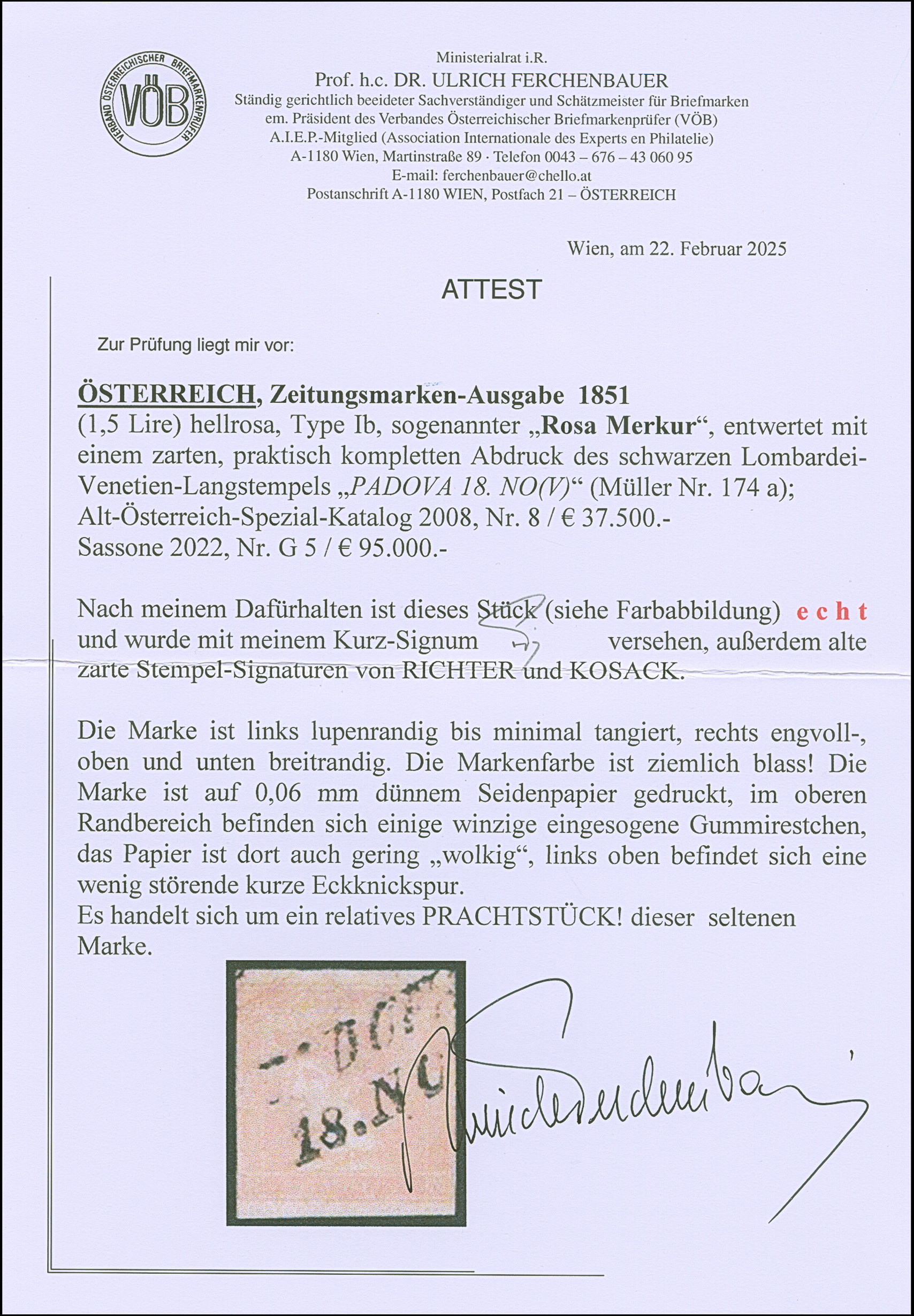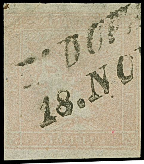1851, "Rosa Merkur" 6 Kr., Type Ib, üblich etwas blass, mit recht gut erkennbarem Markenbild, links winzig tangiert bis lupenrandig, rechts voll- und unten breitrandig geschnitten, sauber mit L2 “PADOVA 18 NO(V)” entwertet, winziger Eckbug, sonst ein sehr attraktives Stück und nicht repariertes Exemplar dieser beliebten klassischen Rarität, sign. Richter und Kosack sowie Fotoattest Ferchenbauer (2025)