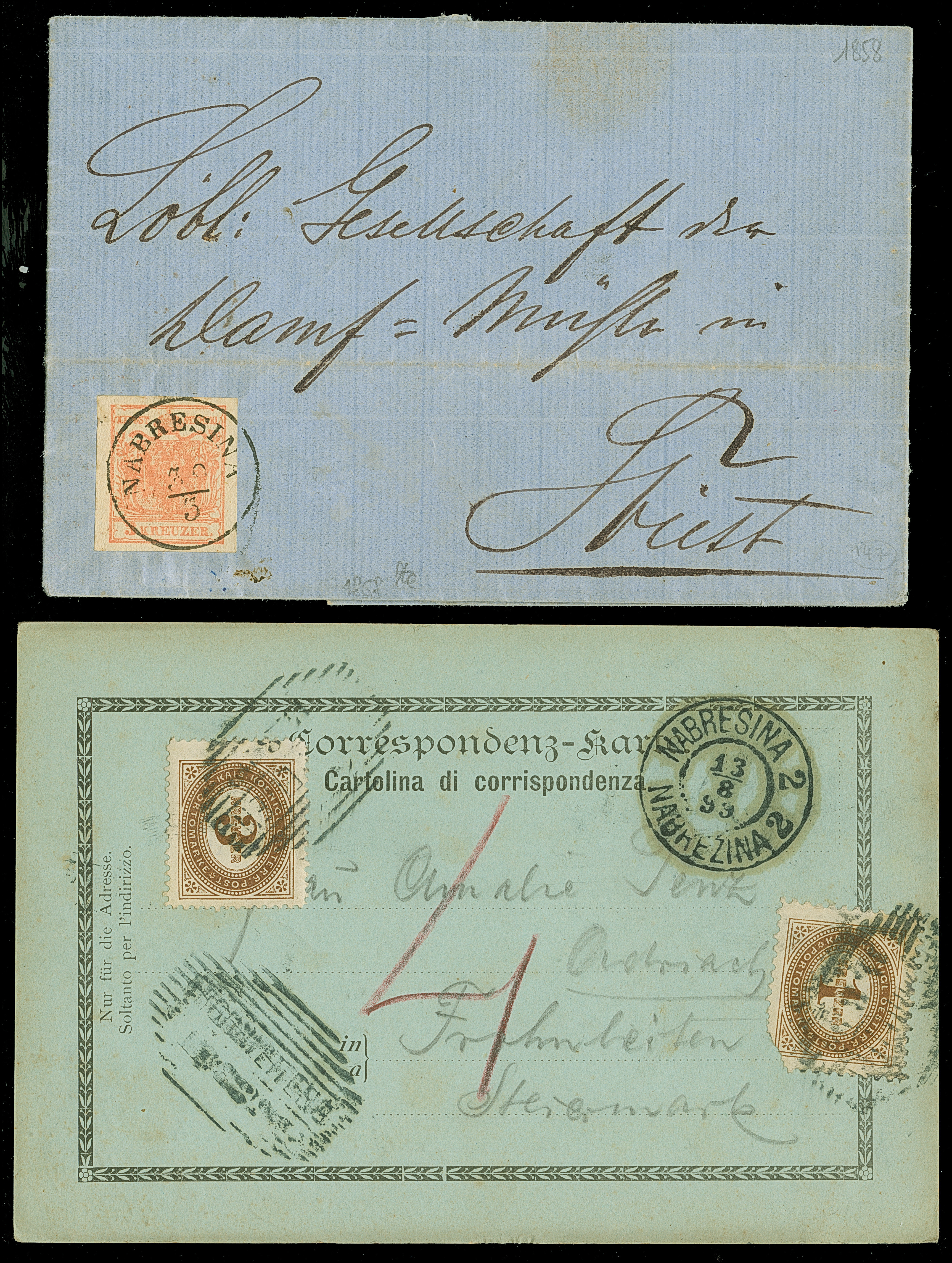 Wappen auf Maschinenpapier 3 Kr. rot, allseits breitrandig, sauber entwertet durch EKr. “NABRESINA 30-3” auf Faltbrief nach Triest mit rückseitigem Ankunftsstempel, innen datiert “30 märz 1858”, gute Erhaltung, sowie 1899 Ansichtkarte mit Portomarken. Eine sehr frühe Verwendung aus diesem Postamt an der Küste (Müller-Nr. 1782, offiziell am 31.7.1858 errichtet)