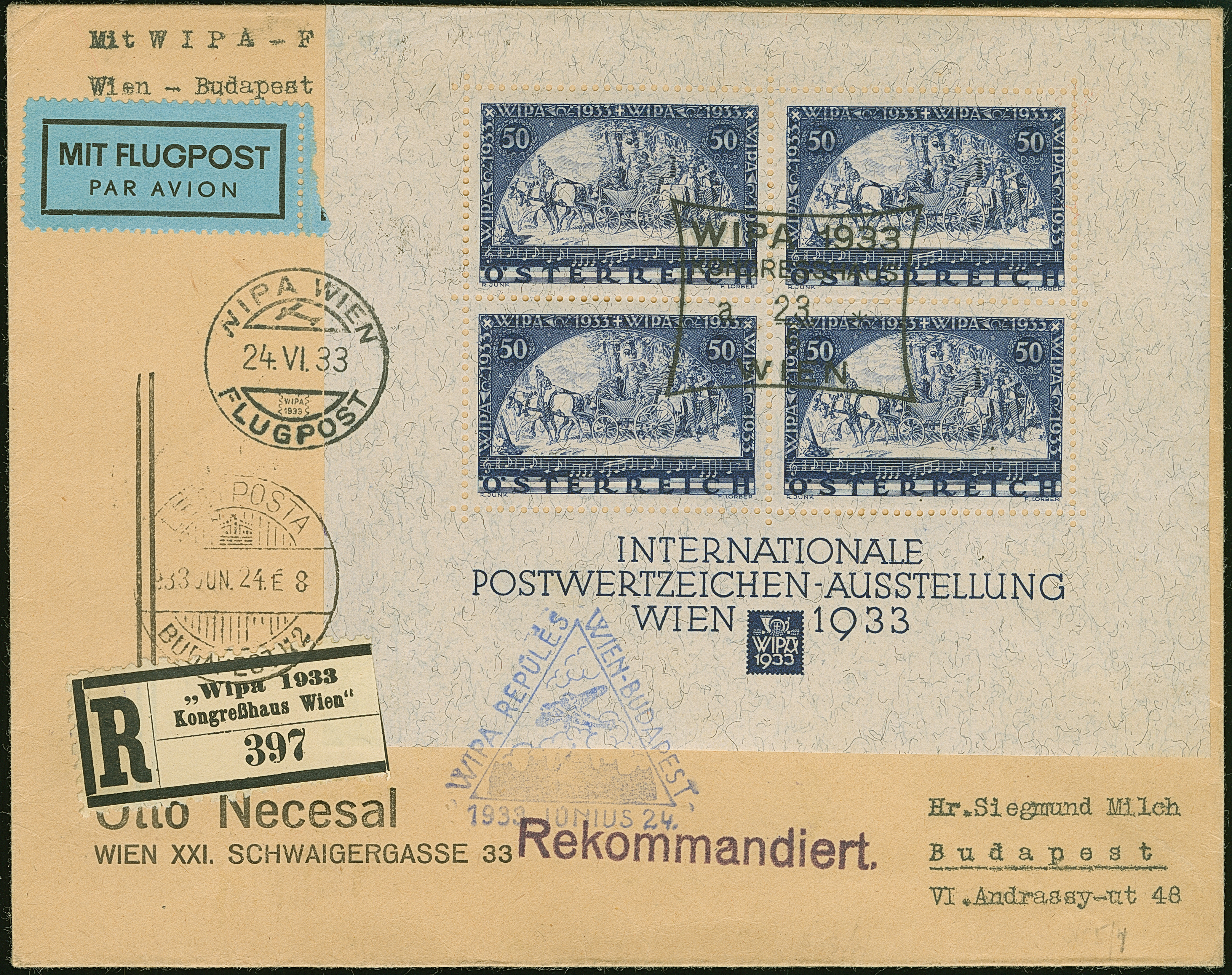 WIPA-Block (127:105 mm) mit Sstpl. "KONGRESSHAUS 23/6" auf kleinformatigem Luftpost-R-Brief mit 3 übergehenden Beförderungstempeln, nach Budapest mit Ankunftsstempeln. Im Blockrand kleine Knitterspuren, sonst einwandfrei.