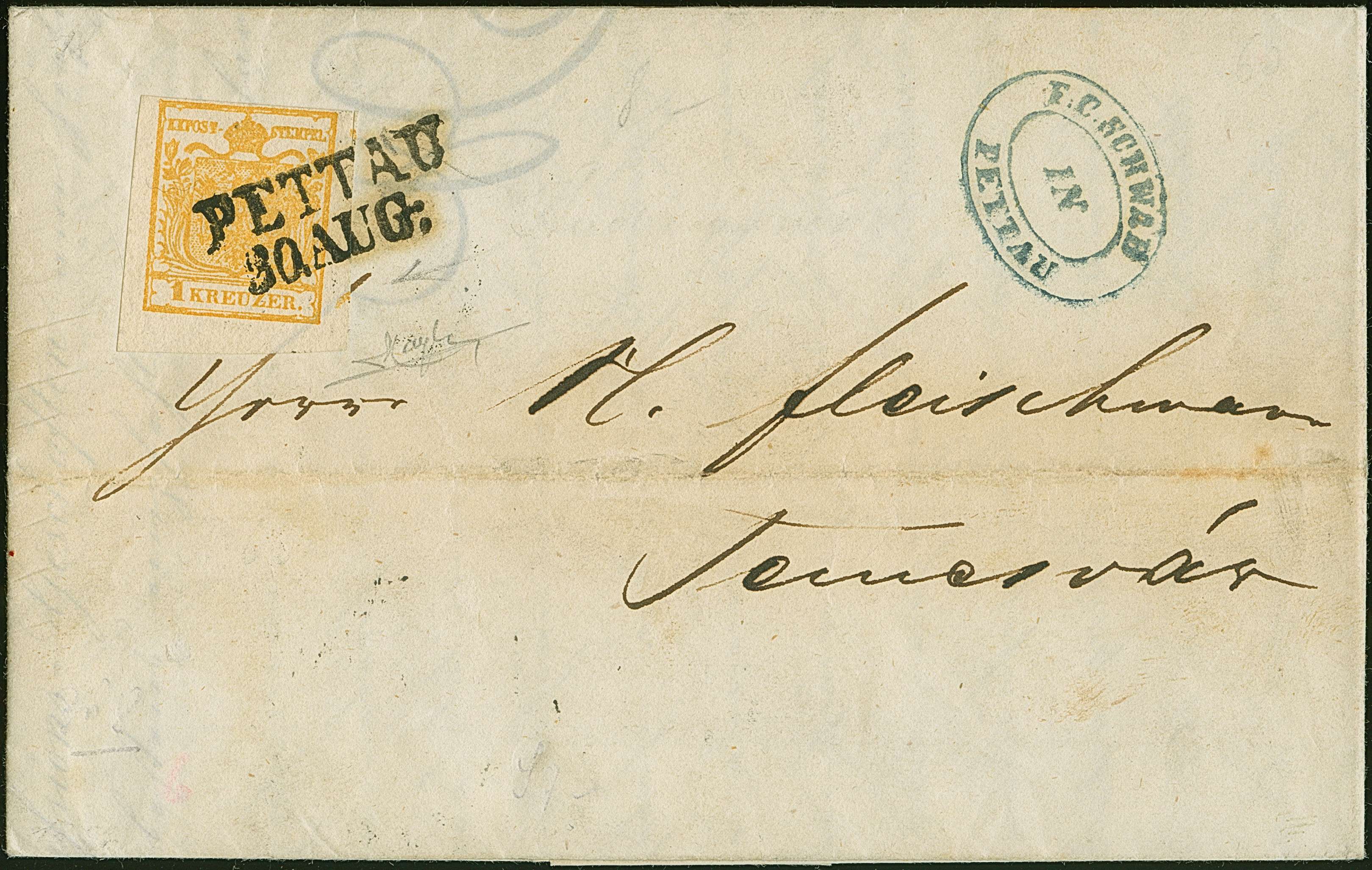 1850, Wappen auf Handpapier 1 Kr. gelbocker, farbrisch und gut bis breitrandig, mit klarem L2 “PETTAU 30 AUG.” auf Drucksache nach Temesvar mit rückseitigem Transit via Pest und Ankunftsstempel 3 September, innen datiert “1 September 1852”; der Beleg minimal getönt, sonst in sehr guter Erhaltung, signiert Raybaudi