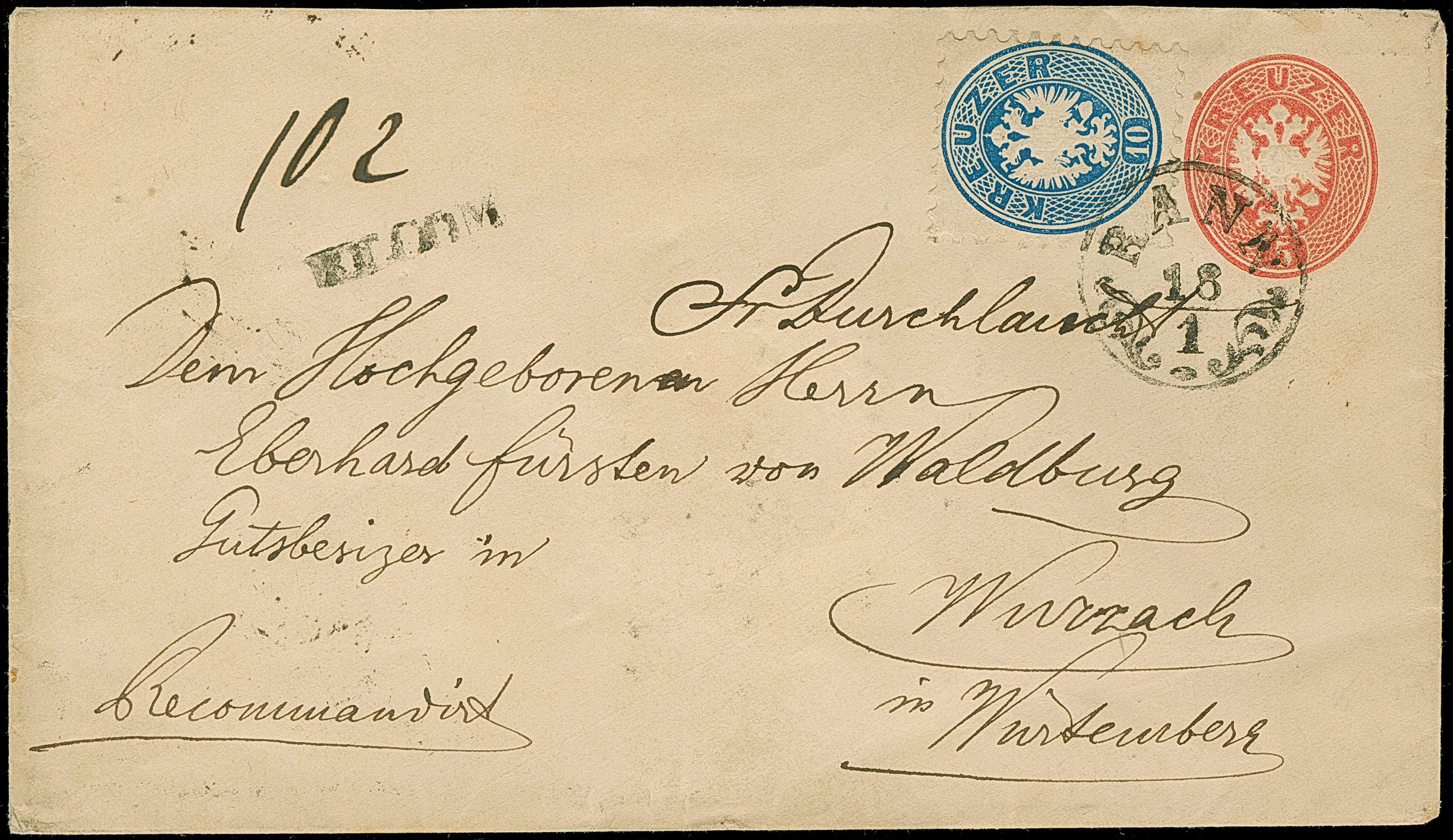 10 Kr. blau, zwei Einzelwerte, beide farbfrisch und gut gezähnt, als Zufrankatur auf Ganzsachenumschlag 5 Kr. rosa als rekommandierter Brief von “RANN 18-1” via Wien nach Wurzach in Würtemberg mit rückseitigem Transit und Ankunftstempel, ein Zahnspitz leicht getönt, sonst in sehr schöner Gesamterhaltung