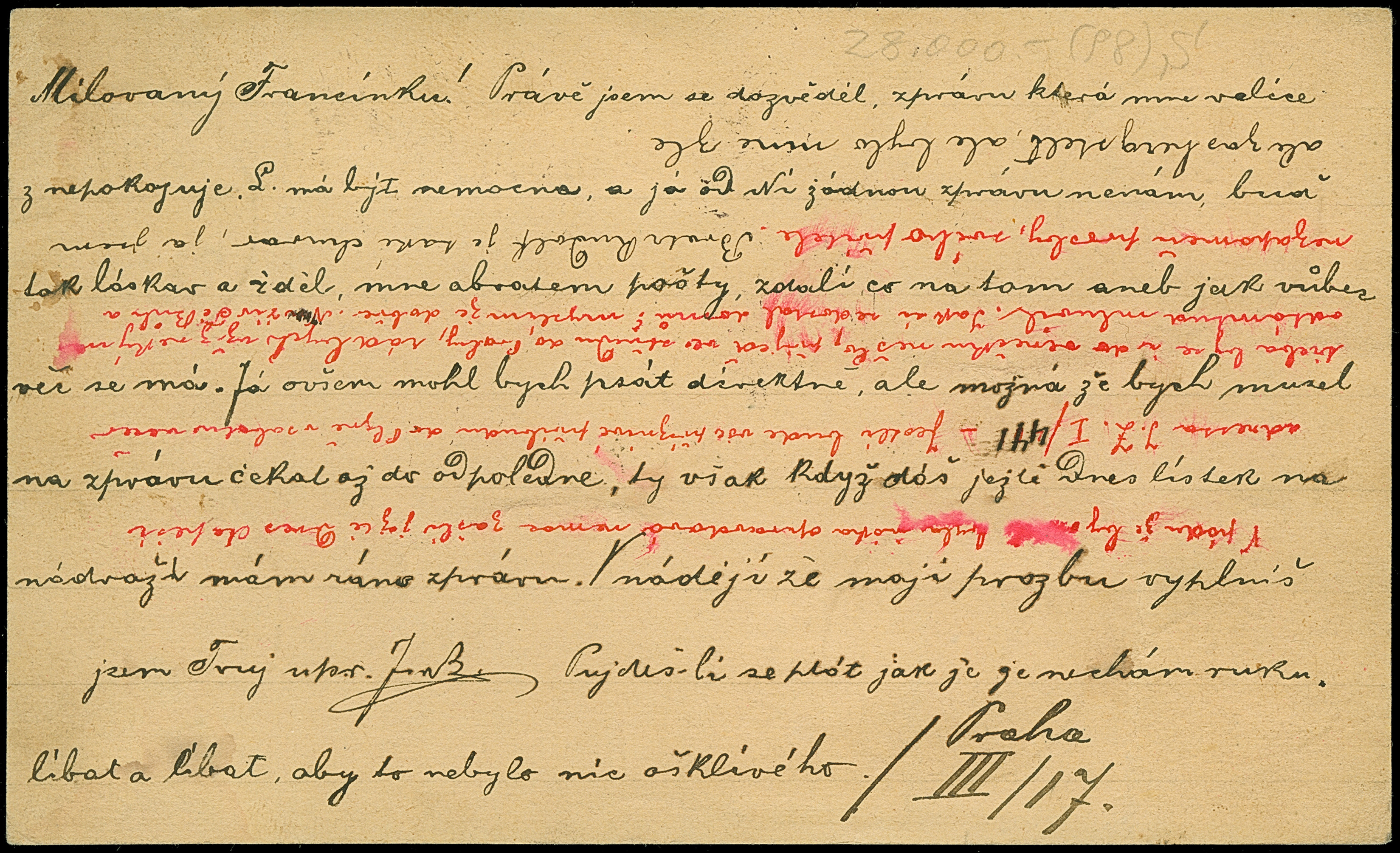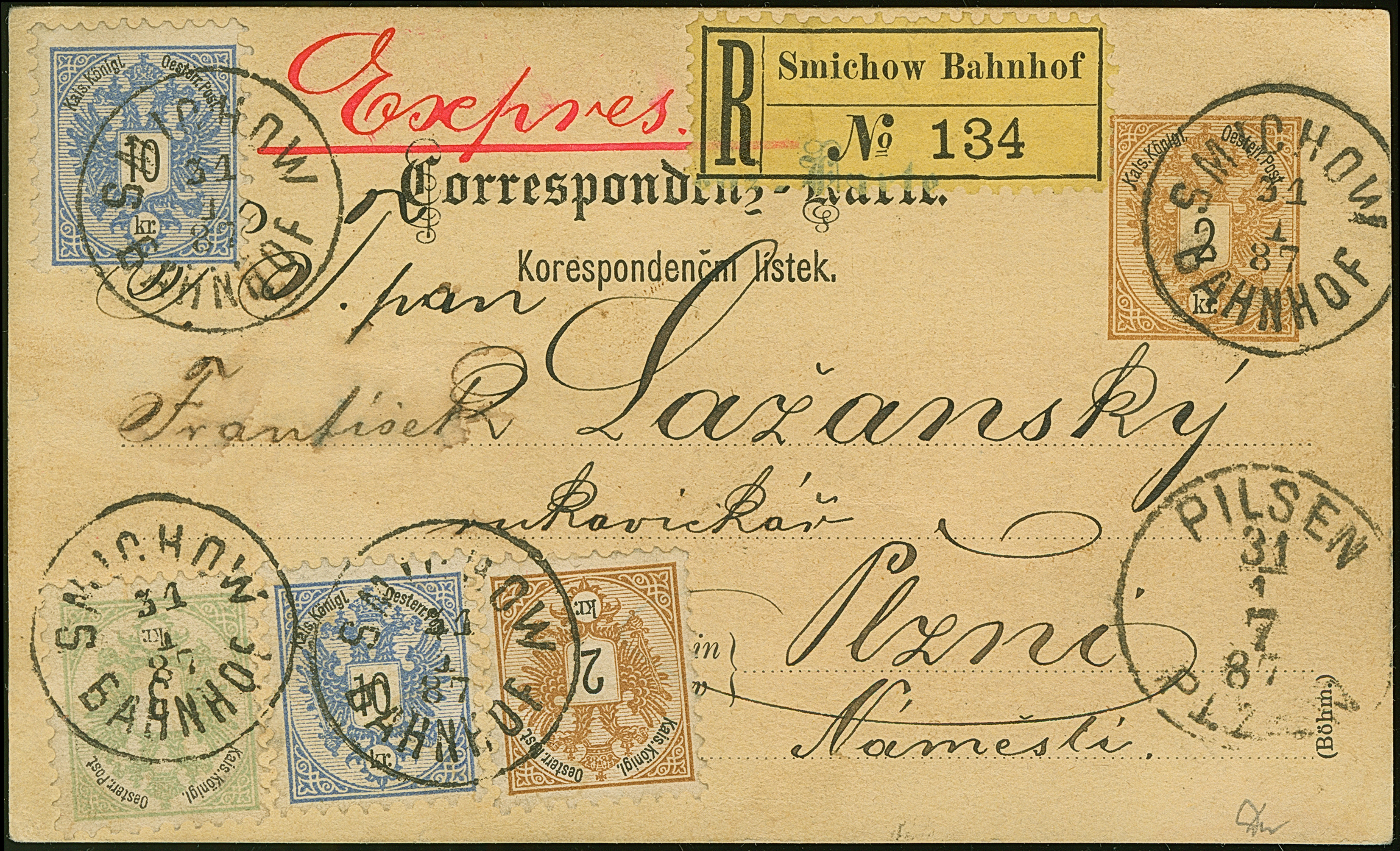 2 Kr. hellockerbraun/schwarz, 3 Kr. mattgrün/schwarz und 10 Kr. mittelviolettultramarin/schwarz (zwei Einzelwerte) als Zufrankatur auf Ganzsachenkarte 2 Kr. braun als eingeschriebene Eilbotenkarte von “SMICHOW BAHNHOF 31 1 87" nach Pilsen mit nebengesetztem Ankunftsstempel, eine seltene Verwendung in einwandfreier Erhaltung