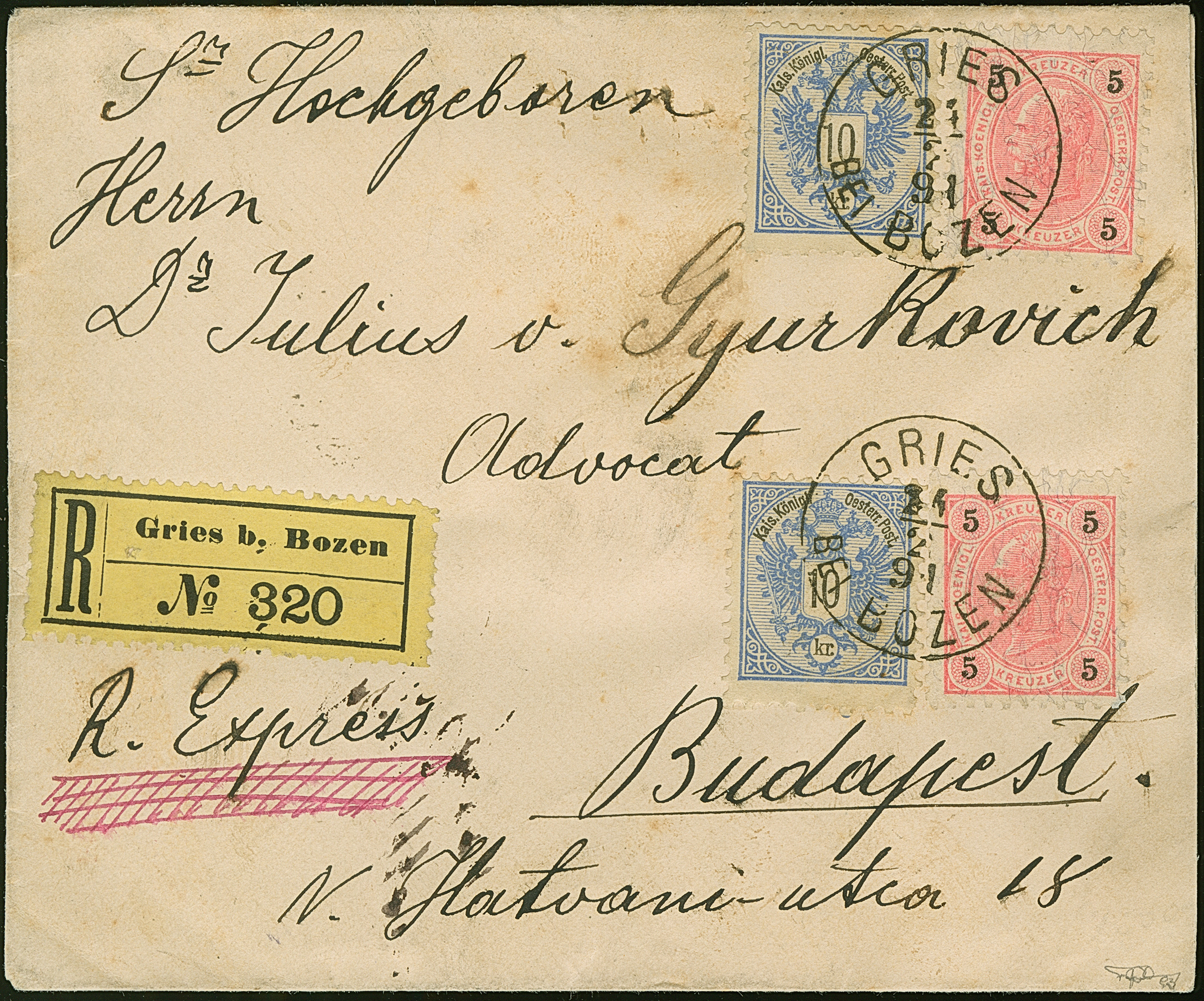 10 Kr. mittelviolettultramarin/schwarz (zwei Einzelwerte) als Zufrankatur mit 5 Kr. mittelkarmin/schwarz (2) auf eingeschriebenem Eilboten-Brief Brief von “GRIES BEI BOZEN 21 2 91" nach Budapest, die Frankatur zum Teil minimal getönt, sonst gute Erhaltung, selten