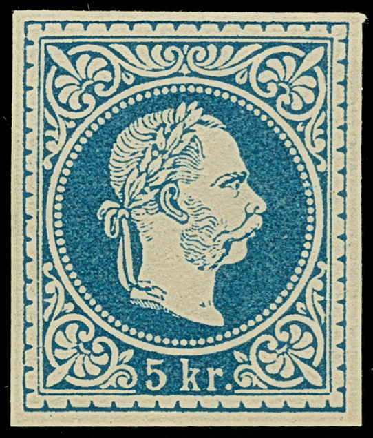 1867, Probedruck Franz Joseph 5 Kr. blau, ungezähnter Einzelabzug in blau auf dünnem, ungummierten Papier, tadellos, selten, Fotoattest Soecknick BPP (2015)
