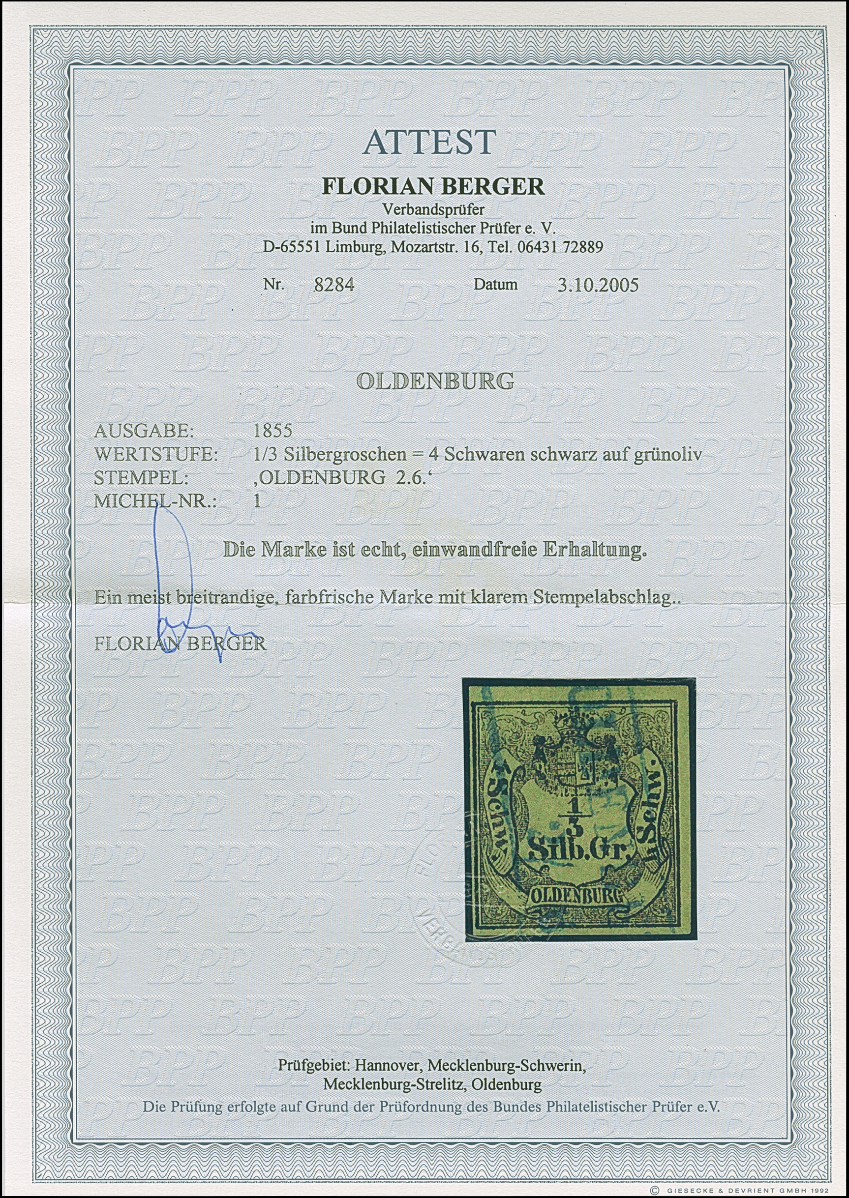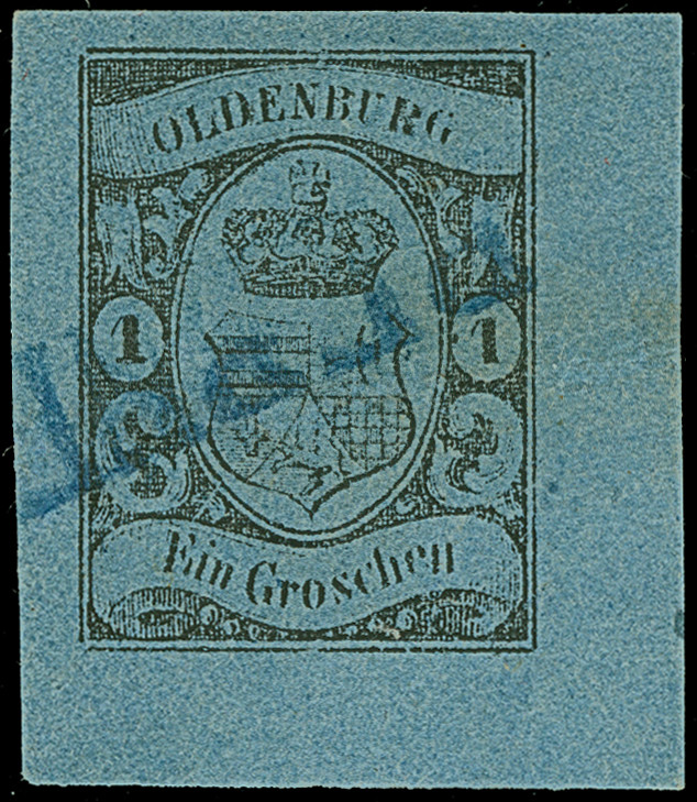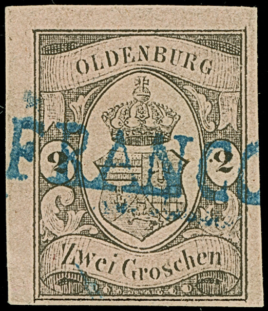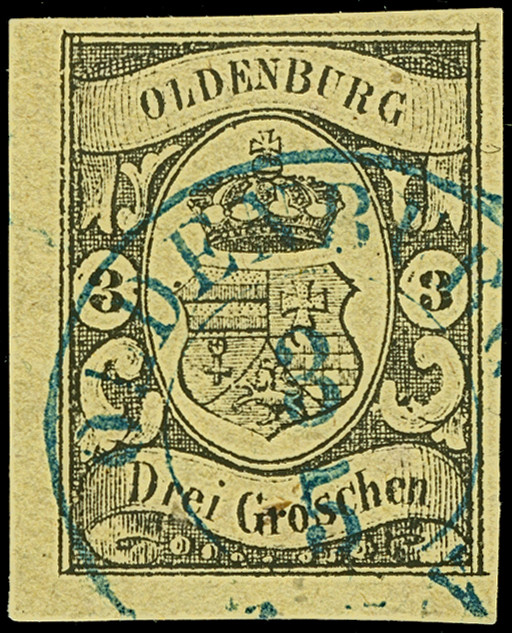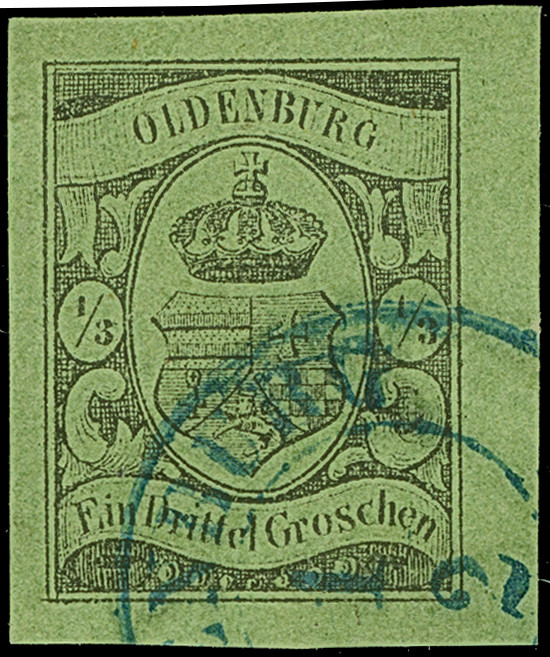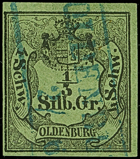 ⅓ Gr. auf grünlicholiv, farbfrisch und allseits breit- bis sehr breitrandig mit blauem DKr. “OLDENBURG 1.2.”. Die farbfrische Marke hat eine minimale helle Stelle bzw. eine Papierpore und oben im Rand einen natürlichen Papiereinschluss, ansonsten in einwandfreier Erhaltung. Ein optisch sehr ansprechendes Exemplar dieser gestempelt seltenen Marke, Fotoattest Brettl A.I.E.P. (2015)
