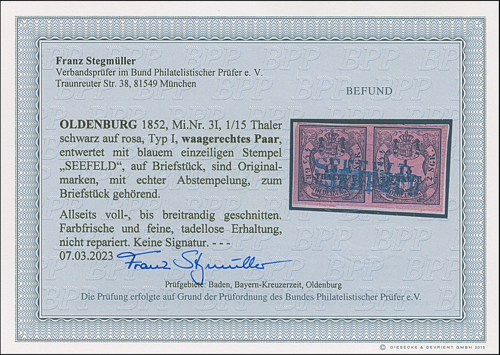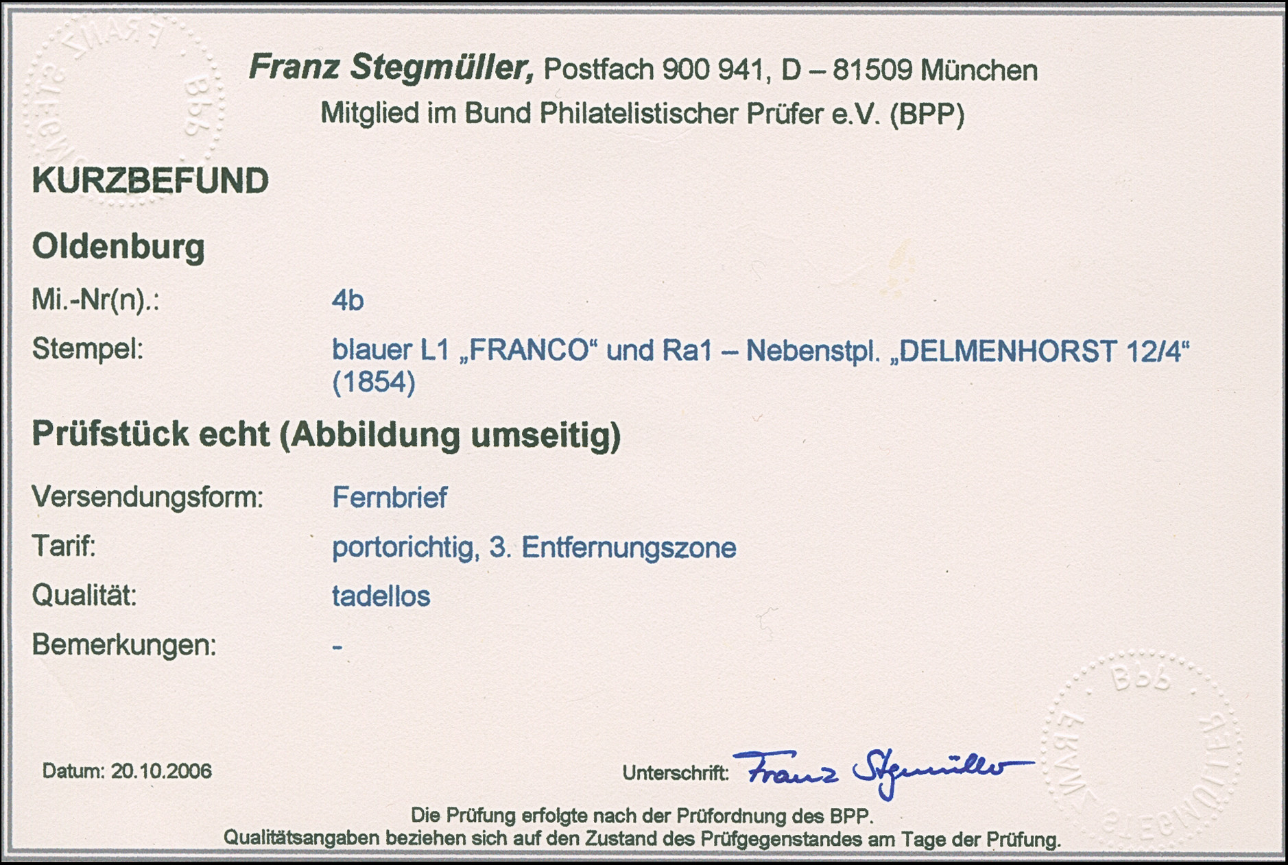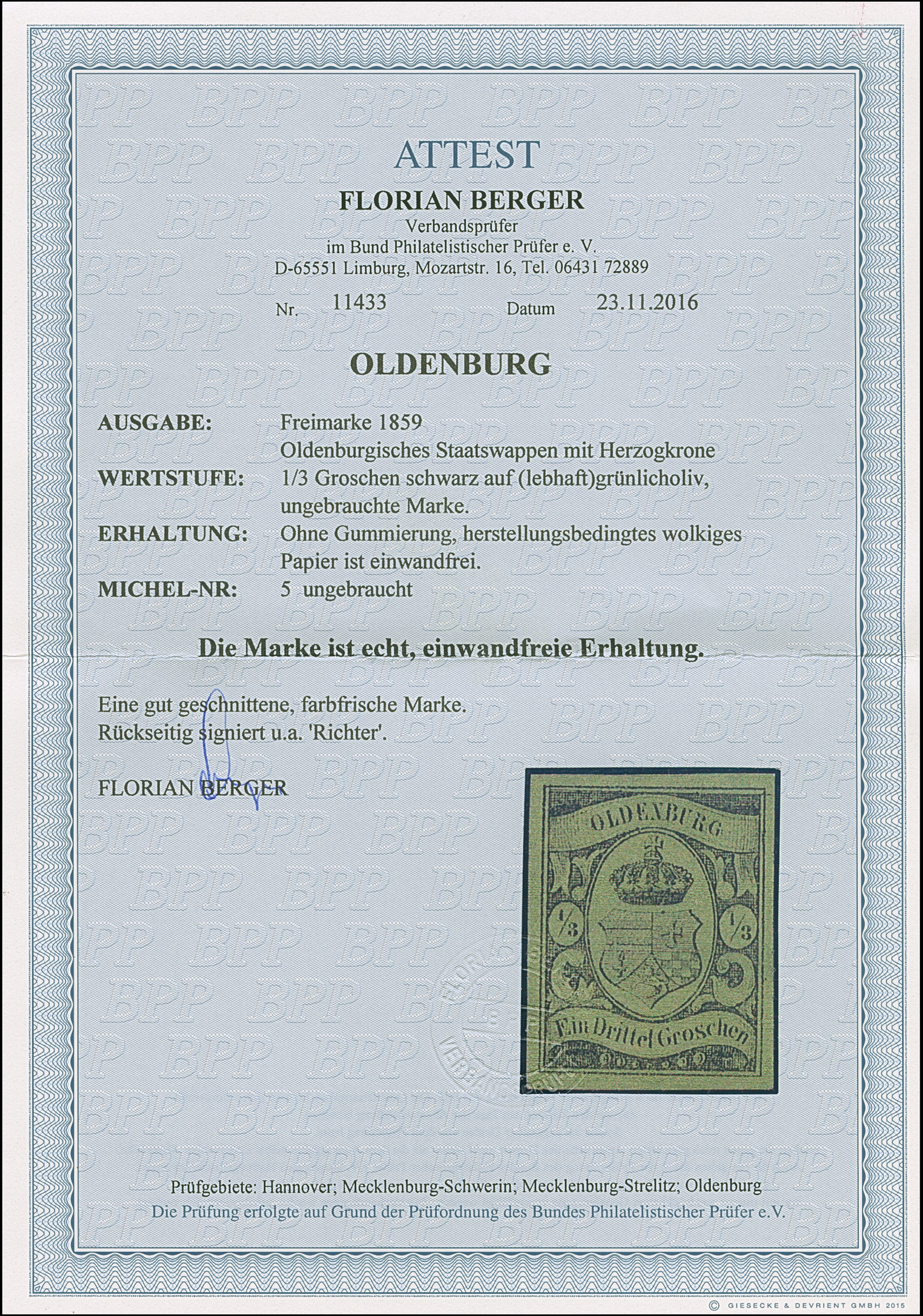 ⅓ Gr. auf grünlicholiv, farbfrisch und allseits breit- bis sehr breitrandig mit blauem DKr. “OLDENBURG 1.2.”. Die farbfrische Marke hat eine minimale helle Stelle bzw. eine Papierpore und oben im Rand einen natürlichen Papiereinschluss, ansonsten in einwandfreier Erhaltung. Ein optisch sehr ansprechendes Exemplar dieser gestempelt seltenen Marke, Fotoattest Brettl A.I.E.P. (2015)