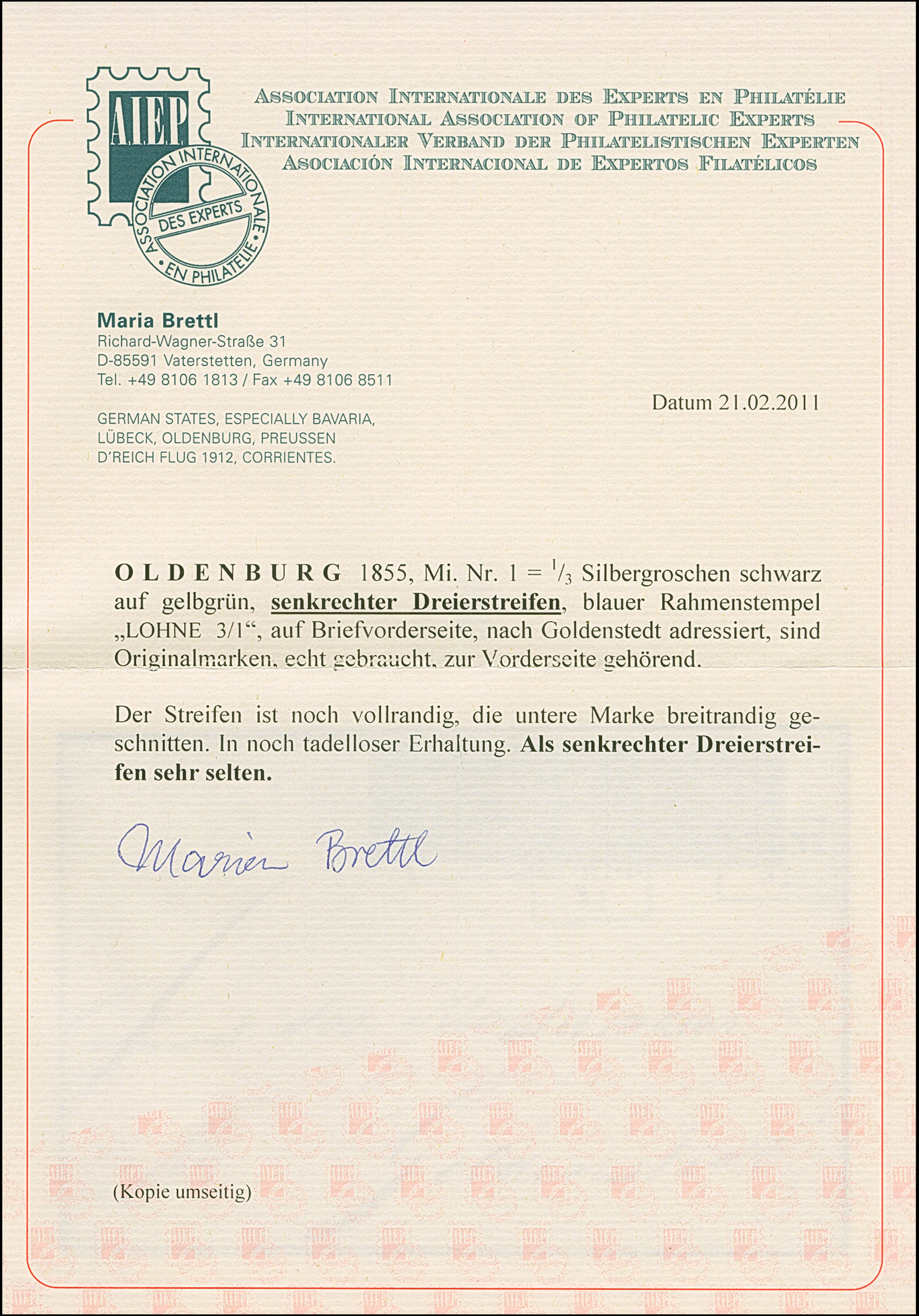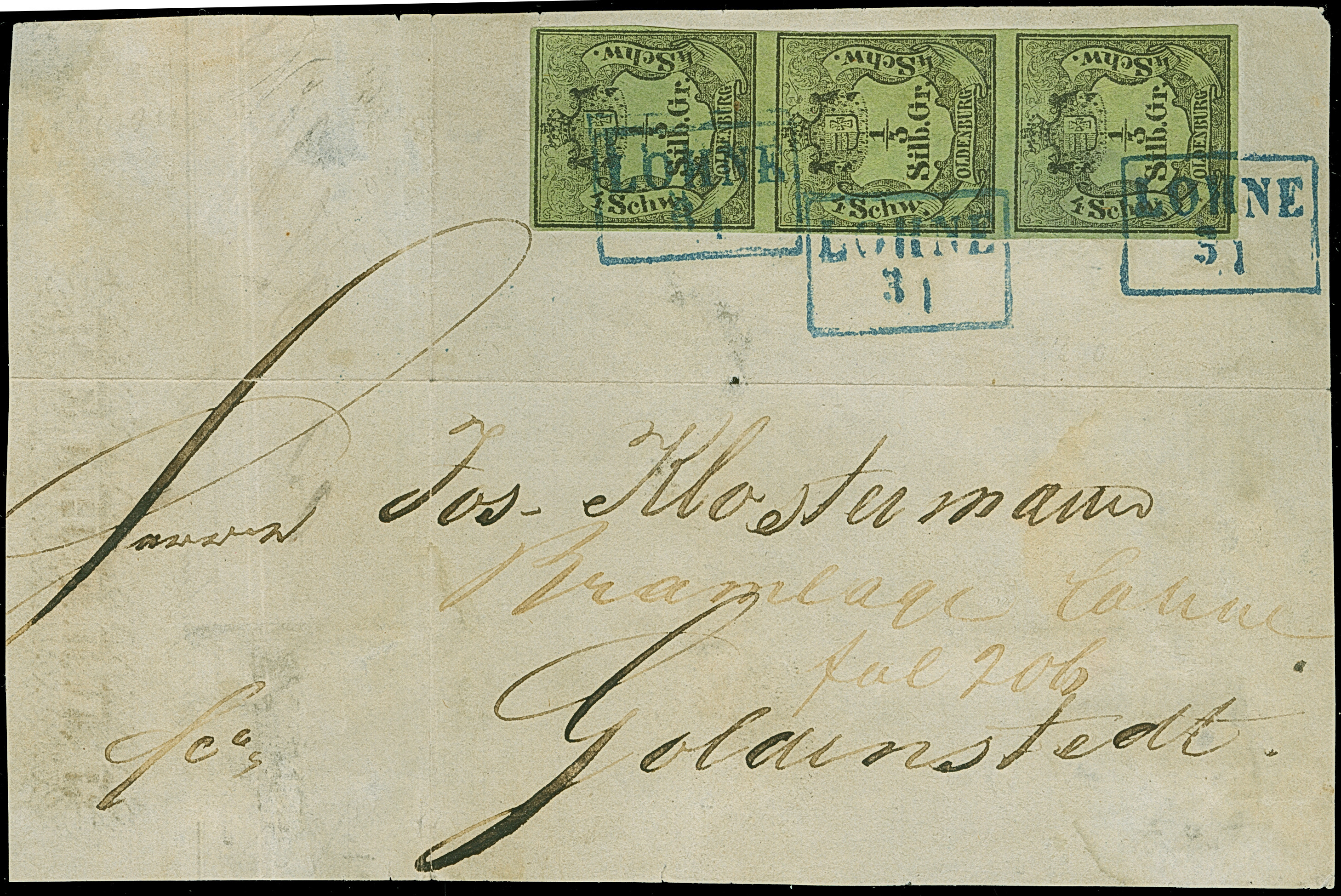 ⅓ Sgr. auf grün im senkrechten Dreierstreifen je mit klarem blauem Rahmenstempel “LOHNE 3.1.” auf Briefvorderseite nach Goldenstedt. Die farbfrische Einheit ist rechts zum Teil etwas knapp geschnitten, ansonsten allseits voll- bis breitrandig und in einwandfreier Erhaltung. Die senkrechten Dreierstreifen dieser Marke sind viel seltener als waagerechte, bisher sind nur ganz wenige Einheiten in dieser Art bekannt, Fotoattest Brettl A.I.E.P. (2011)