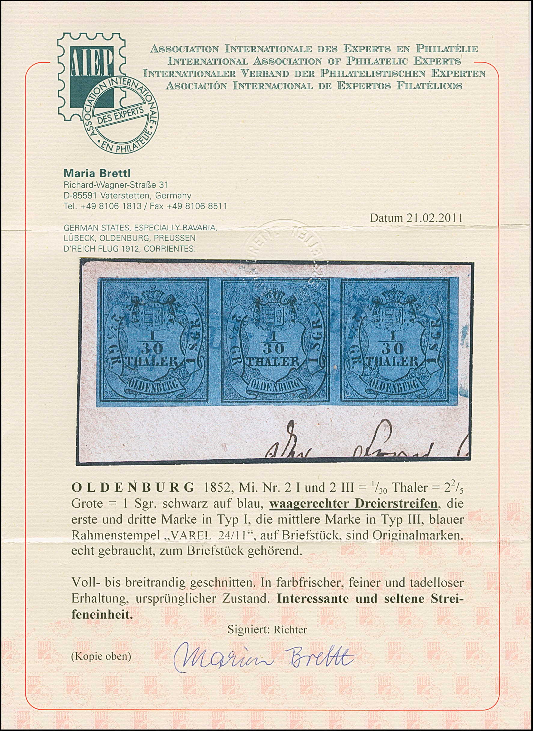 1/30 Th. auf blau im waagerechten Dreierstreifen mit blauem Rahmenstempel “VAREL 24.11” auf Briefstück. Die farbfrische Einheit ist voll- bis breitrandig geschnitten, die linke und die rechte Marke ist in Type I, die mittlere Marke in Type III. Ein nicht häufiger Dreierstreifen mit Typenpaar I+III, Fotoattest Brettl A.I.E.P. (2011)