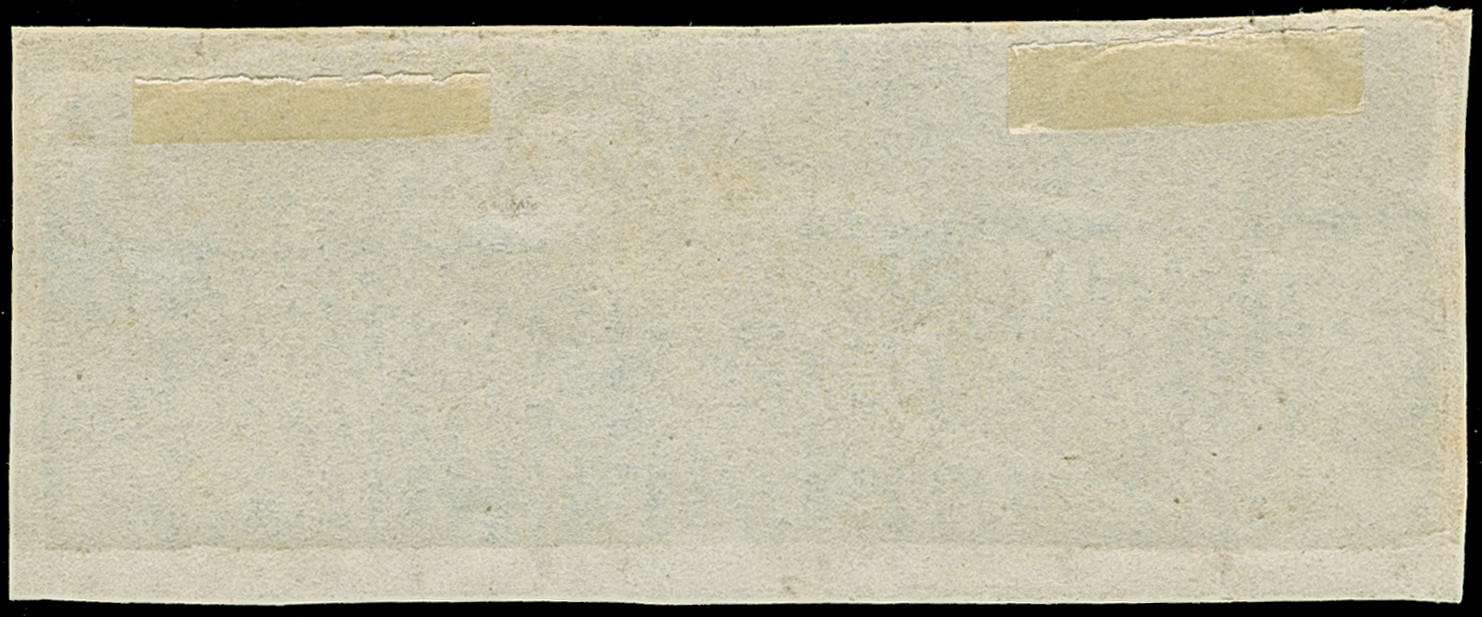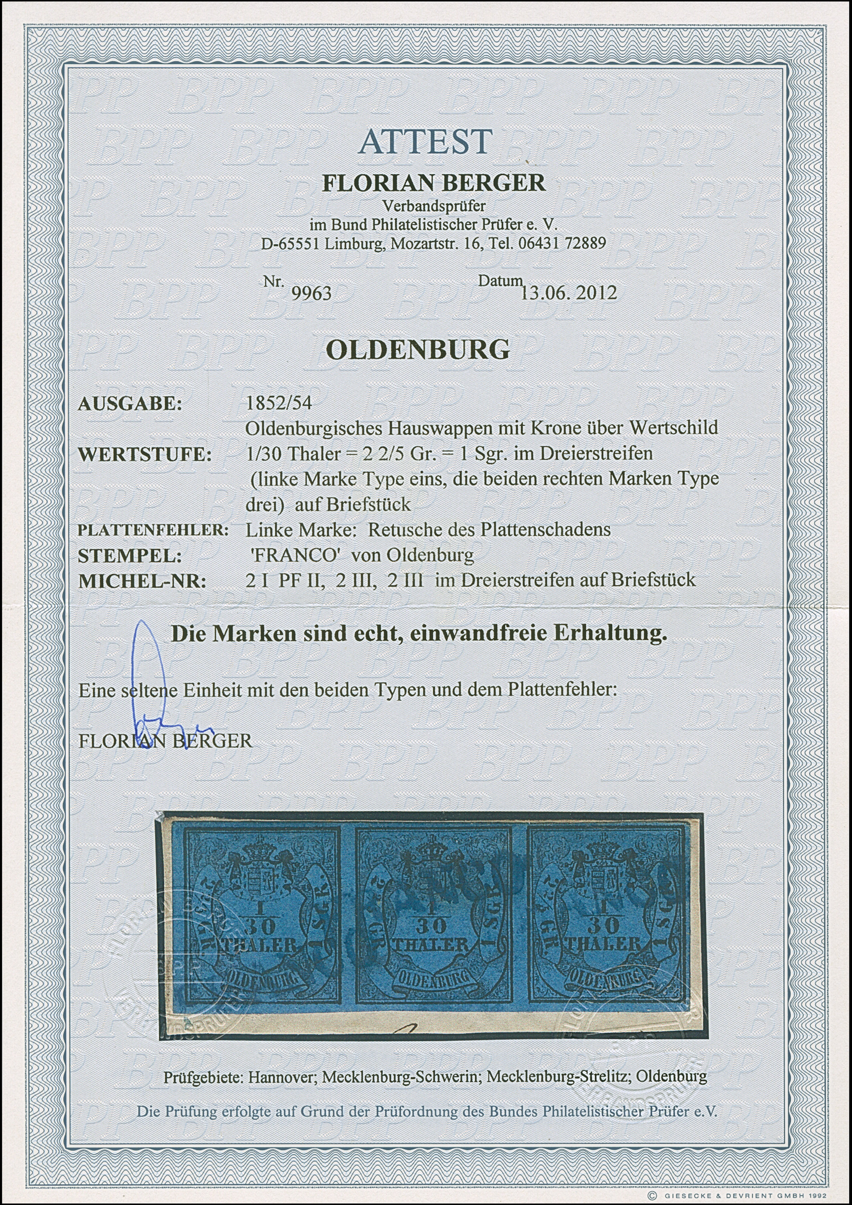 1/30 Th. auf blau, in Type I mit Plattenfehler “Retusche des Plattenschaden” im waagerechten Dreierstreifen mit zwei Marken in Type III, sauber mit blauem L1 “FRANCO” auf Briefstücke. Die farbfrische Einheit ist allseits voll- bis breitrandig geschnitten und in einwandfreier Erhaltung. Eine seltene Einheit mit Plattenfehler und Typenpaar, Fotoattest Berger BPP (2012)