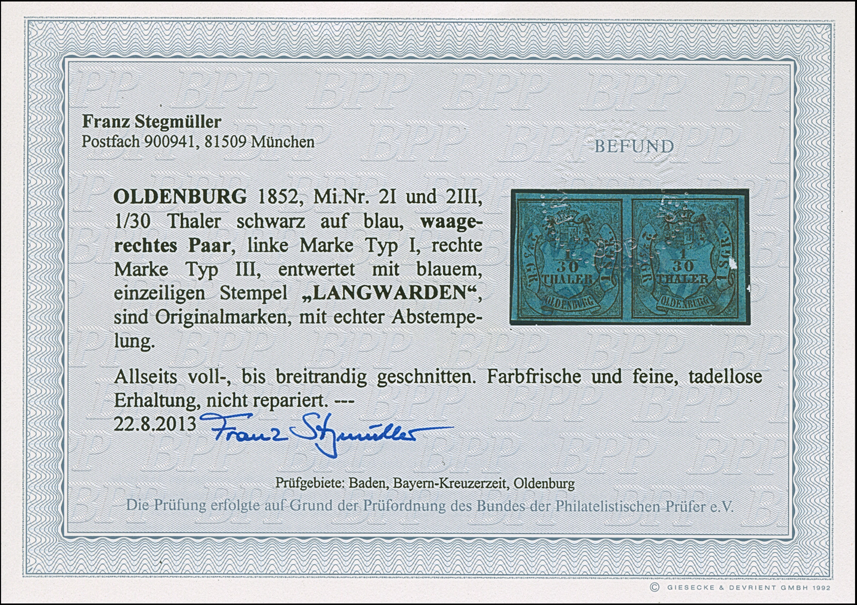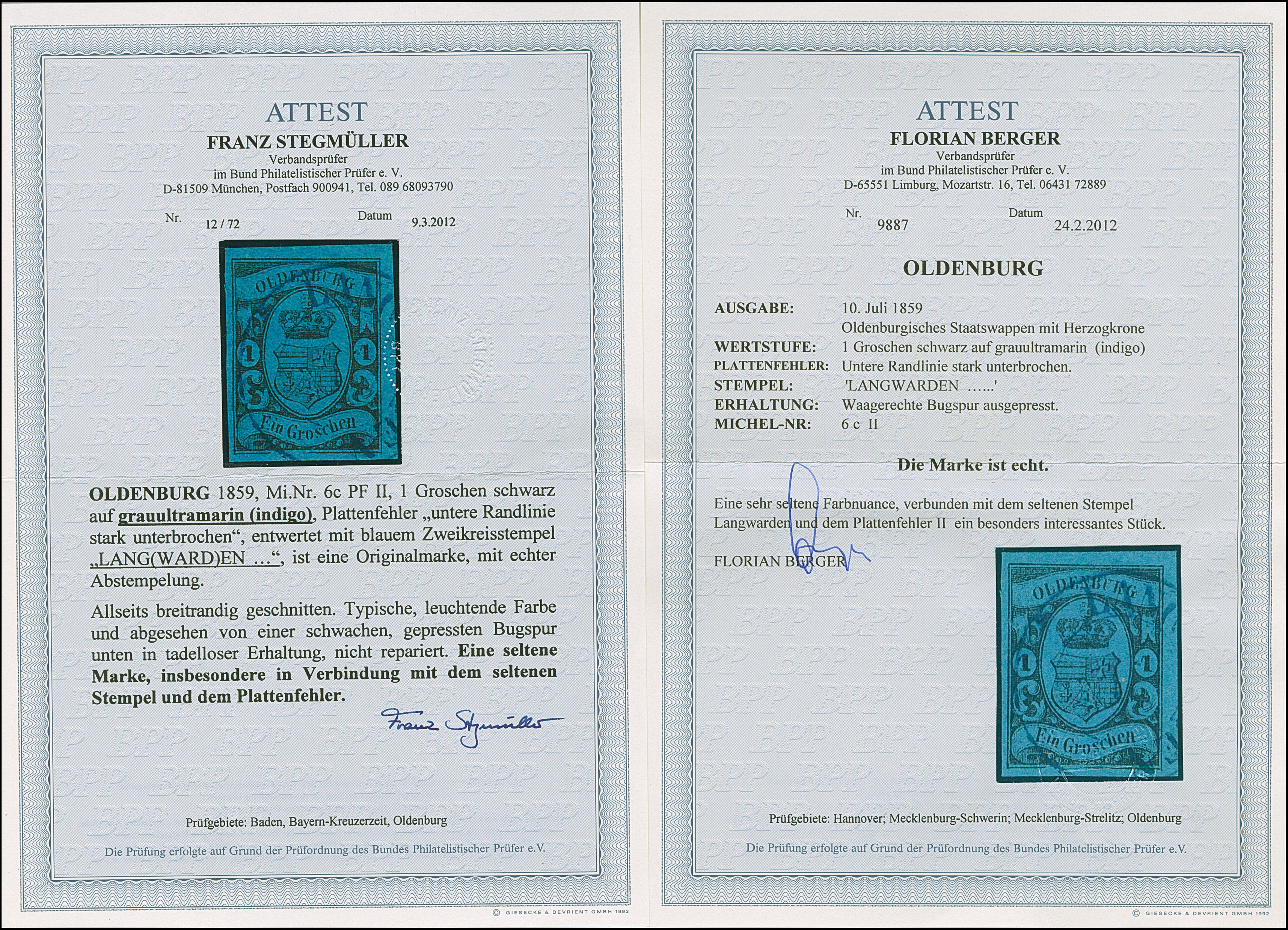 1 Gr. auf indigo, typische leuchtende und farbfrische Marke, allseits breitrandig mit Plattenfehler “untere Randlinie stark unterbrochen”, sauber mit blauem DKr. “LANG(WARD)EN”. Bis auf eine schwache, gepresste und praktisch nicht sichtbare Bugspur unten in tadelloser Erhaltung. Ein schönes Exemplar mit dieser sehr seltenen Farbe und besserer Entwertung. In Verbindung mit dem Plattenfehler hat ProFi kein weiteres Exemplar registriert, eine große Oldenburg-Seltenheit, Fotoattest Berger BPP (2012) und Stegmüller BPP (2012)