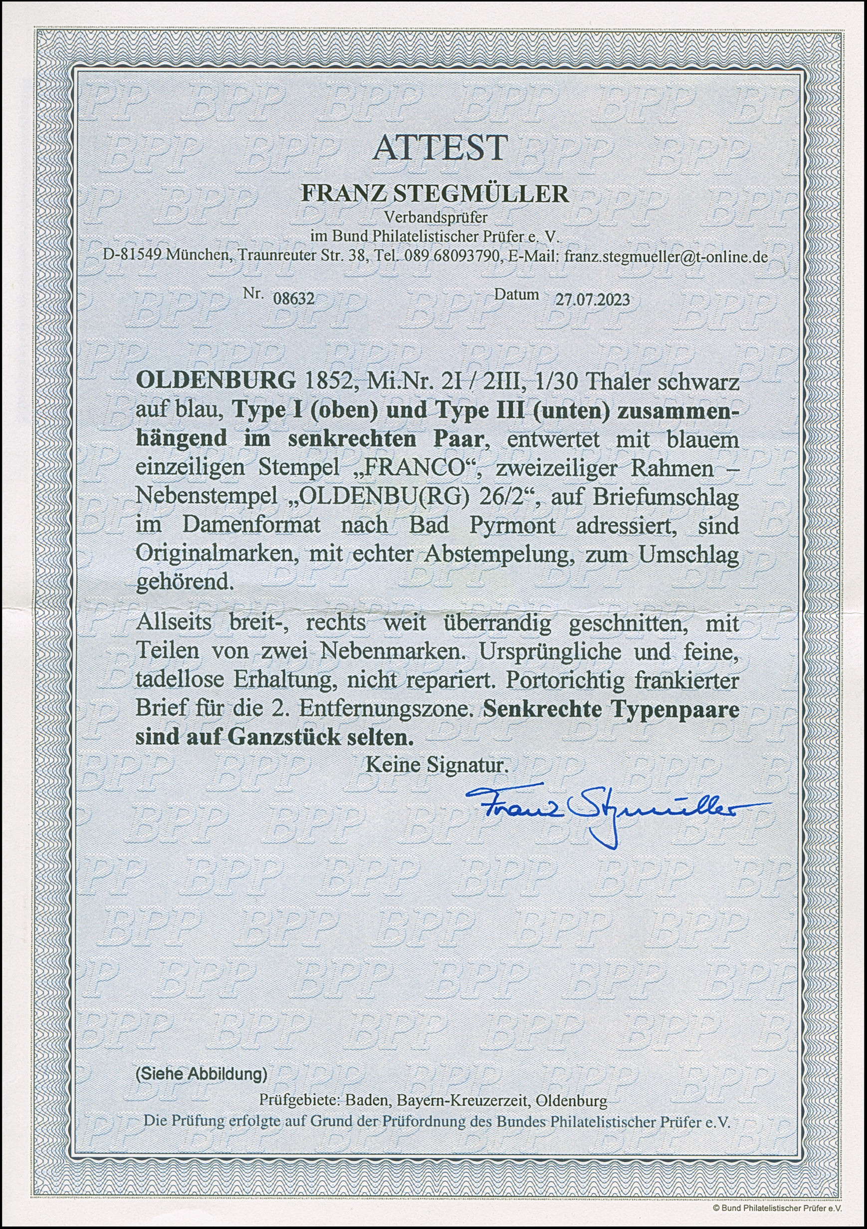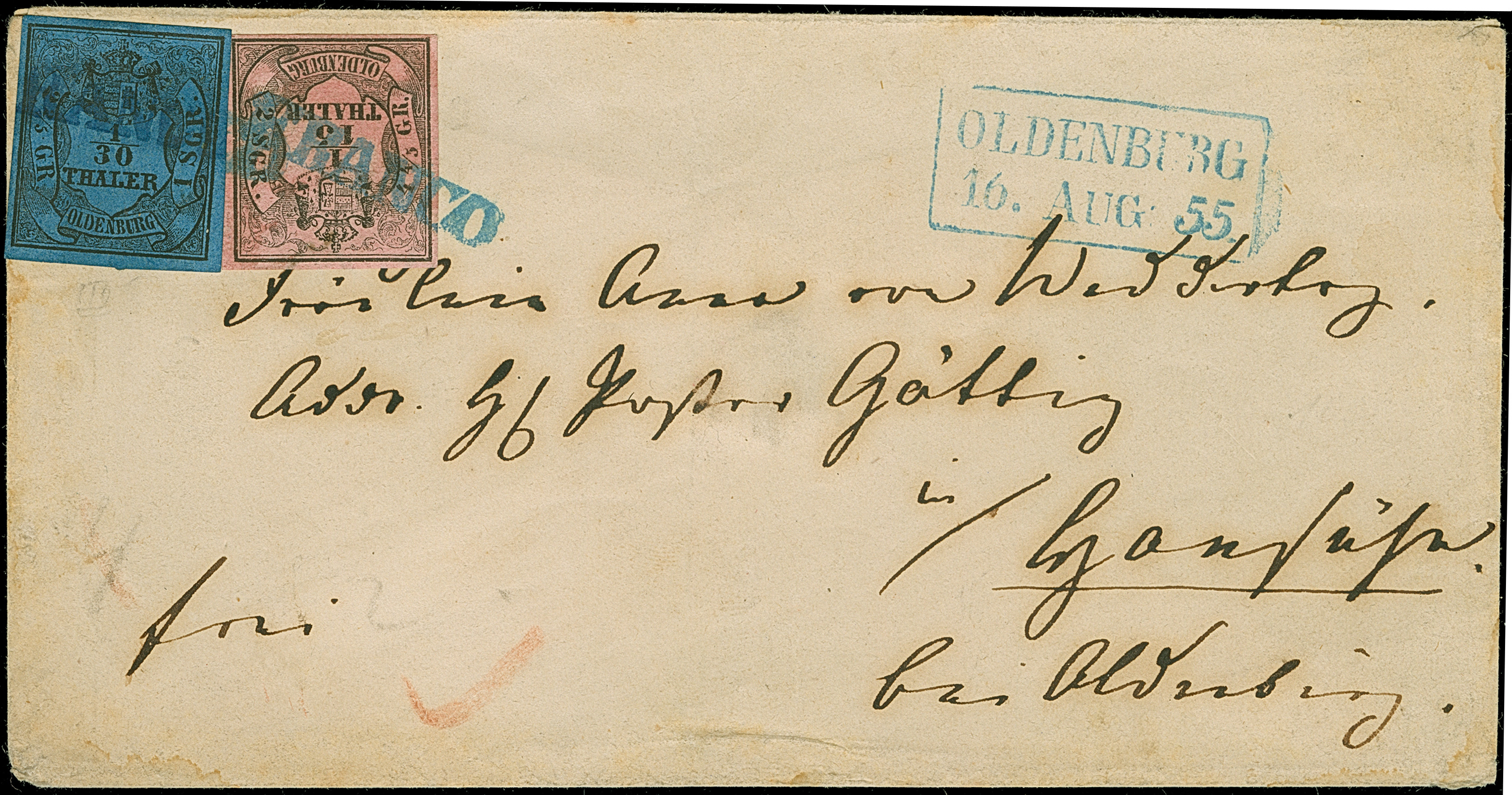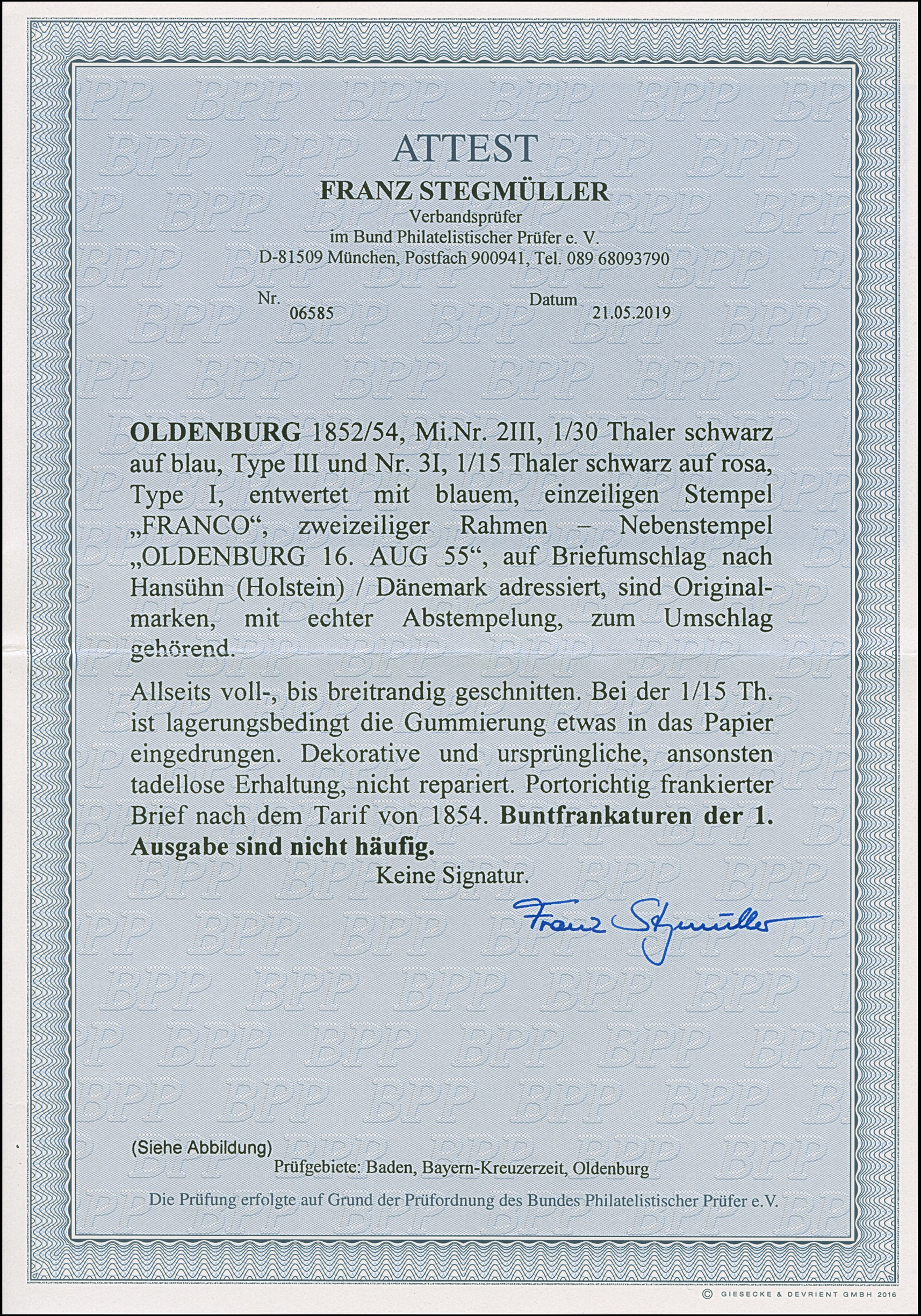 1/30 Th. auf blau, Type III und 1/15 Th. auf rosa in Type I, jeweils voll- bis breitrandig mit blauem L1 “FRANCO” als tarifgerechte Frankatur auf Briefkuvert mit blauem Rahmenstempel “OLDENBURG 16.AUG.55” via Hamburg nach Hansühn (Holstein), Dänemark. Bei der 1/15 Th.-Marke ist die Gummierung etwas in das Papier eingedrungen, ansonsten sind die Marken und der Umschlag in einwandfreier Erhaltung. Eine dekorative Buntfrankatur der 1. Ausgabe mit Destination Dänemark, Fotoattest Stegmüller BPP (2019)