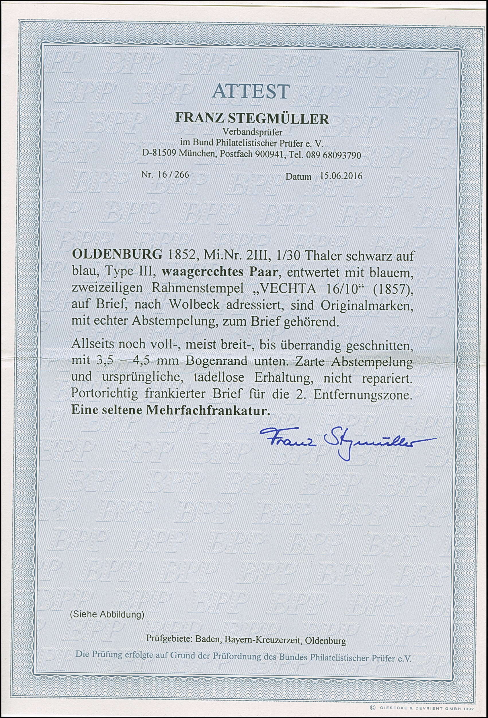 1/30 Th. auf blau in Type III im waagerechten Paar mit 3,5-4,5 mm Bogenrand unten, mit blauem Rahmenstempel “VECHTA 16.10.(57)" auf komplettem Faltbrief der 2. Entfernungsstufe nach Wolbeck mit rückseitigem Bahnpoststempel ”BERLIN 16.10.IV MINDEN". Das farbfrische Paar ist allseits voll- bis breitrandig geschnitten und links oben mit leichter Randklebung, in tadelloser Erhaltung. Ein dekoratives Paar mit Bogenrand auf Brief und seltene Mehrfachfrankatur, Fotoattest Stegmüller BPP (2016)
