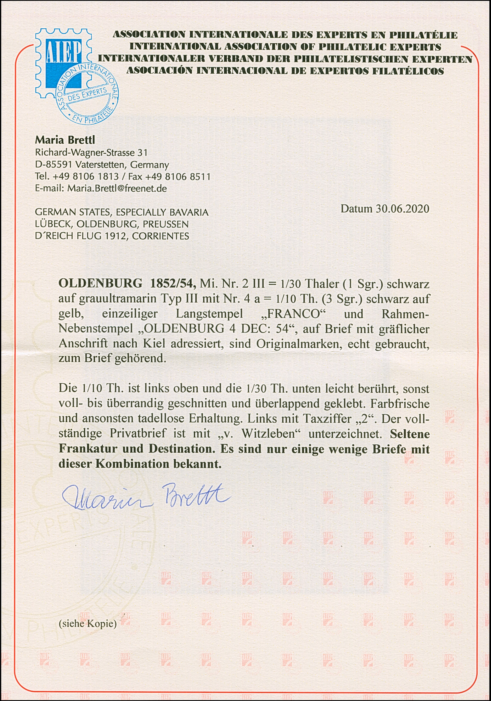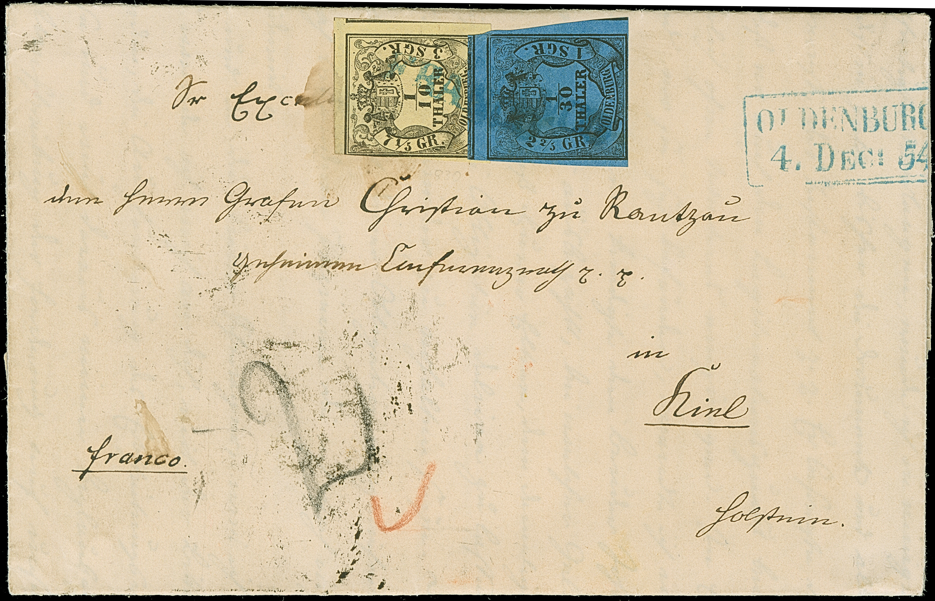1/30 Th. auf blau, Type III und 1/10 Th. auf gelb, mit blauem L1 “FRANCO" auf komplettem Faltbrief mit blauem Rahmenstempel “OLDENBURG 4.DEC.54” via Hamburg nach Kiel (Holstein), Dänemark. Das Porto betrug bis Hamburg 2 Sgr. und das Weiterfranko bis Kiel 2 Sgr., hier mit Tax-Vermerk “2” angegeben. Die farbfrischen Marken sind jeweils an einer Seite leicht berührt, ansonsten voll- bis sehr breitrandig geschnitten. Eine dekorative und in dieser Kombination seltene Buntfrankatur mit Fotoattest Brettl A.I.E.P- (2020)