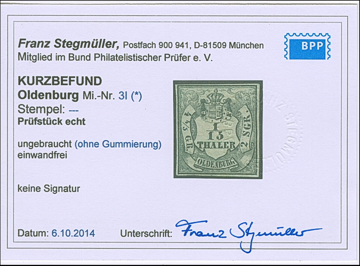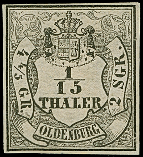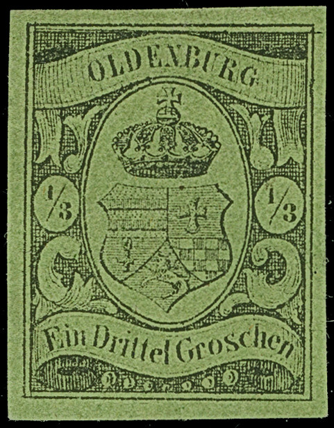 ⅓ Sgr. auf grün, farbfrisch, allseits voll- bis breitrandig, mit blauem Rahmenstempel “OLDENBURG 2.6.”, in einwandfreier Erhaltung, Fotoattest Berger BPP (2005)